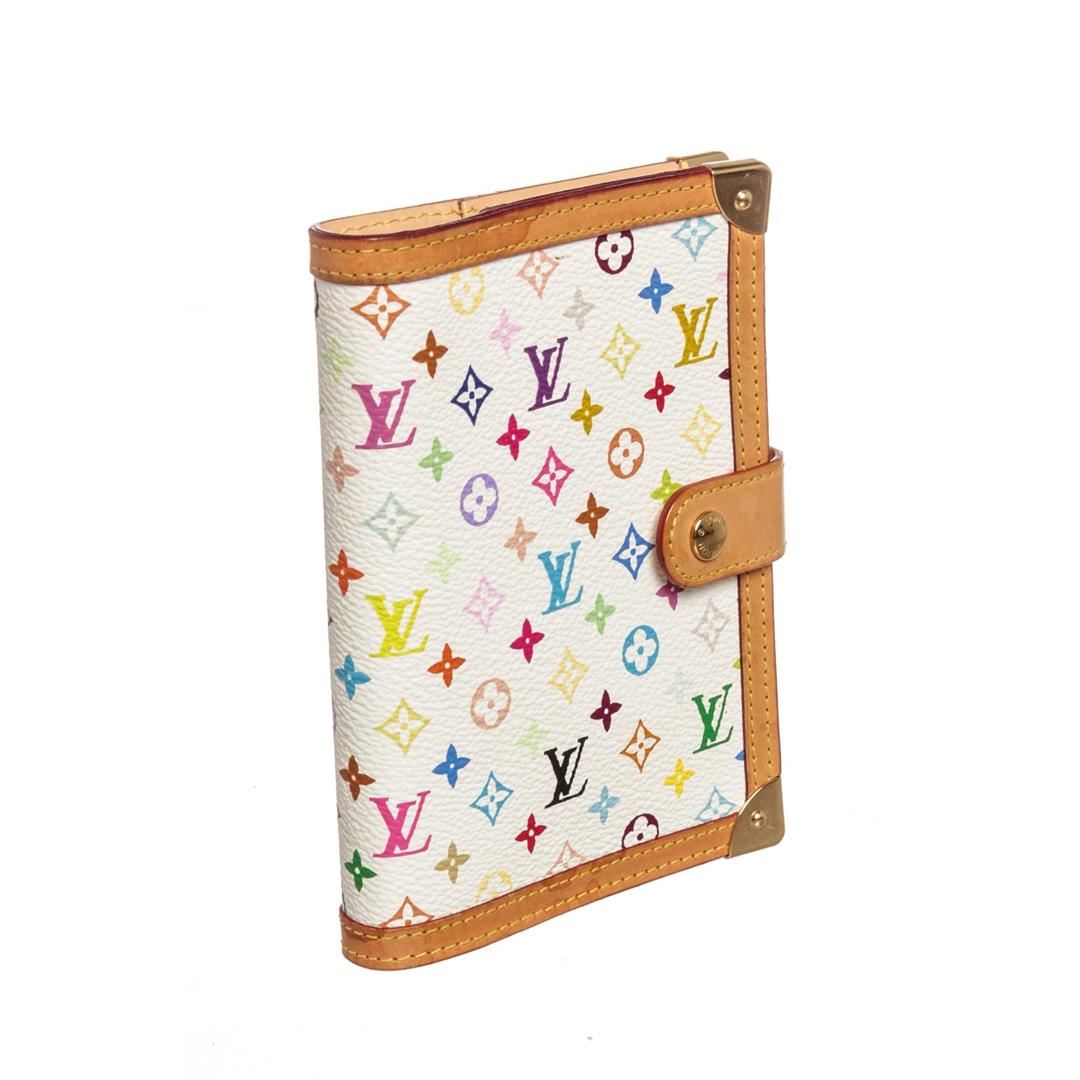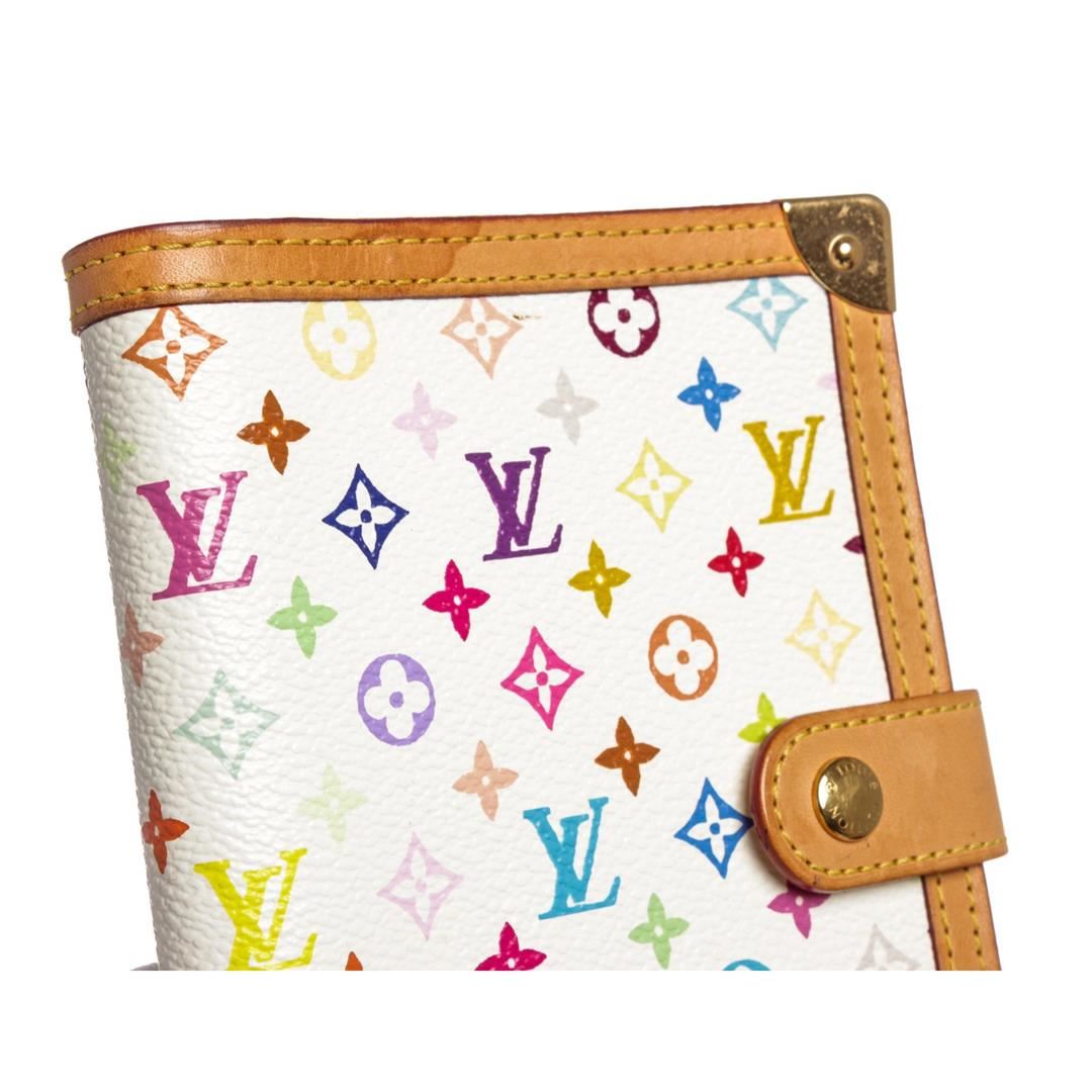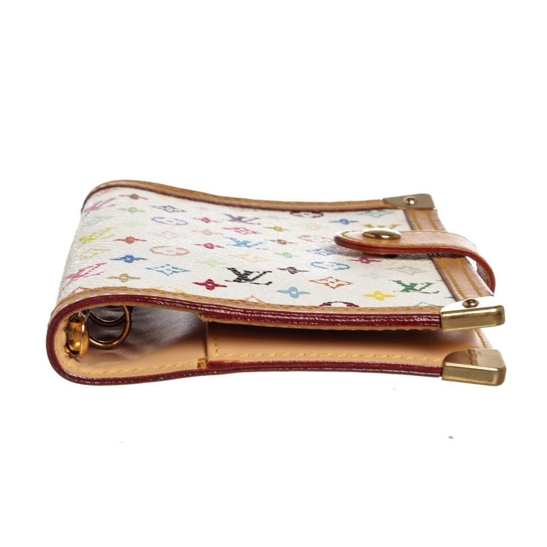 White monogram multicolore Louis Vuitton canvas leather mini with tan leather interior lining, three card slots, two side slip pockets and button snap closure. Authentic.