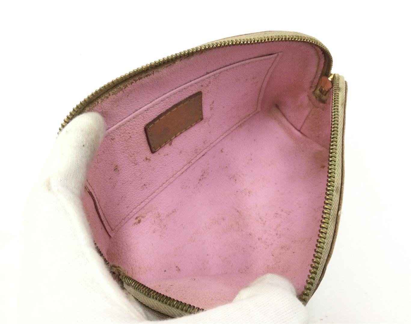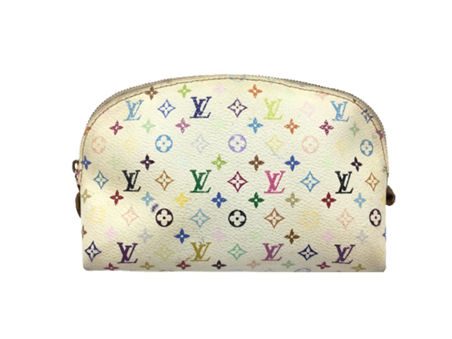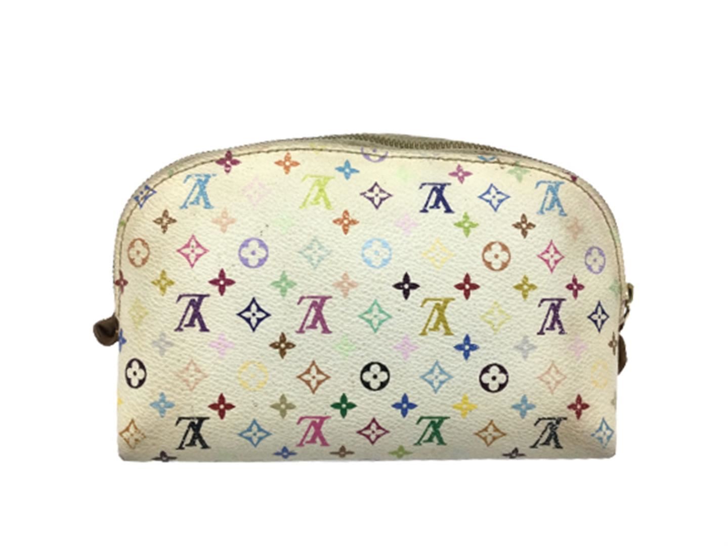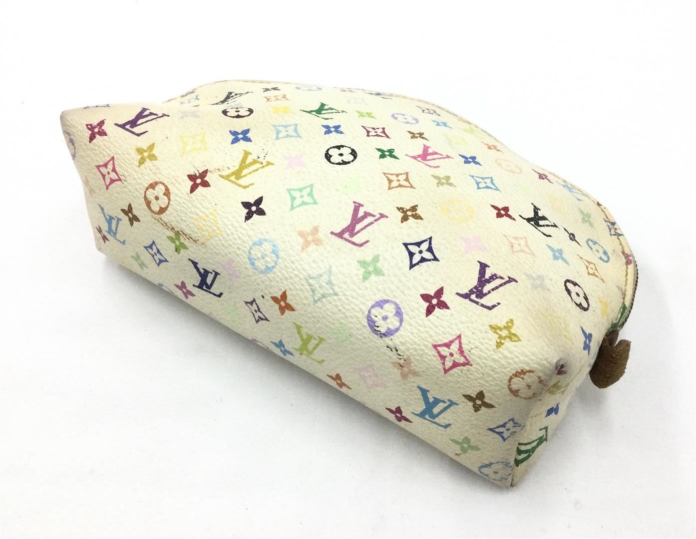 White multicolor monogram coated canvas Louis Vuitton Cosmetic pouch with gold-tone hardware, pink leather lining, one slip pocket and exposed zip closure. Height: 4.5" Width: 6.5" Depth: 2.25"