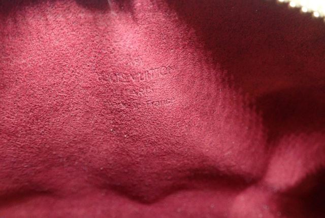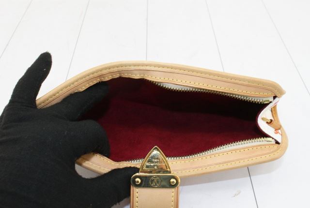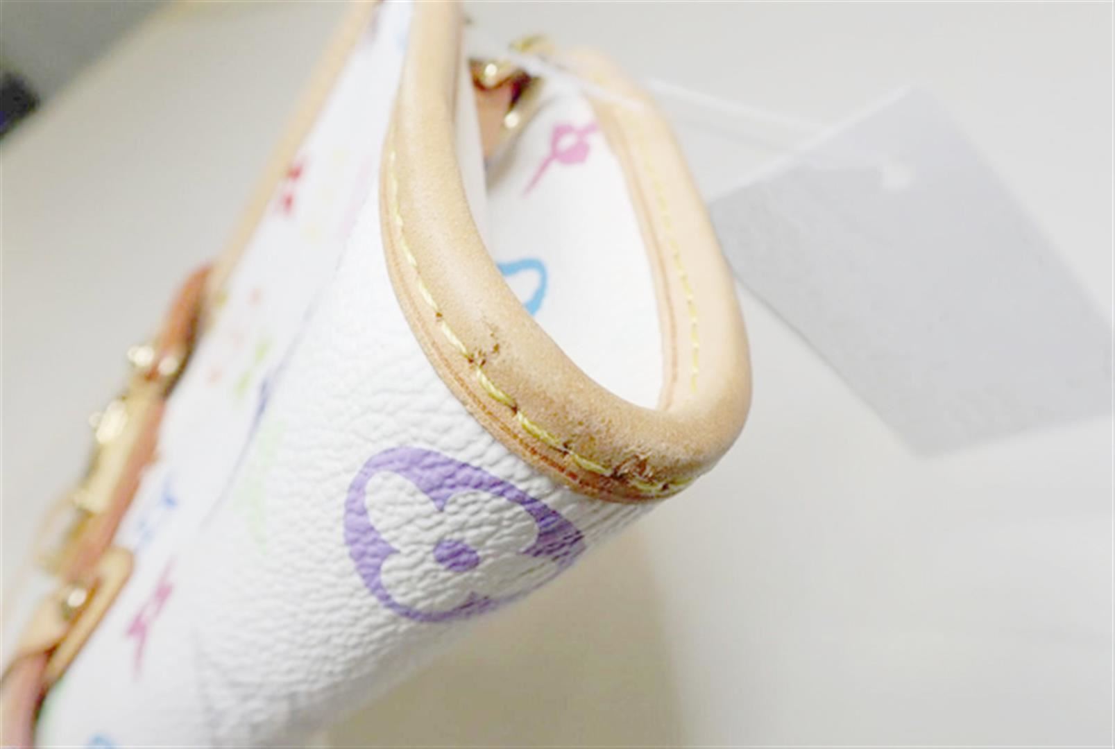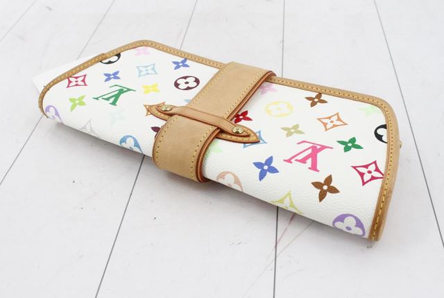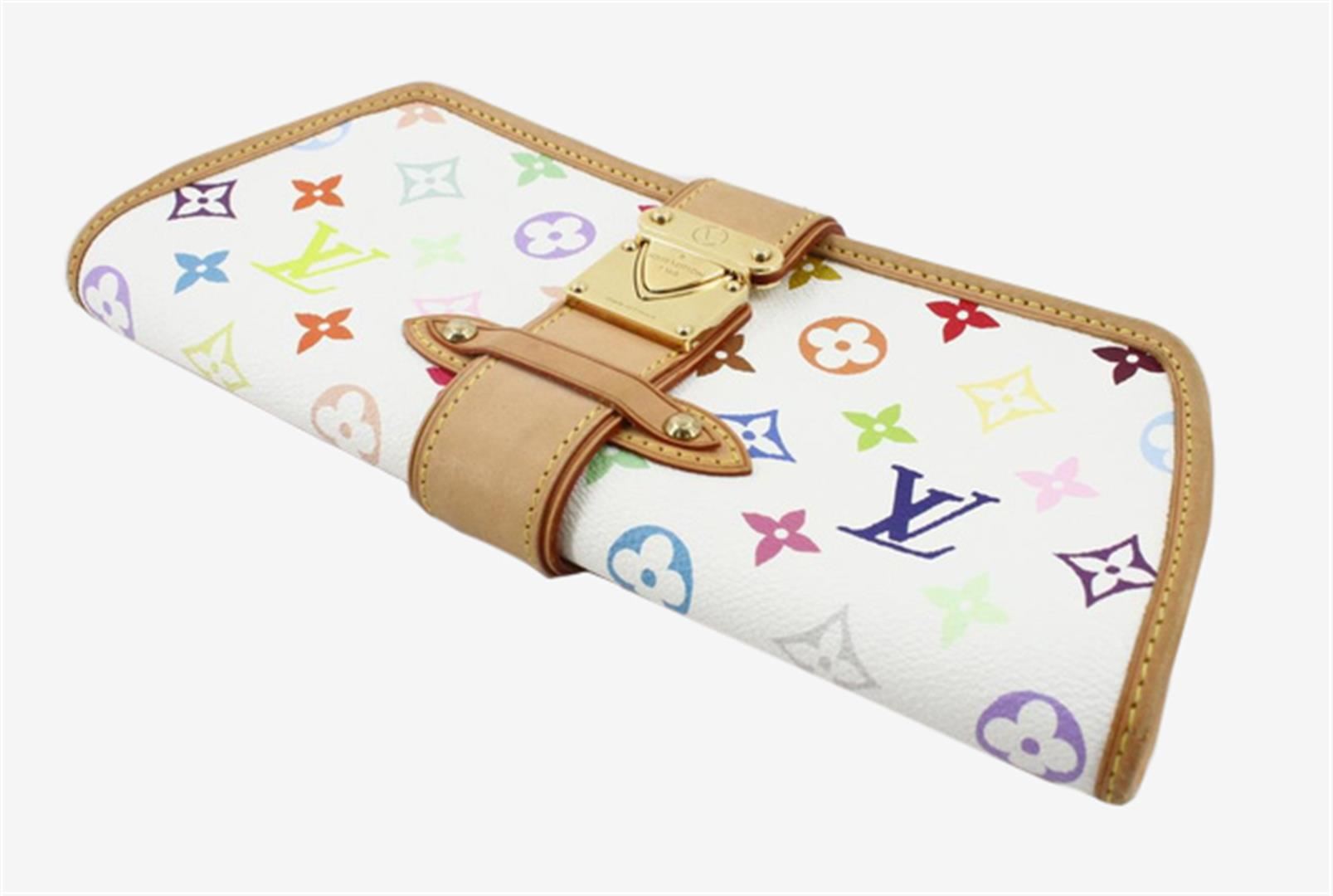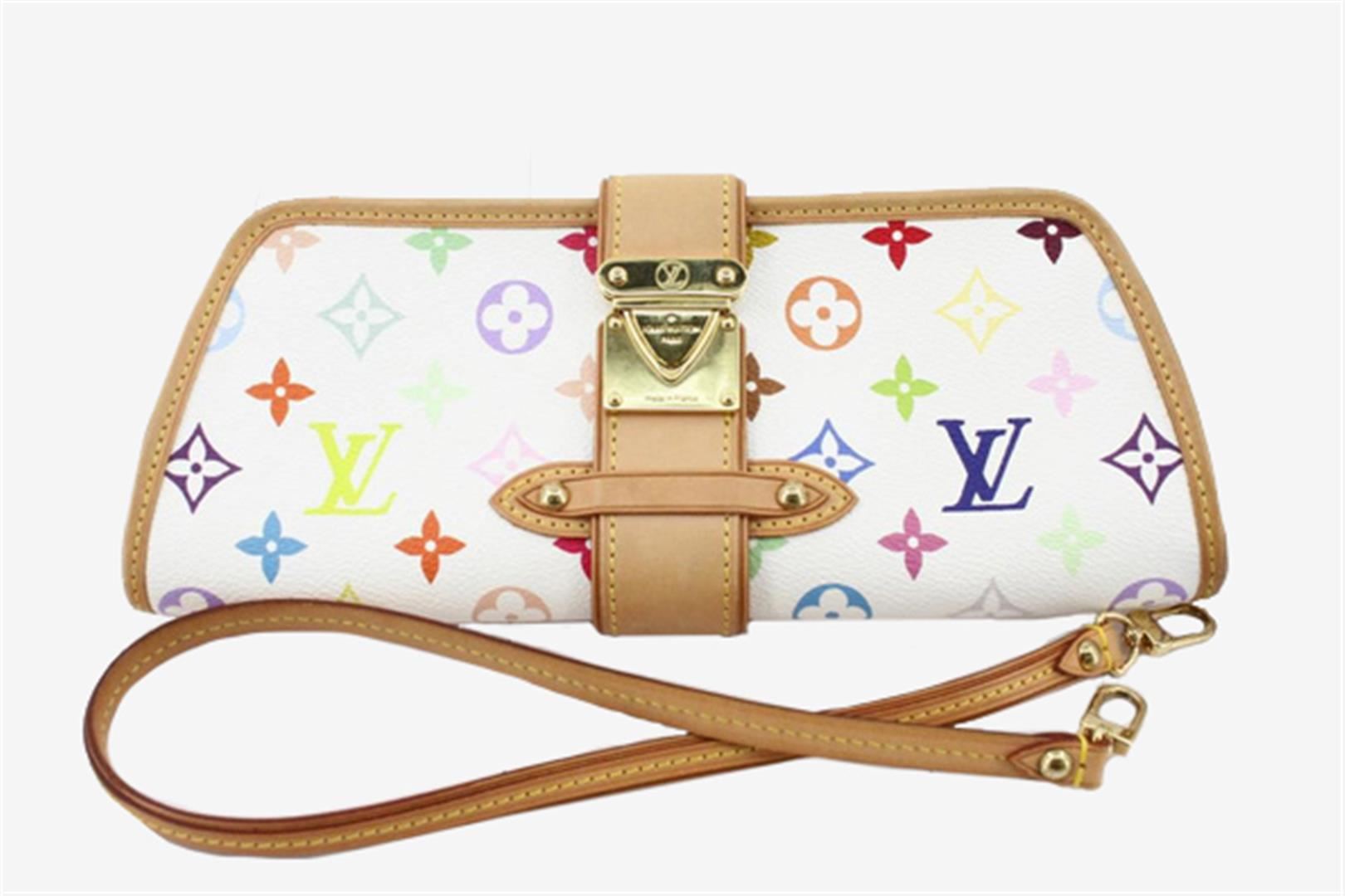 White multicolor monogram coated canvas Louis Vuitton Shirley bag with gold-tone hardware, tan vachetta leather trim featuring contrast stitching, red Alcantara lining, zip closure at top and push-lock closure at front. 8.5"x1.5"x4.25"xBag Drop:9"/21.5