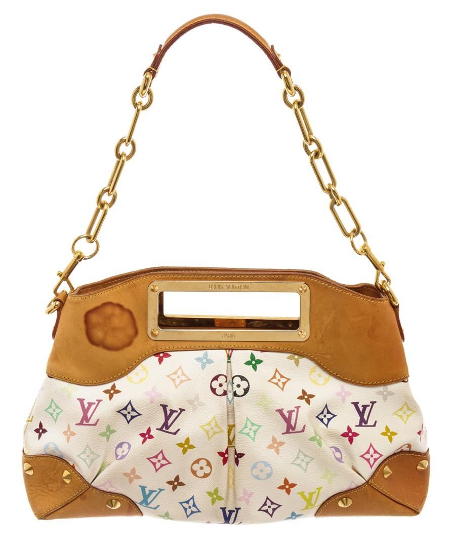Louis Vuitton White Multicolor Monogram Judy MM Shoulder Bag. All available information is listed in the description and shown in the photos. Louis Vuitton White Multicolor Monogram Judy MM Shoulder Bag with white multicolore monogram pattern, gold-tone hardware, leather trim, flat handles & single shoulder strap, leather, pleated & studded accents, alcantara lining & single interior pocket, snap closure at top. Height: 10" Width: 14" Depth: 3", Shoulder Strap Drop: 9" / 25.4 x 35.56 x 7.62 Cm