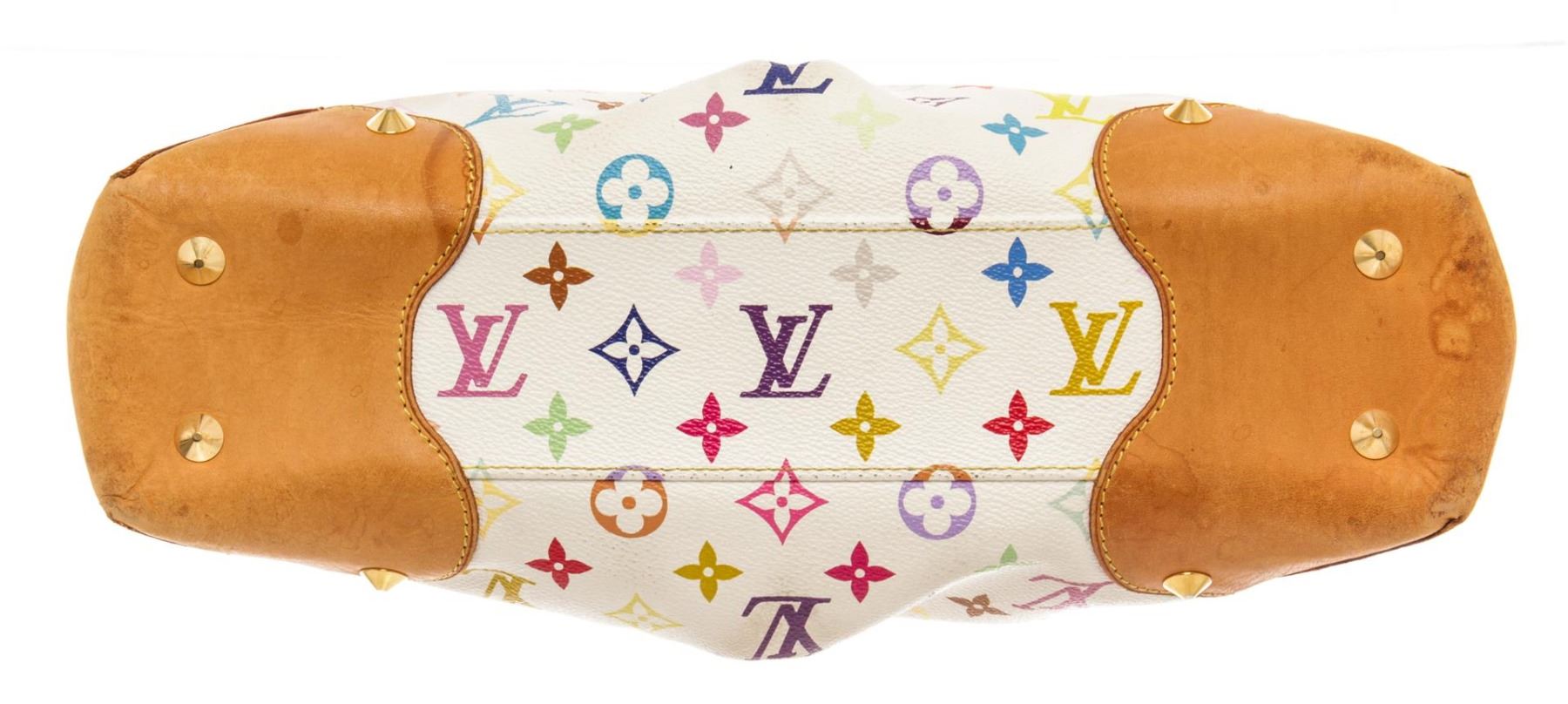 Louis Vuitton White Multicolor Monogram Judy MM Shoulder Bag. All available information is listed in the description and shown in the photos. Louis Vuitton White Multicolor Monogram Judy MM Shoulder Bag with white multicolore monogram pattern, gold-tone hardware, leather trim, flat handles & single shoulder strap, leather, pleated & studded accents, alcantara lining & single interior pocket, snap closure at top. Height: 10" Width: 14" Depth: 3", Shoulder Strap Drop: 9" / 25.4 x 35.56 x 7.62 Cm