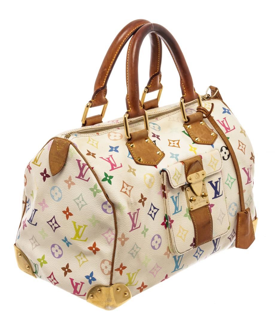 Louis Vuitton White Multicolor Monogram Leather Speedy 30 Satchel Bag. All available information is listed in the description and shown in the photos. Louis Vuitton White Multicolor Monogram Leather Speedy 30 Satchel Bag with multicolore monogram pattern, brass hardware, leather trim, rolled handles, single exterior pocket, alcantara lining & single interior pocket, zip closure at top, protective feet at base. Height: 9.25" Width: 13.25" Depth: 6.5", Handle Drop: 4.25" / 23.49 x 33.65 x 16.51 Cm