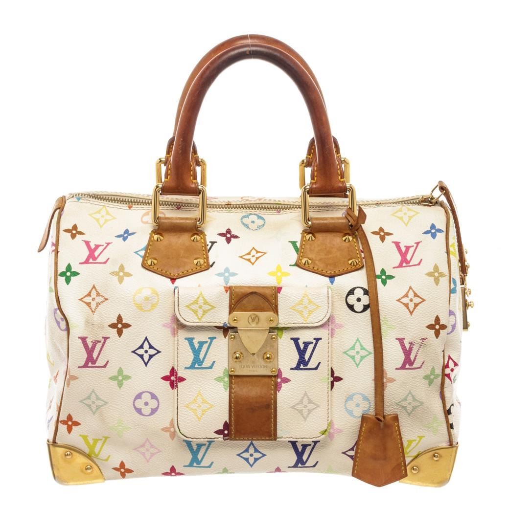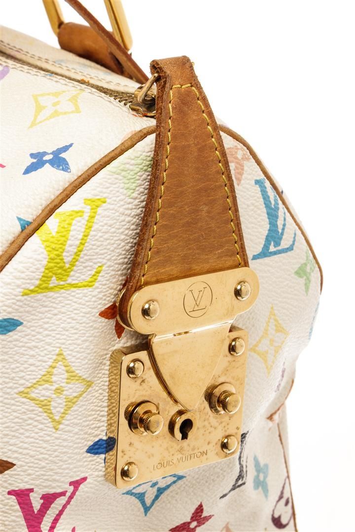 Louis Vuitton White Multicolor Monogram Leather Speedy 30 Satchel Bag. All available information is listed in the description and shown in the photos. Louis Vuitton White Multicolor Monogram Leather Speedy 30 Satchel Bag with multicolore monogram pattern, brass hardware, leather trim, rolled handles, single exterior pocket, alcantara lining & single interior pocket, zip closure at top, protective feet at base. Height: 9.25" Width: 13.25" Depth: 6.5", Handle Drop: 4.25" / 23.49 x 33.65 x 16.51 Cm