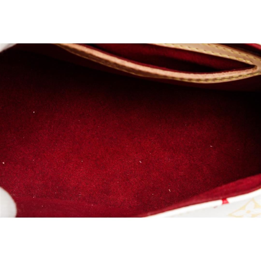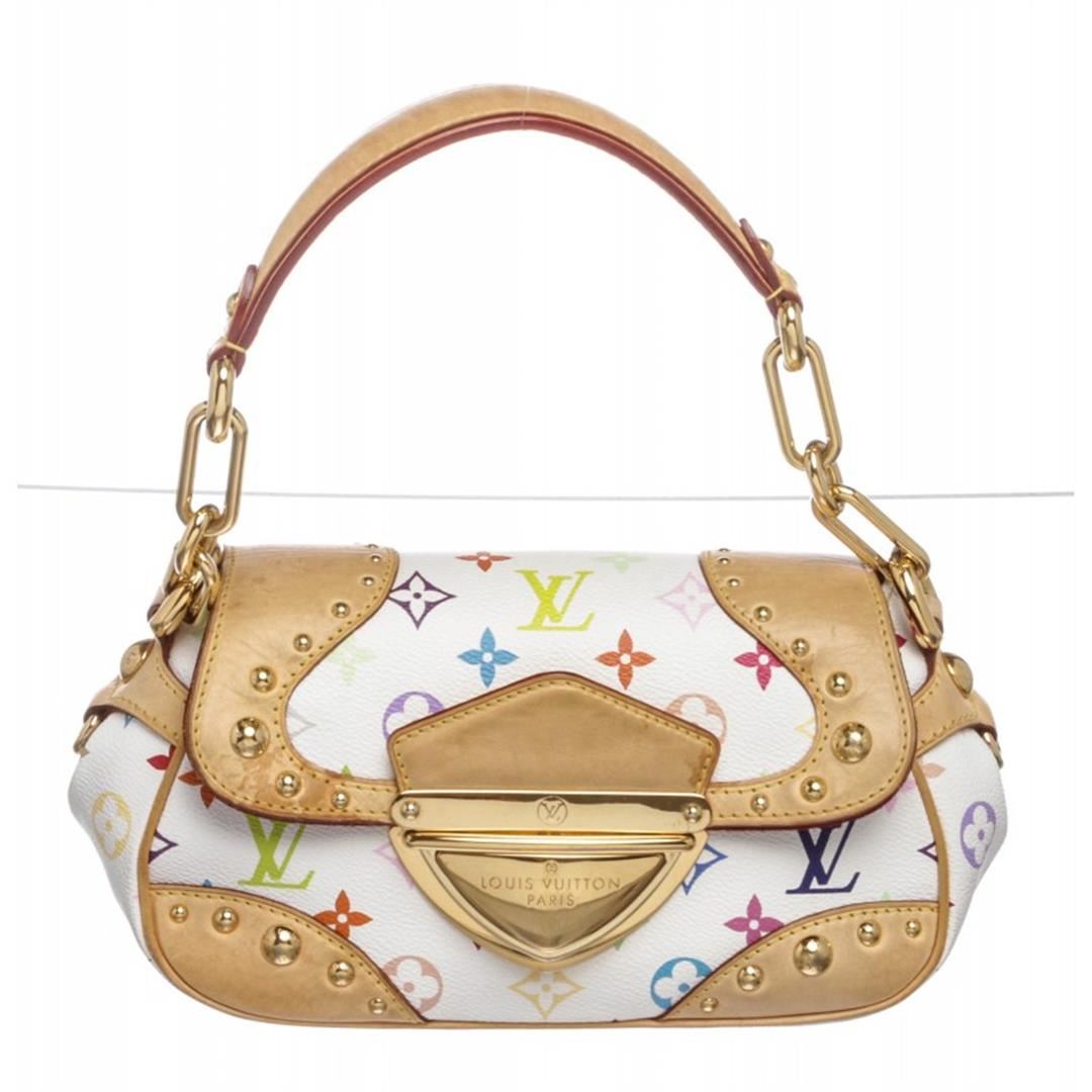 From the Takashi Murakami Collection. Multicolore monogram coated canvas Louis Vuitton Marilyn bag with brass hardware, tan vachetta leather trim, single chain-link top handle featuring shoulder pad, single exteriorit pocket at back, Alcantara lining, singleit pocket at interior wall and push-lock closure at front flap. Item is pre-owned.