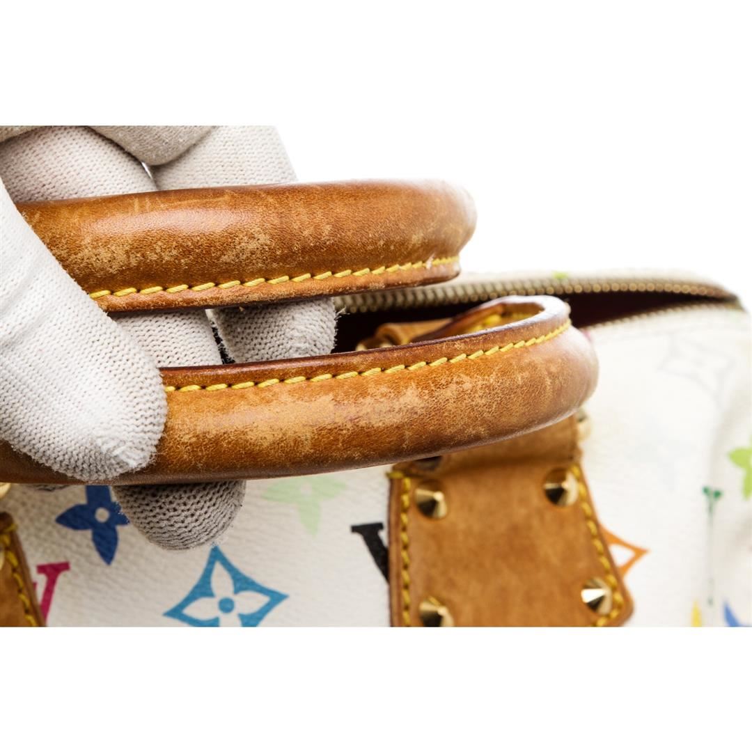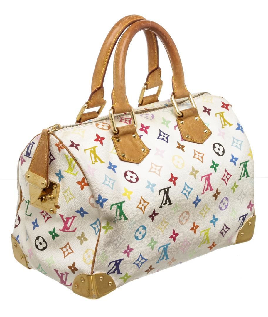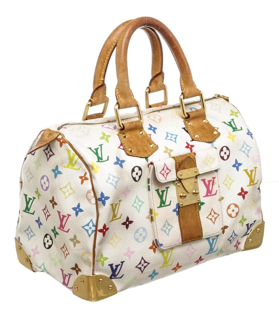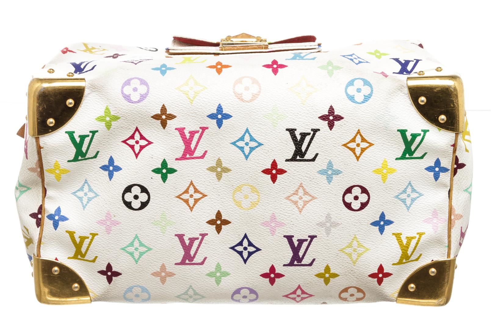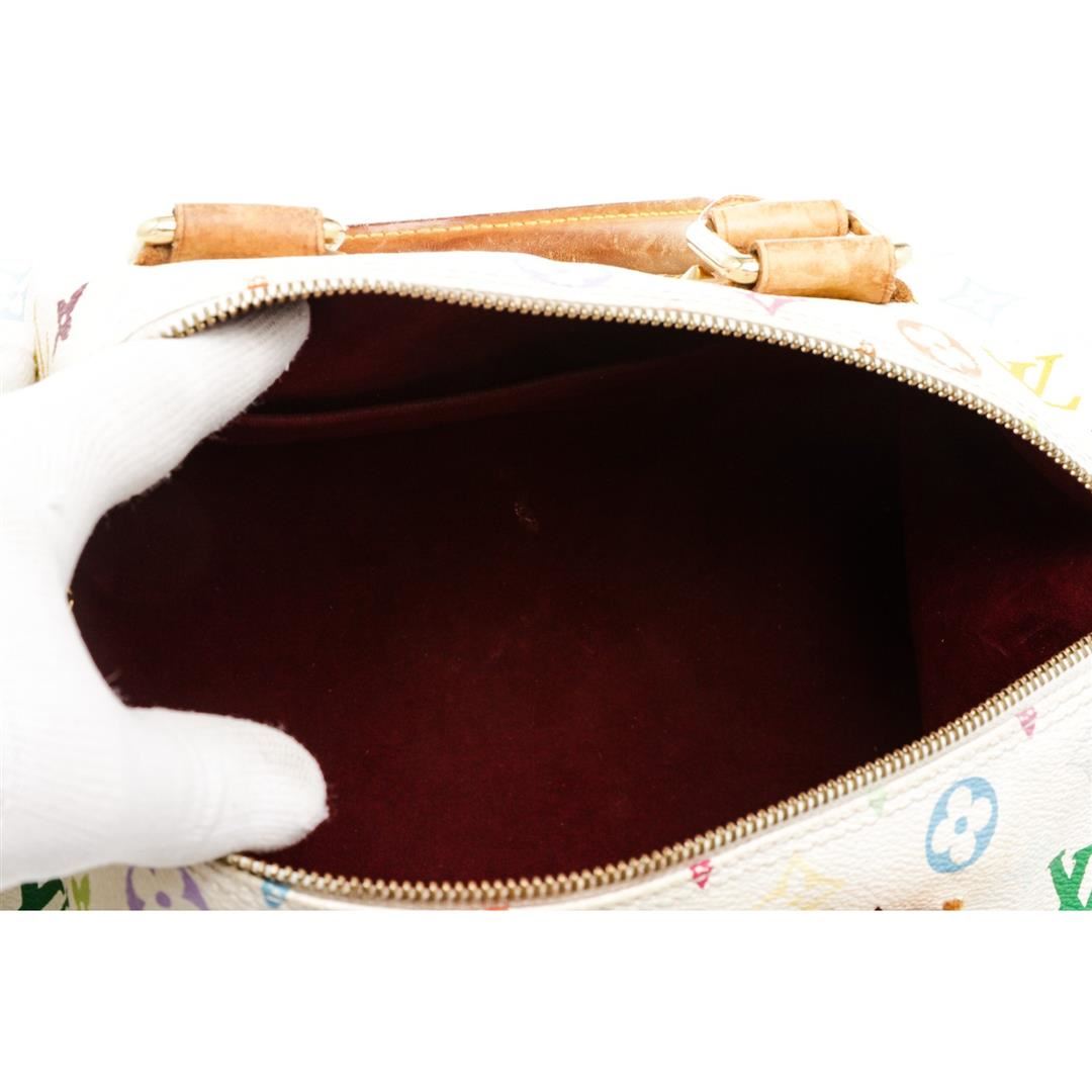 From the Takashi Murakami Collection. Multicolore monogram coated canvas Louis Vuitton Speedy 30 with brass hardware, tan vachetta leather trim, dual rolled top handles, single exterior pocket with flap and S-lock closure, red Alcantara lining, single slit pocket at interior wall and zip closure at top with additional S-lock closure at side. Authentic.