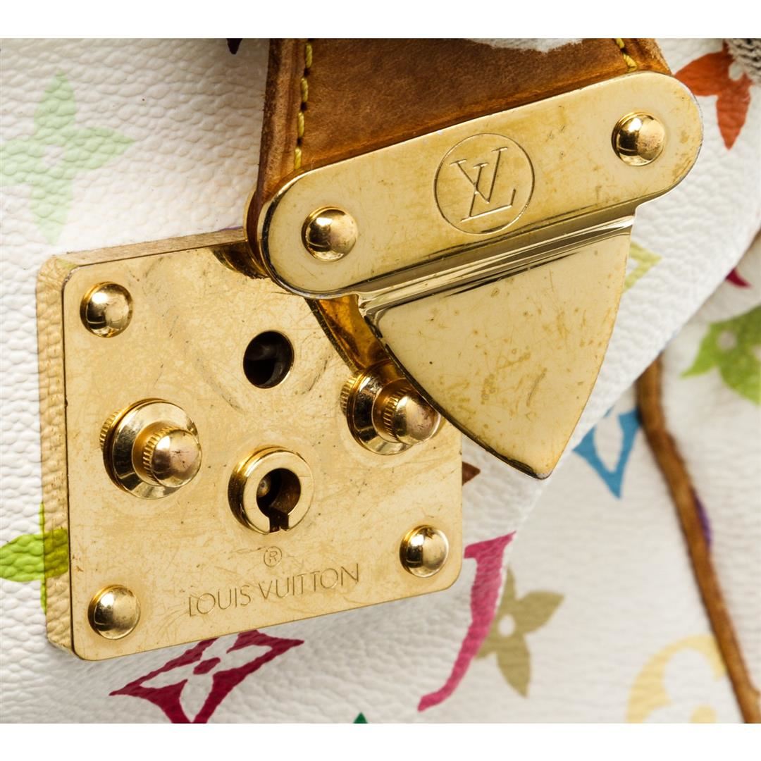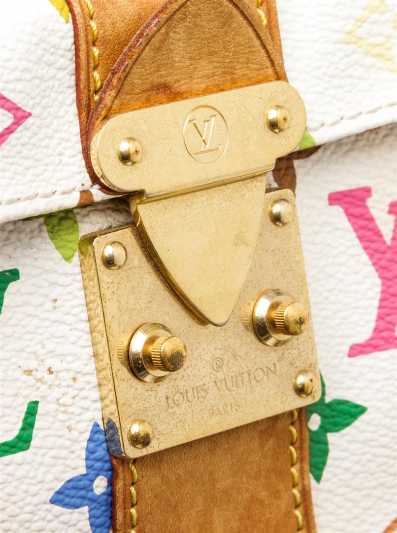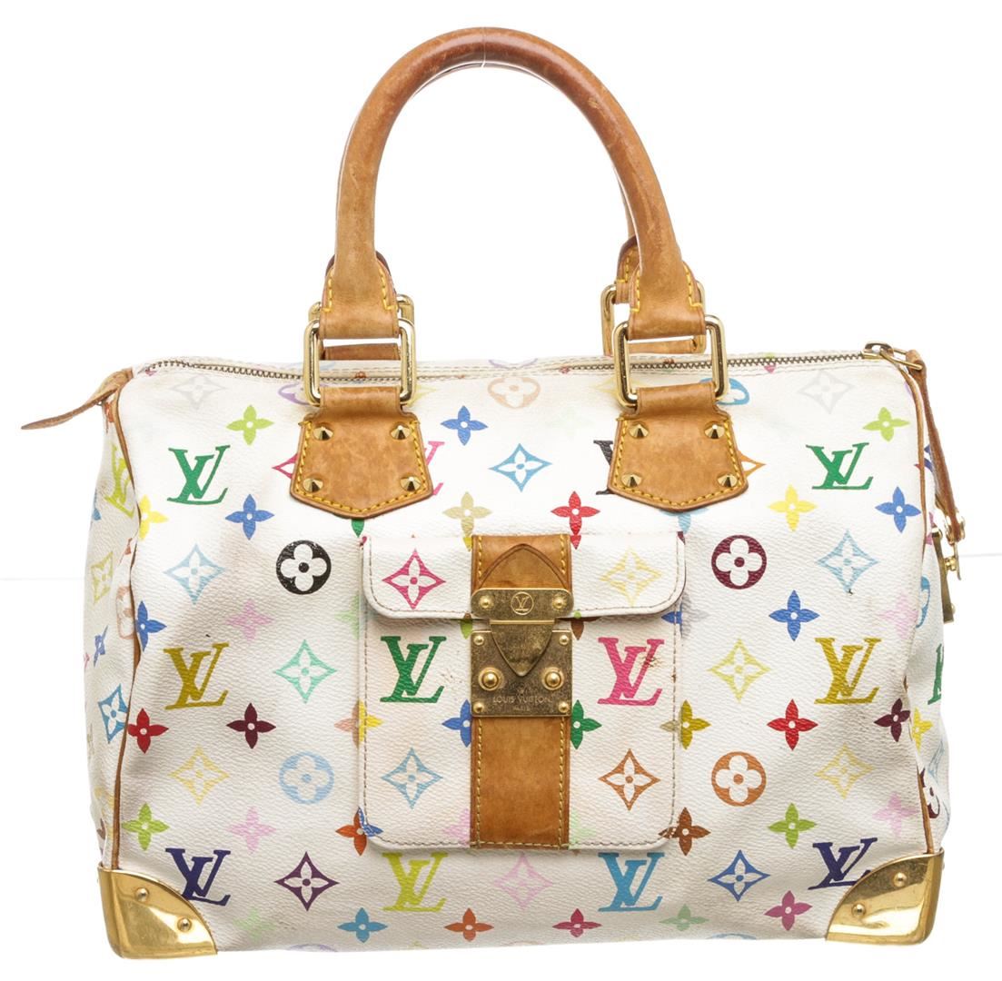 From the Takashi Murakami Collection. Multicolore monogram coated canvas Louis Vuitton Speedy 30 with brass hardware, tan vachetta leather trim, dual rolled top handles, single exterior pocket with flap and S-lock closure, red Alcantara lining, single slit pocket at interior wall and zip closure at top with additional S-lock closure at side. Authentic.
