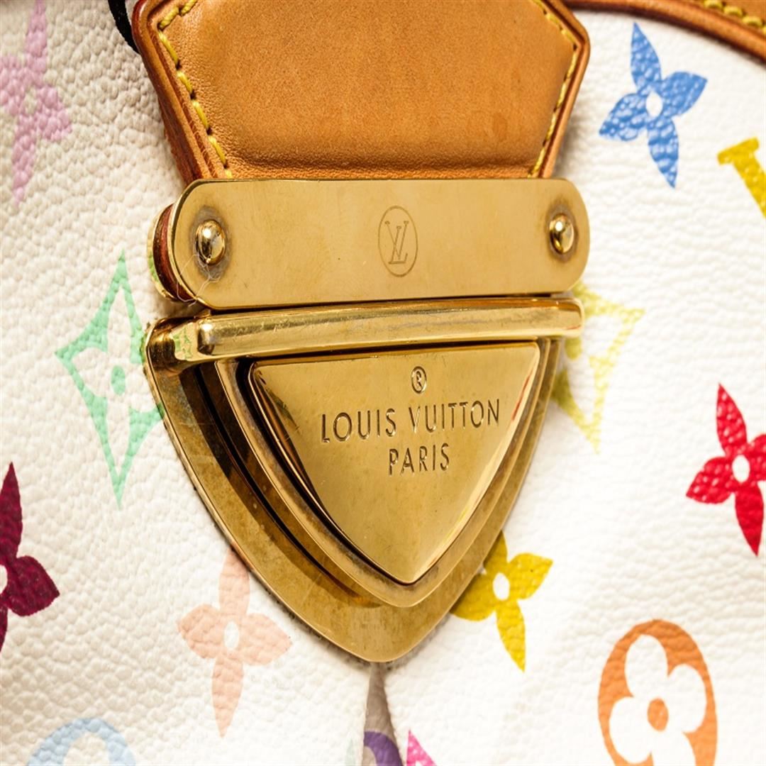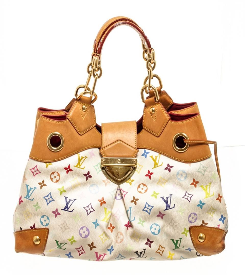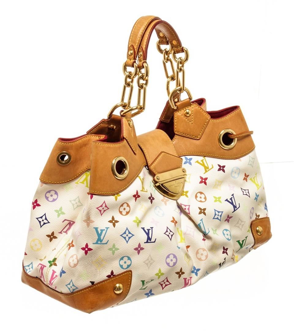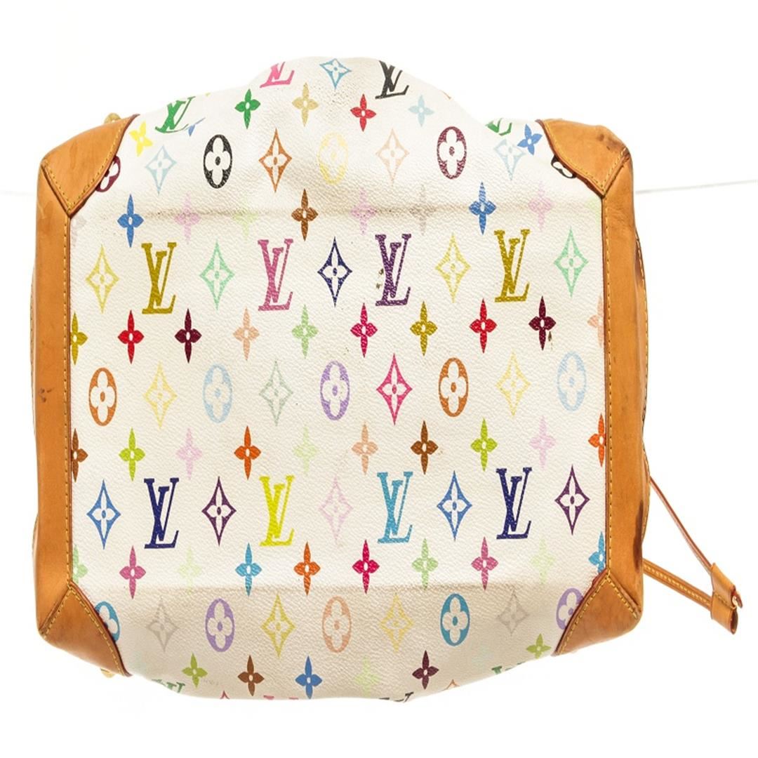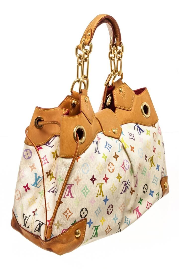One Louis Vuitton White Multicolor Monogram Ursula Bag. Item is sold AS-IS. All available information is listed in the description and shown in the photo. Louis Vuitton white multicolor monogram Ursula bag with gold-tone hardware, dual chain-link shoulder straps with shoulder guards, tan vachetta leather trim, drawstring accents at sides, yellow contrast stitching, red Alcantara lining, dual interior compartments, dual pockets at interior wall; one with flap snap closure and push-lock closure at front. Stains on the exterior leather, vachetta stain please refer to photos. Height: 9.75" Width: 6.25" Depth: 15.75" , Handle Drop: / 24.77 x 15.88 x 40.01 Cm