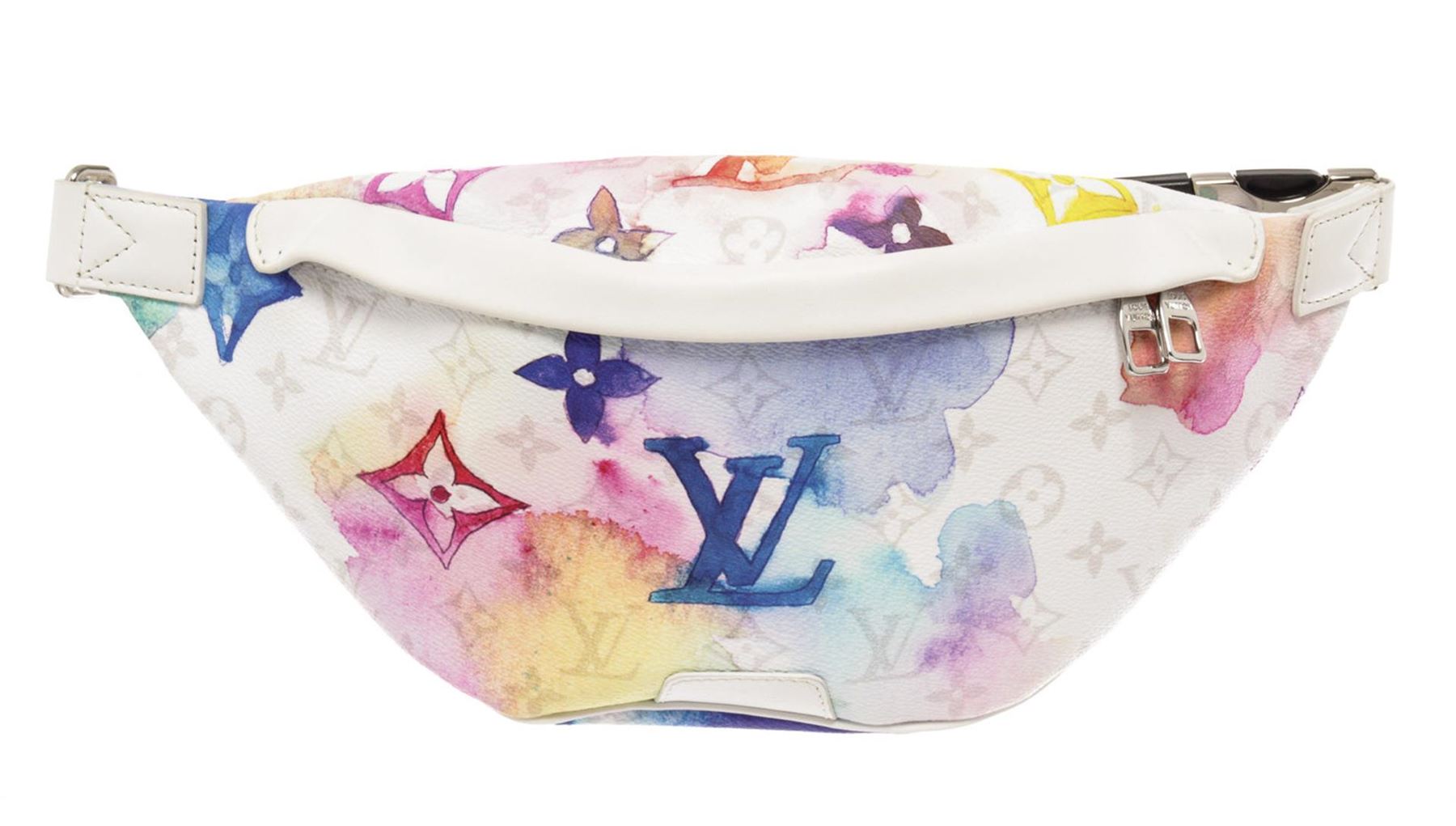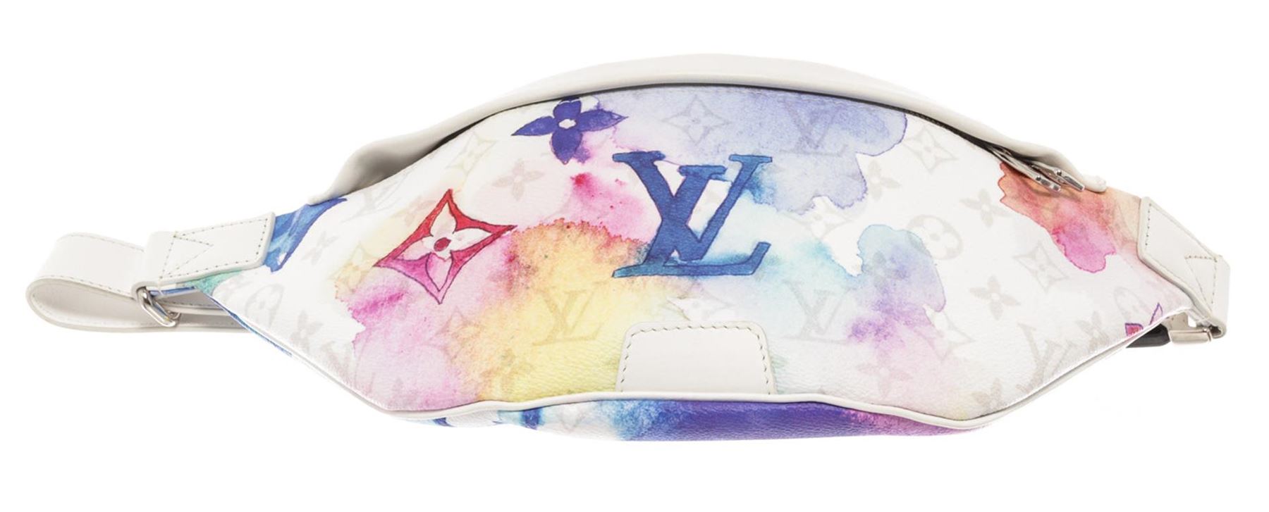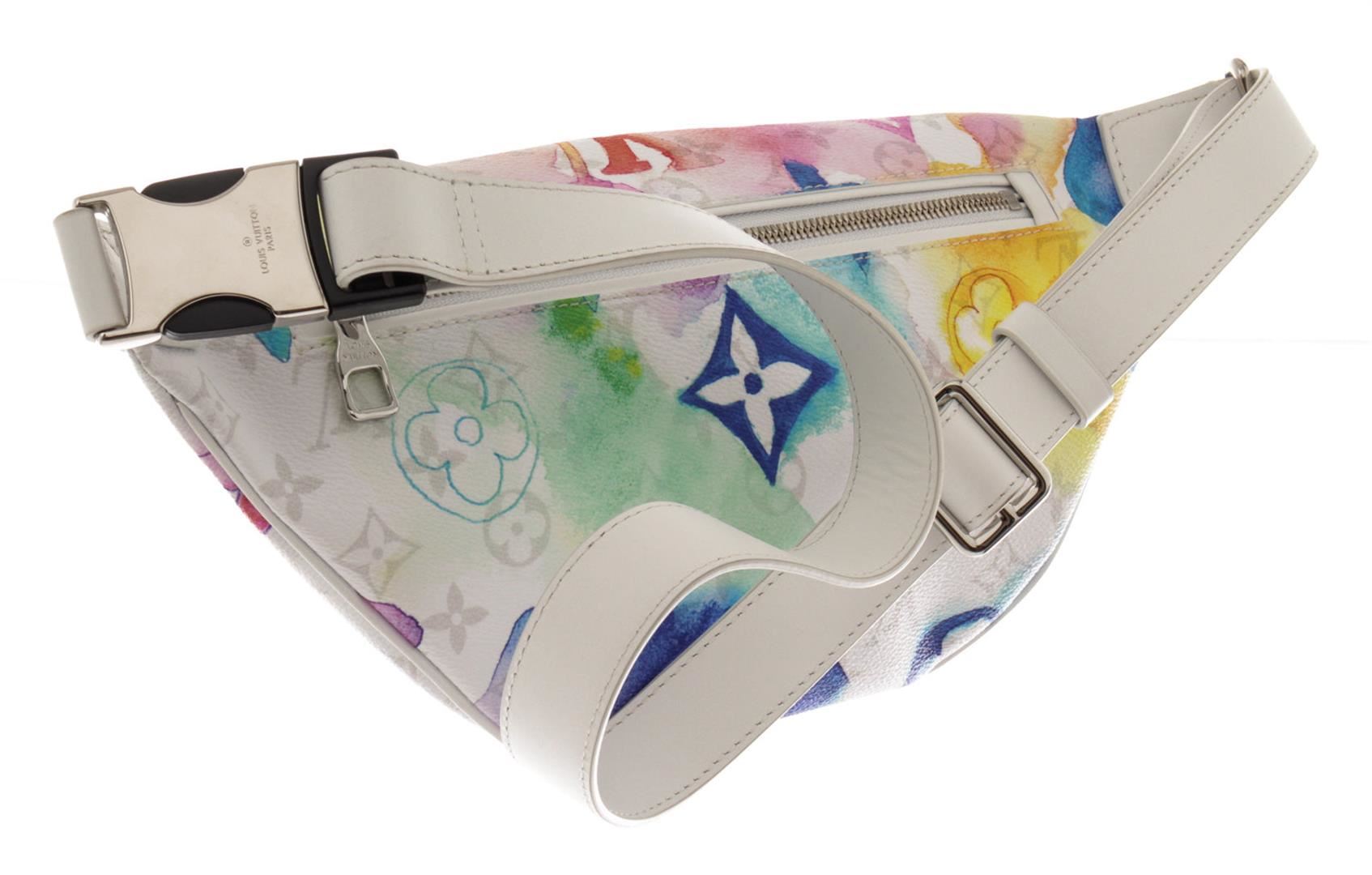 White multicolor Monogram coated canvas Louis Vuitton Discovery bum bag features silver-tone hardware, adjustable shoulder/waist leather strap, single exterior pocket, blue canvas lining single interior pocket and buckle closure at back. Height