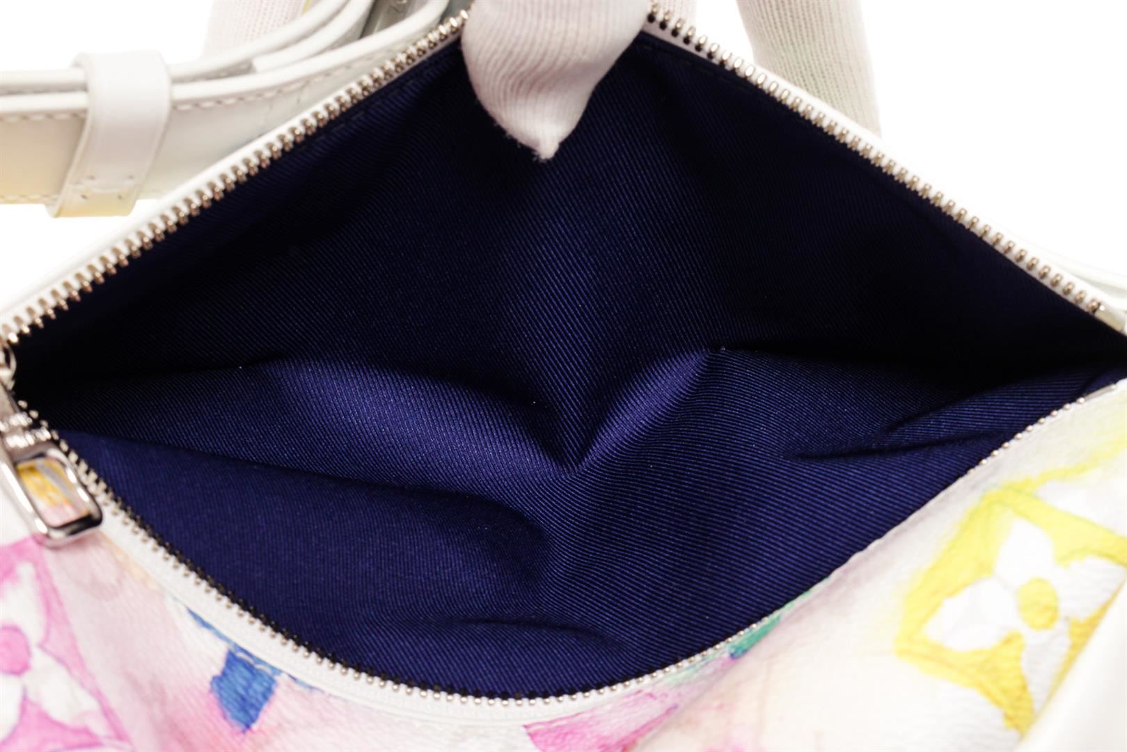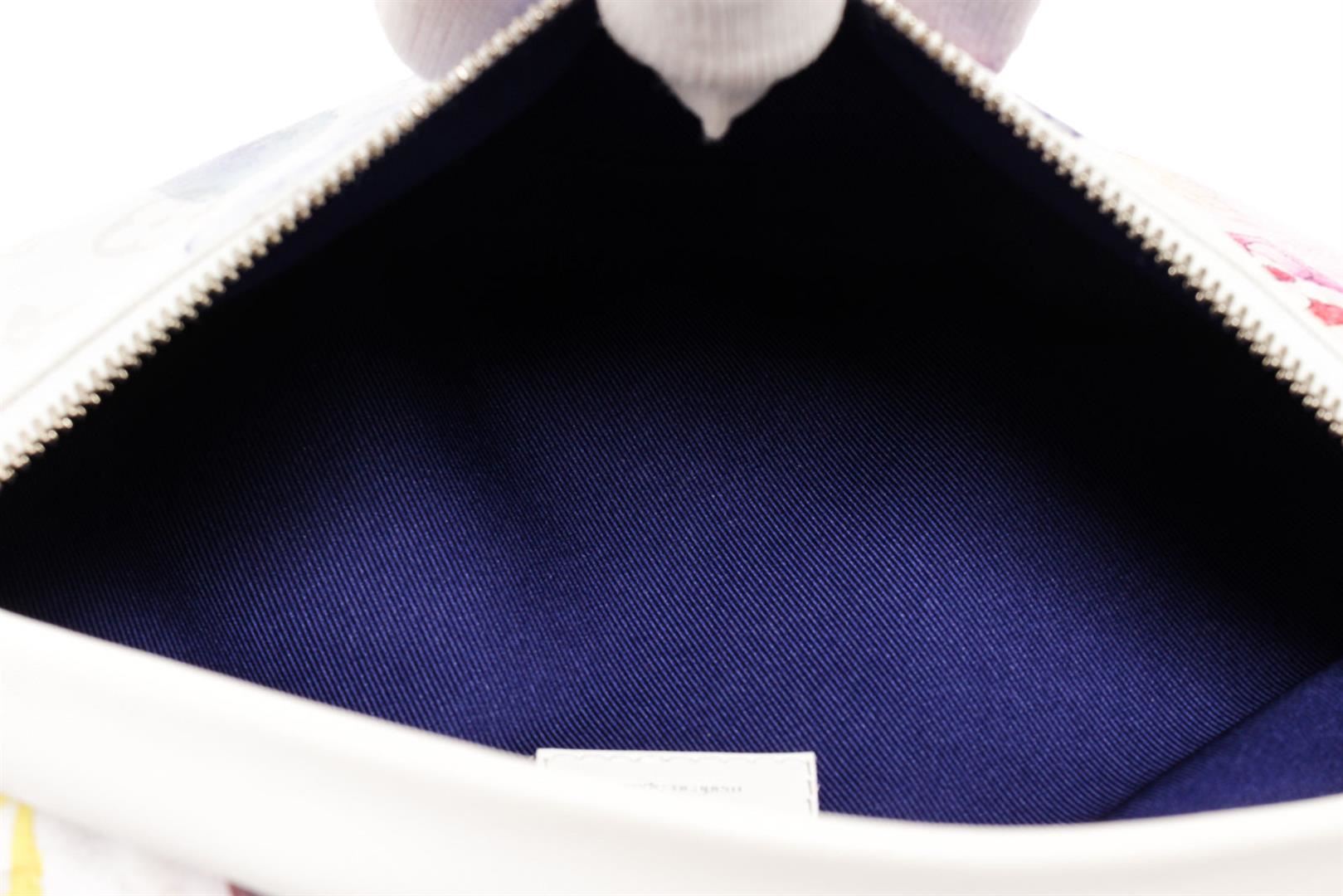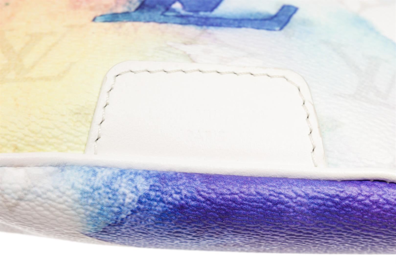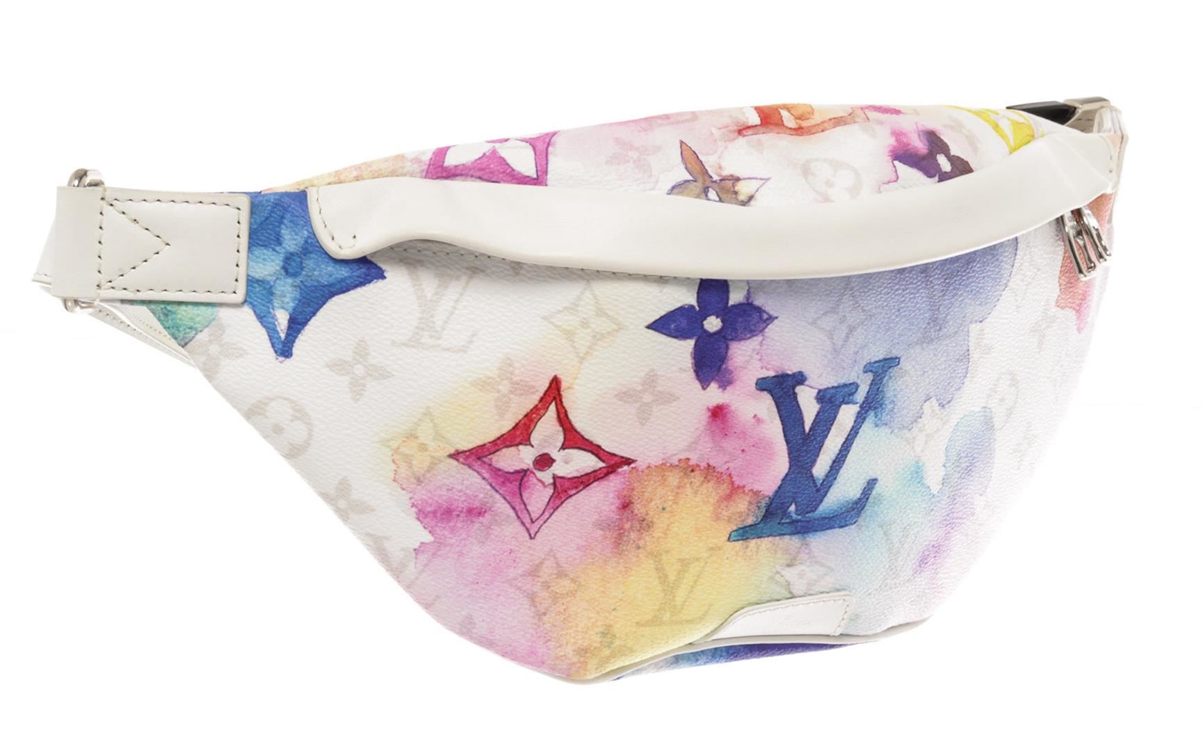 White multicolor Monogram coated canvas Louis Vuitton Discovery bum bag features silver-tone hardware, adjustable shoulder/waist leather strap, single exterior pocket, blue canvas lining single interior pocket and buckle closure at back. Height