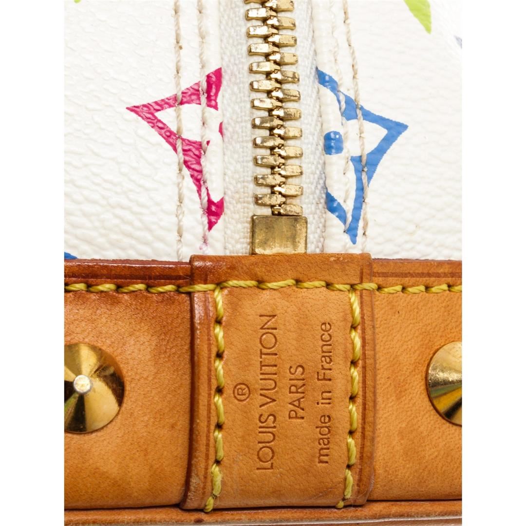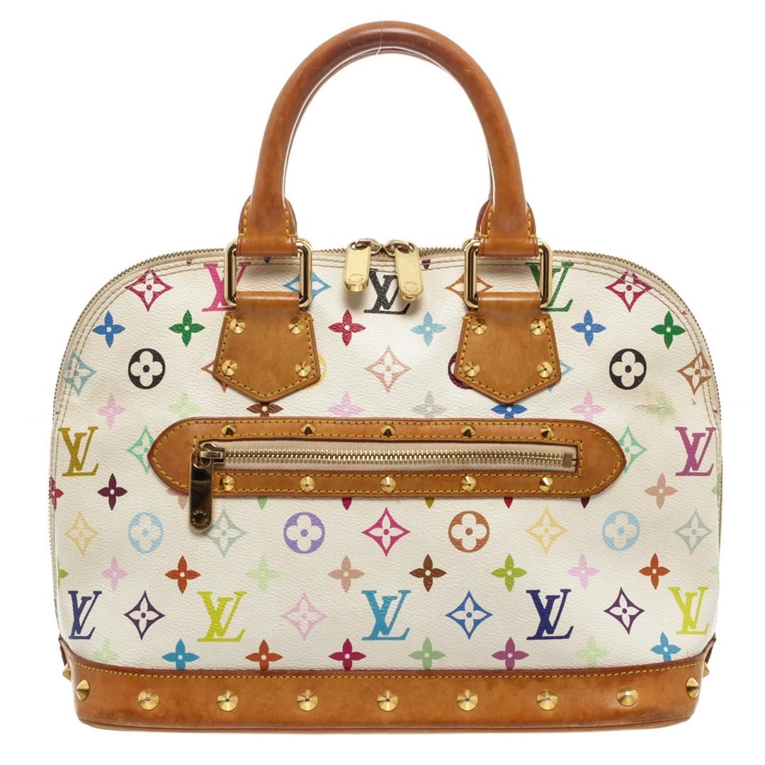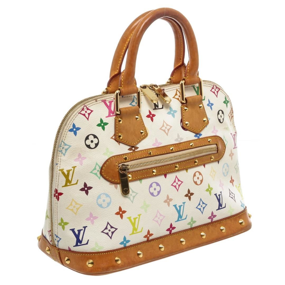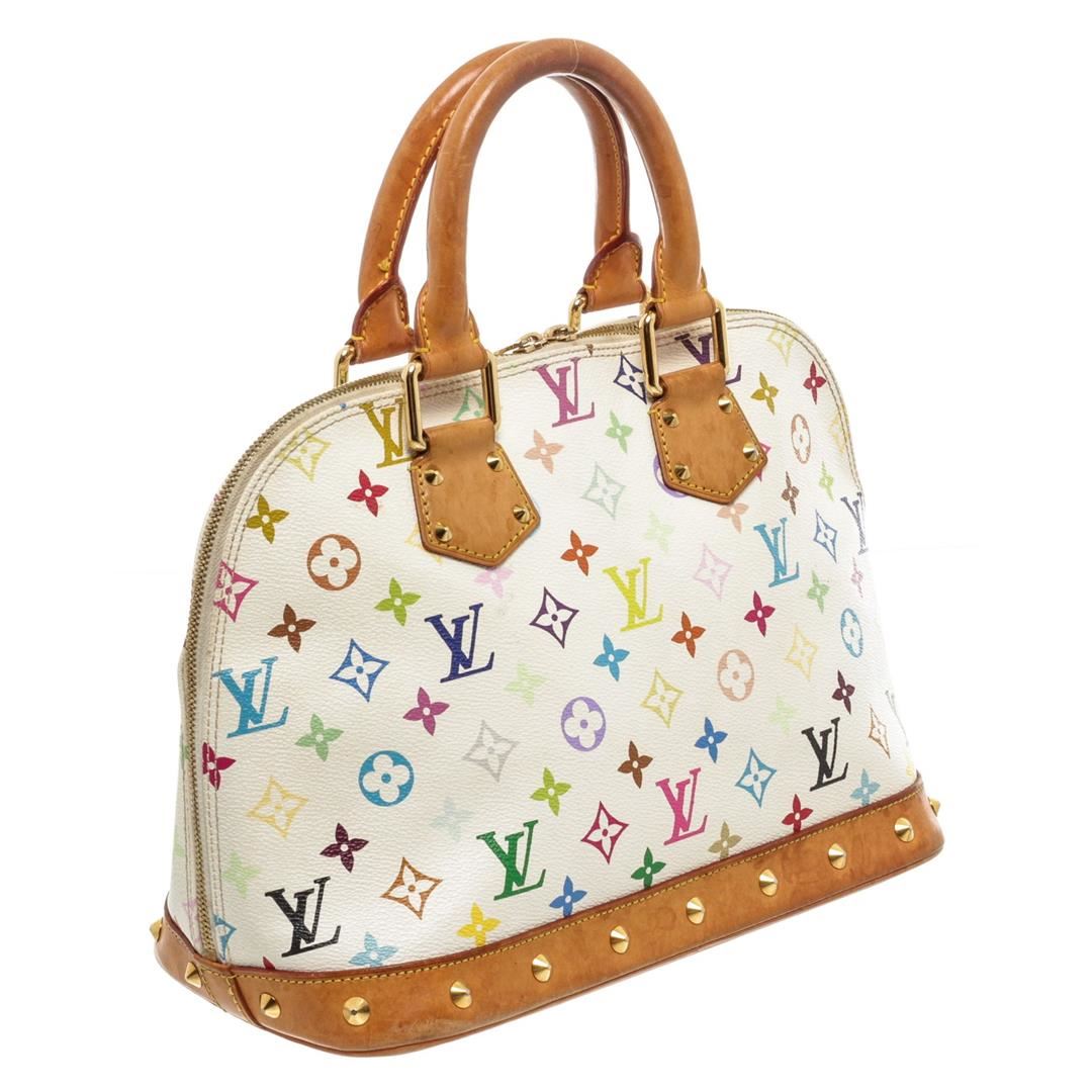 White and multicolore monogram coated canvas Louis Vuitton Alma MM with brass hardware, dual rolled top handles, tan vachetta leather trim, single zip pocket at front, stud embellishments throughout leather trim, burgundy Alcantara lining, dual slit pockets at interior wall and zip closure at top. Authentic.