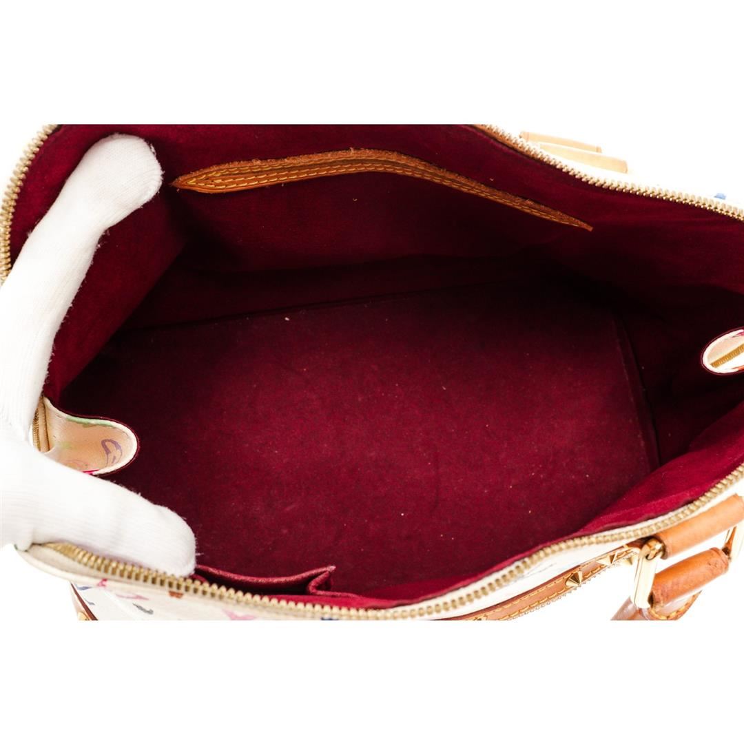 White and multicolore monogram coated canvas Louis Vuitton Alma MM with brass hardware, dual rolled top handles, tan vachetta leather trim, single zip pocket at front, stud embellishments throughout leather trim, burgundy Alcantara lining, dual slit pockets at interior wall and zip closure at top. Authentic.