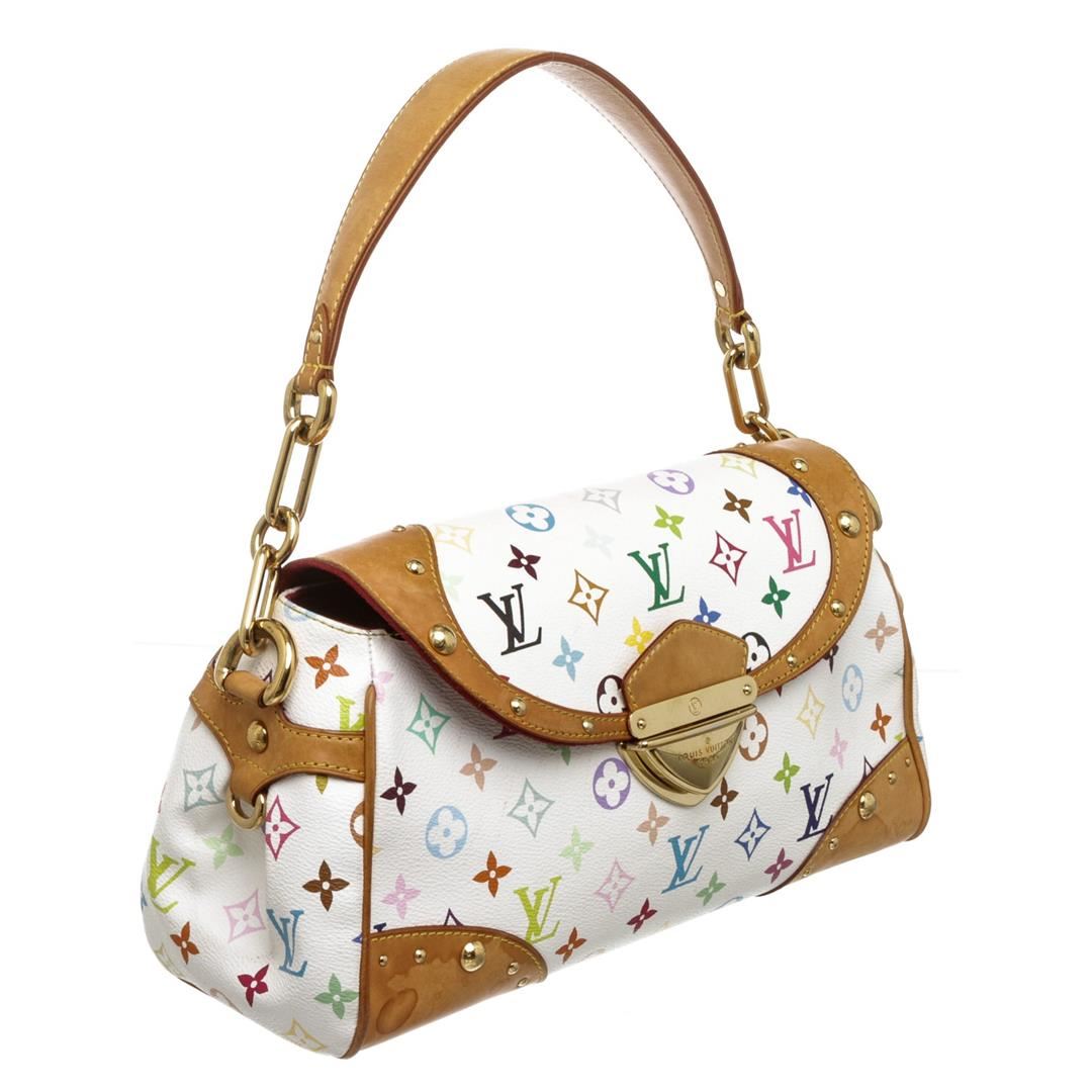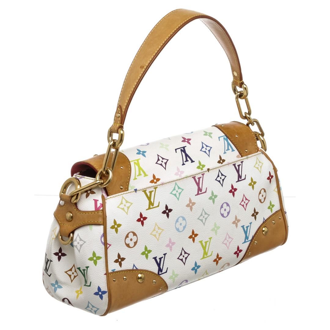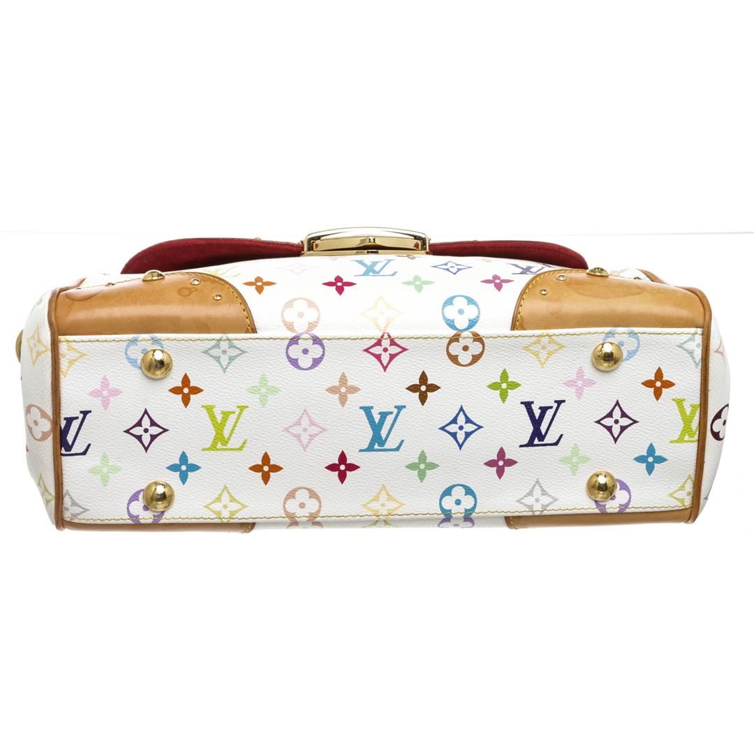 White and multicolor monogram canvas leather Louis Vuitton Beverly MM with brass hardware, single flat shoulder strap, tan vachetta leather trim, dome stud embellishments at exterior, single slit pocket at exterior, protective feet at base, burgundy alcantara lining, dual slit pockets at interior wall and push-lock closure at front flap. Authentic.