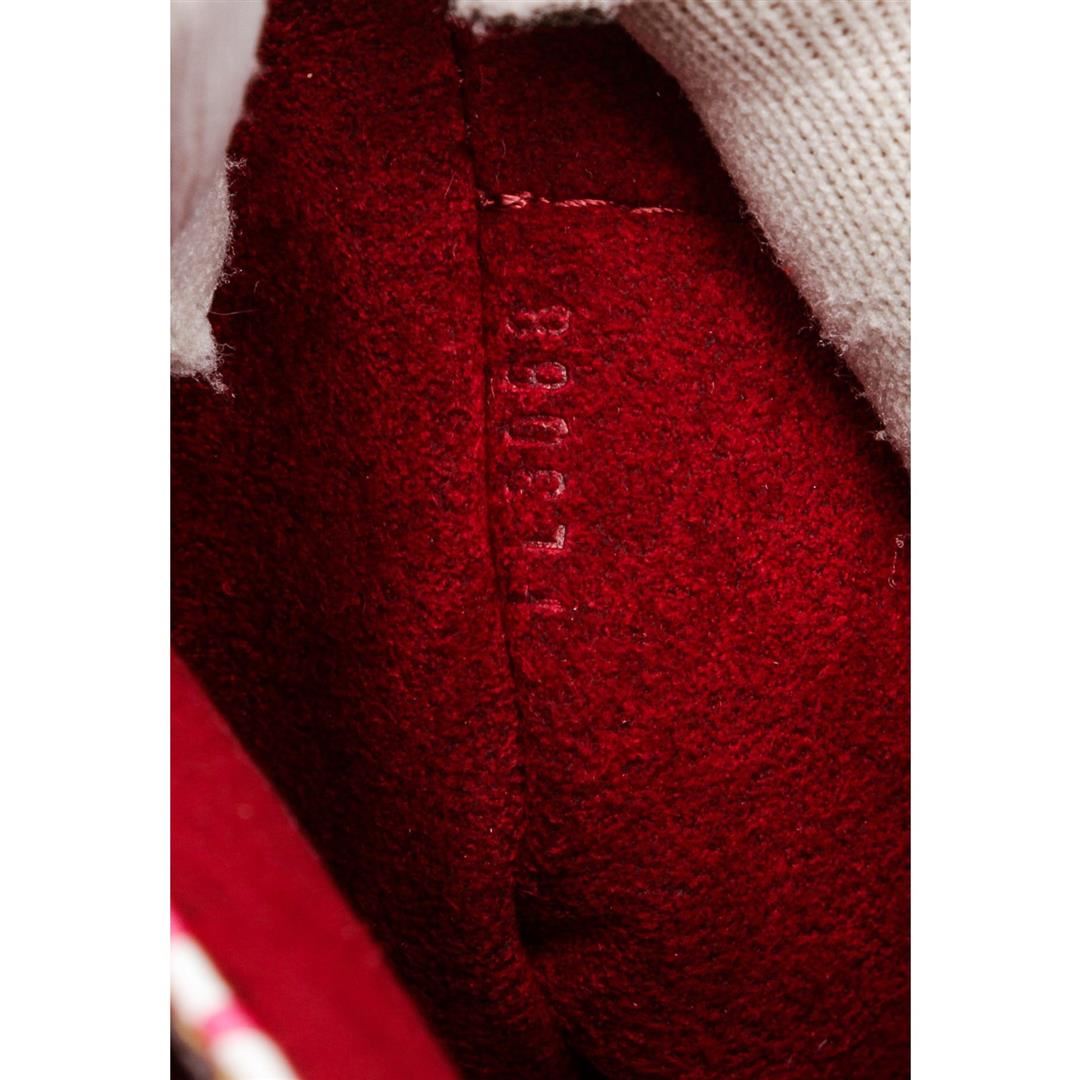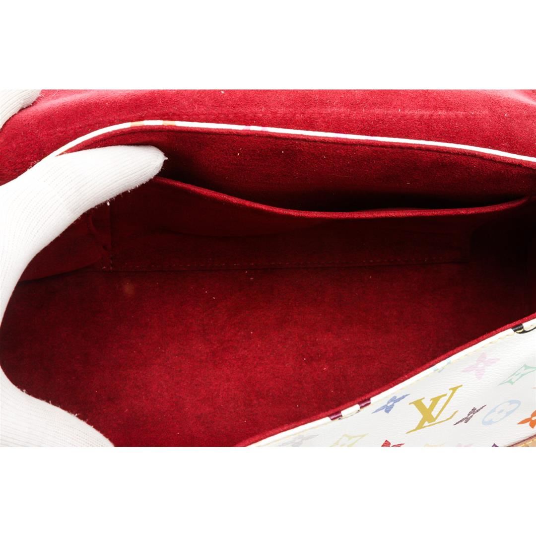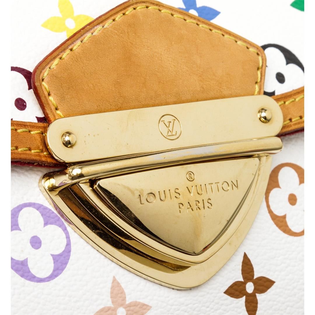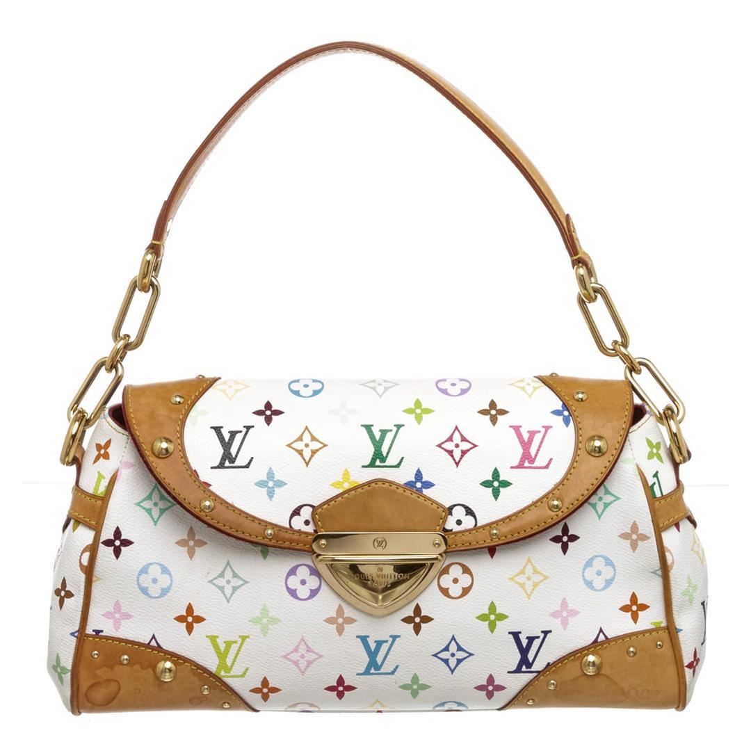 White and multicolor monogram canvas leather Louis Vuitton Beverly MM with brass hardware, single flat shoulder strap, tan vachetta leather trim, dome stud embellishments at exterior, single slit pocket at exterior, protective feet at base, burgundy alcantara lining, dual slit pockets at interior wall and push-lock closure at front flap. Authentic.