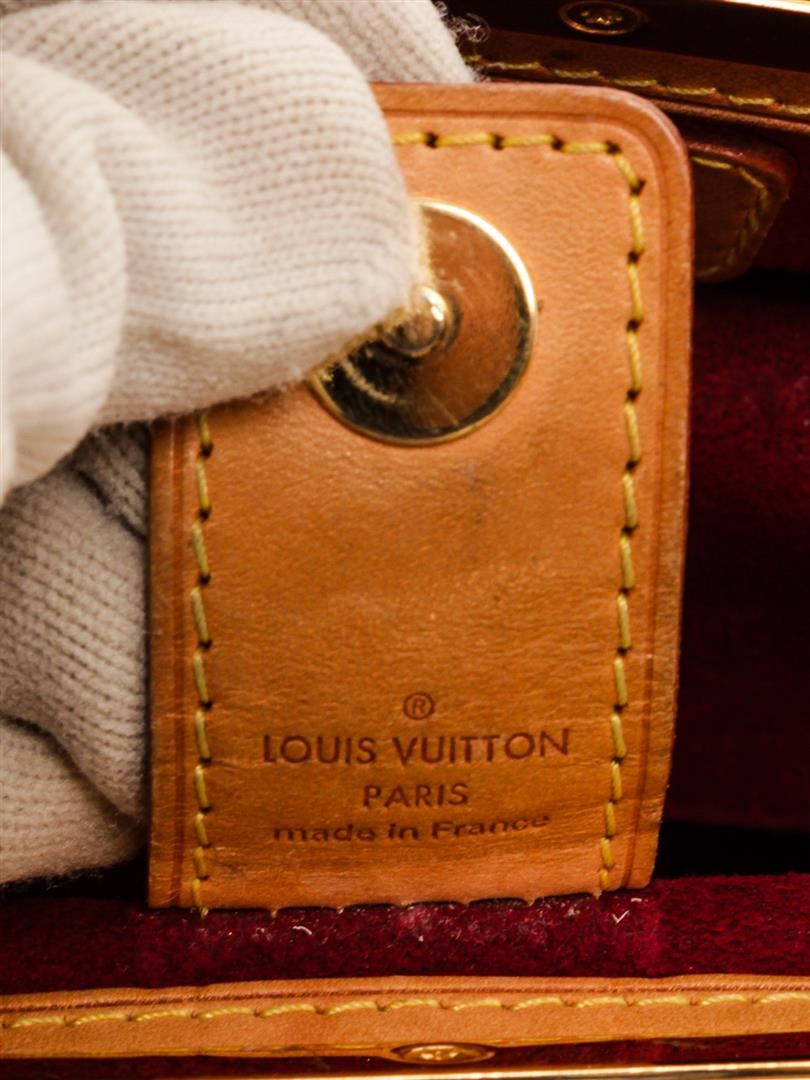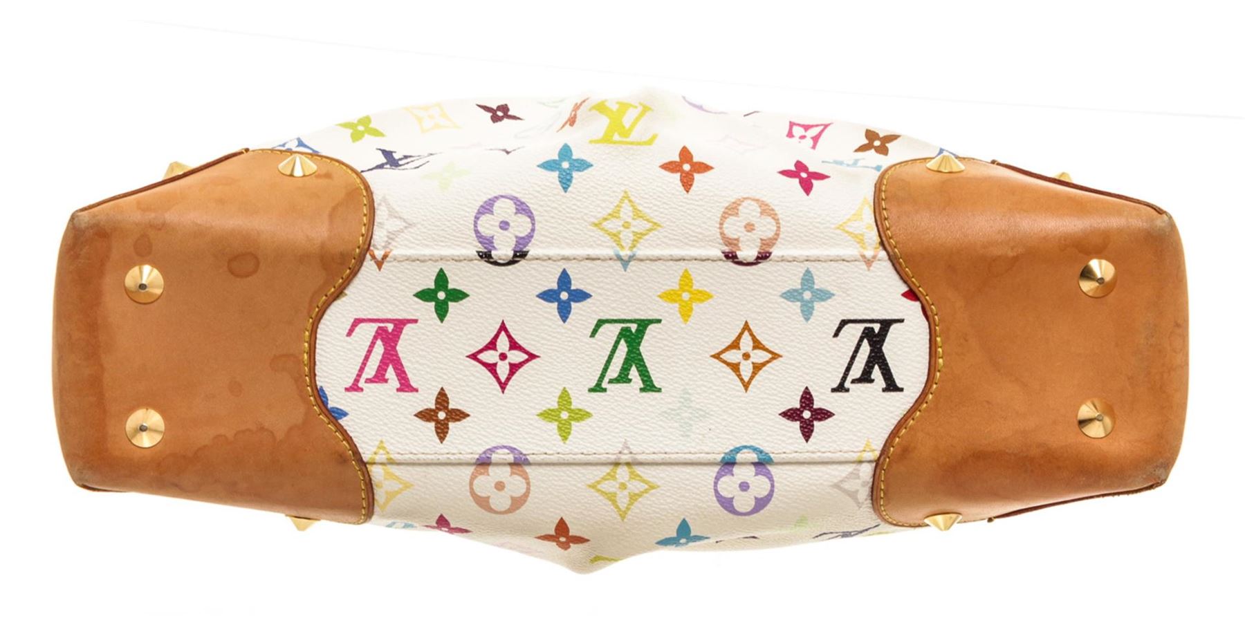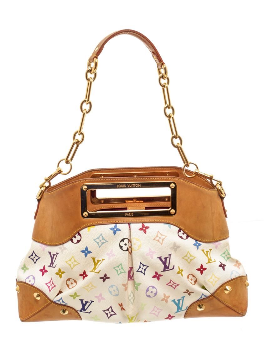 White and multicolor monogram canvas leather Louis Vuitton Judy MM with brass hardware, tan vachetta leather trim, dual cut out top handles, single optional chain-link shoulder strap with leather shoulder guard, stud embellishments at exterior, protective feet at base, burgundy Alcantara lining, dual pockets at interior wall; one with snap closure and magnetic snap closure at top. Authentic.