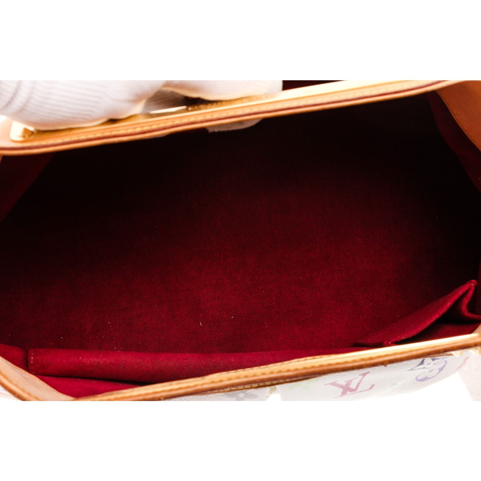 White multicolored coated canvas, gold tone hardware, and tan leather trim. Inner felt burgundy lining, snap closure pocket, and magnetic snap closure.