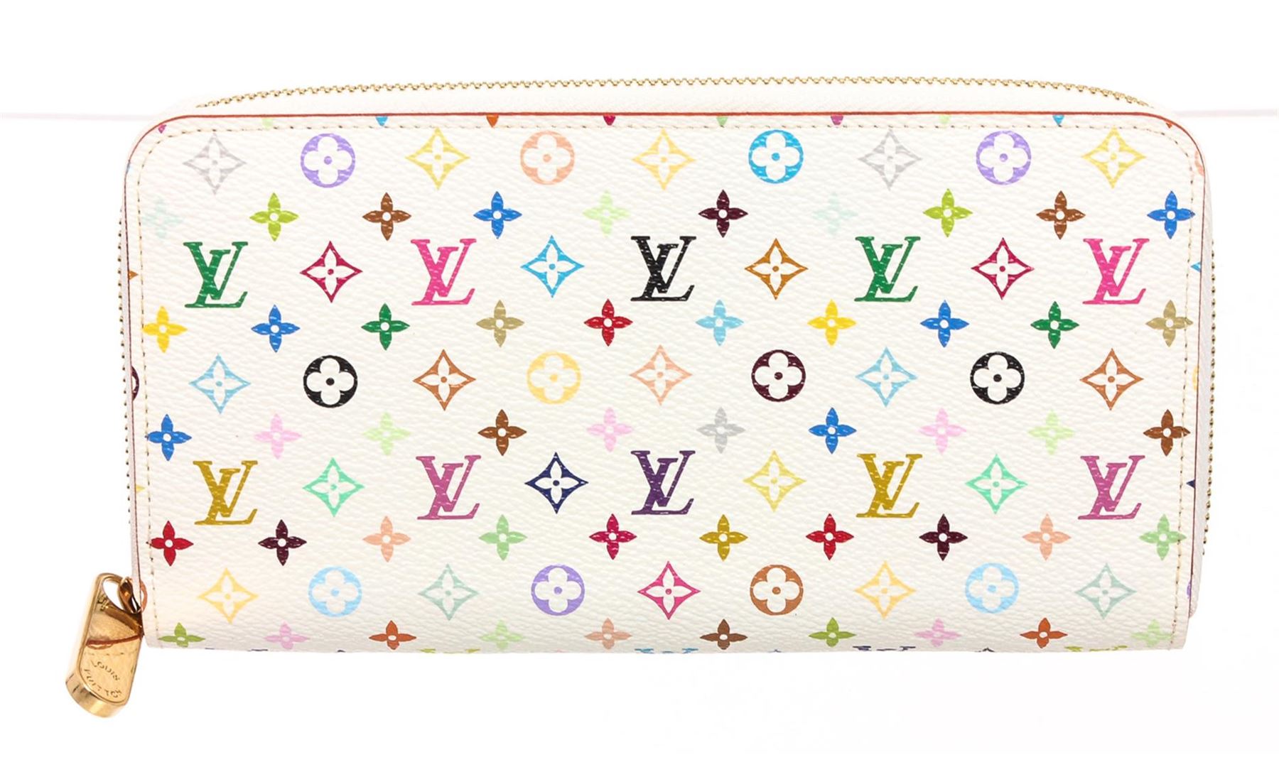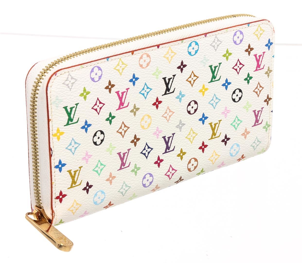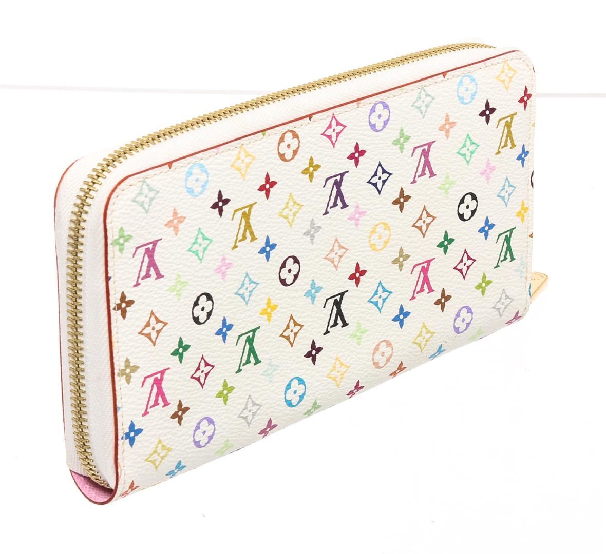 White and multicolor Monogram Multicolore coated canvas Louis Vuitton Zippy wallet with brass hardware, three interior compartments, pink Taiga leather lining, four interior bill compartments, single interior zip coin compartment, eight interior card slots and zip-around closure at exterior.