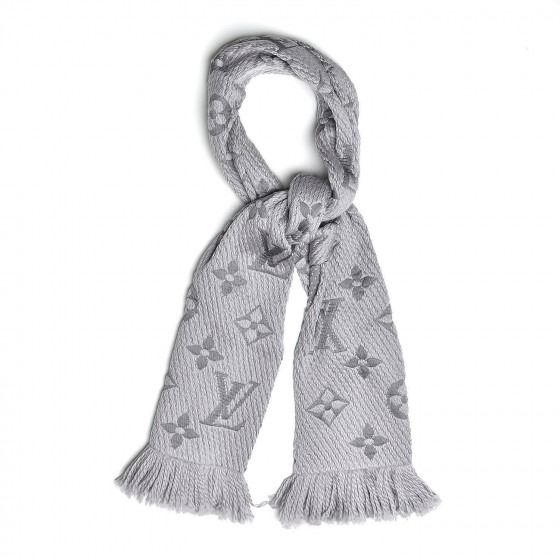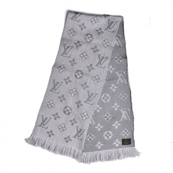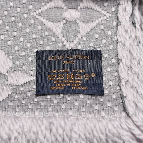 Pearl Grey scarf features the traditional Louis Vuitton monogram print in grey with fringe trim. The scarf is crafted of 94% wool and 6% silk .