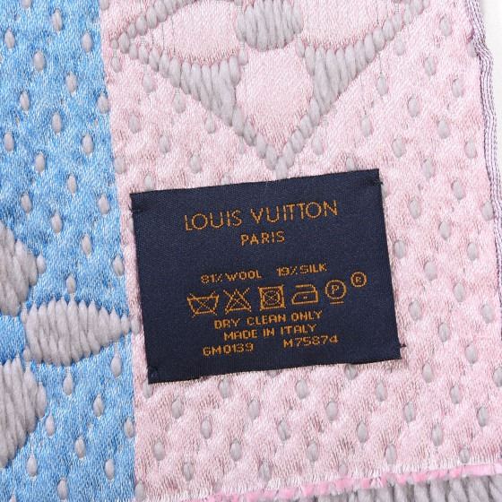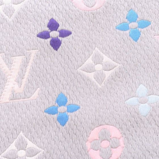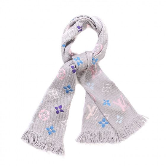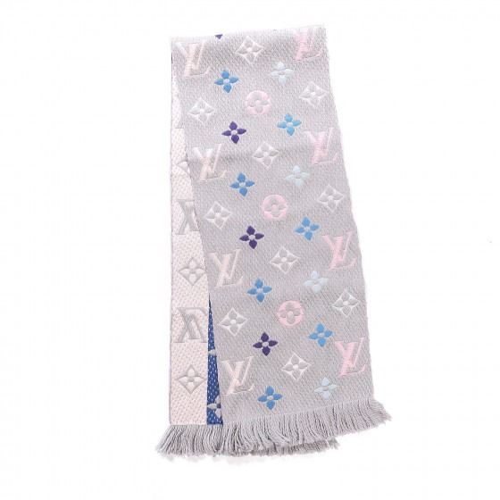 Pearl Grey scarf is crafted 81% wool and 19% silk in grey. It features the traditional monogram print in multi colors and matching grey fringe edges.
