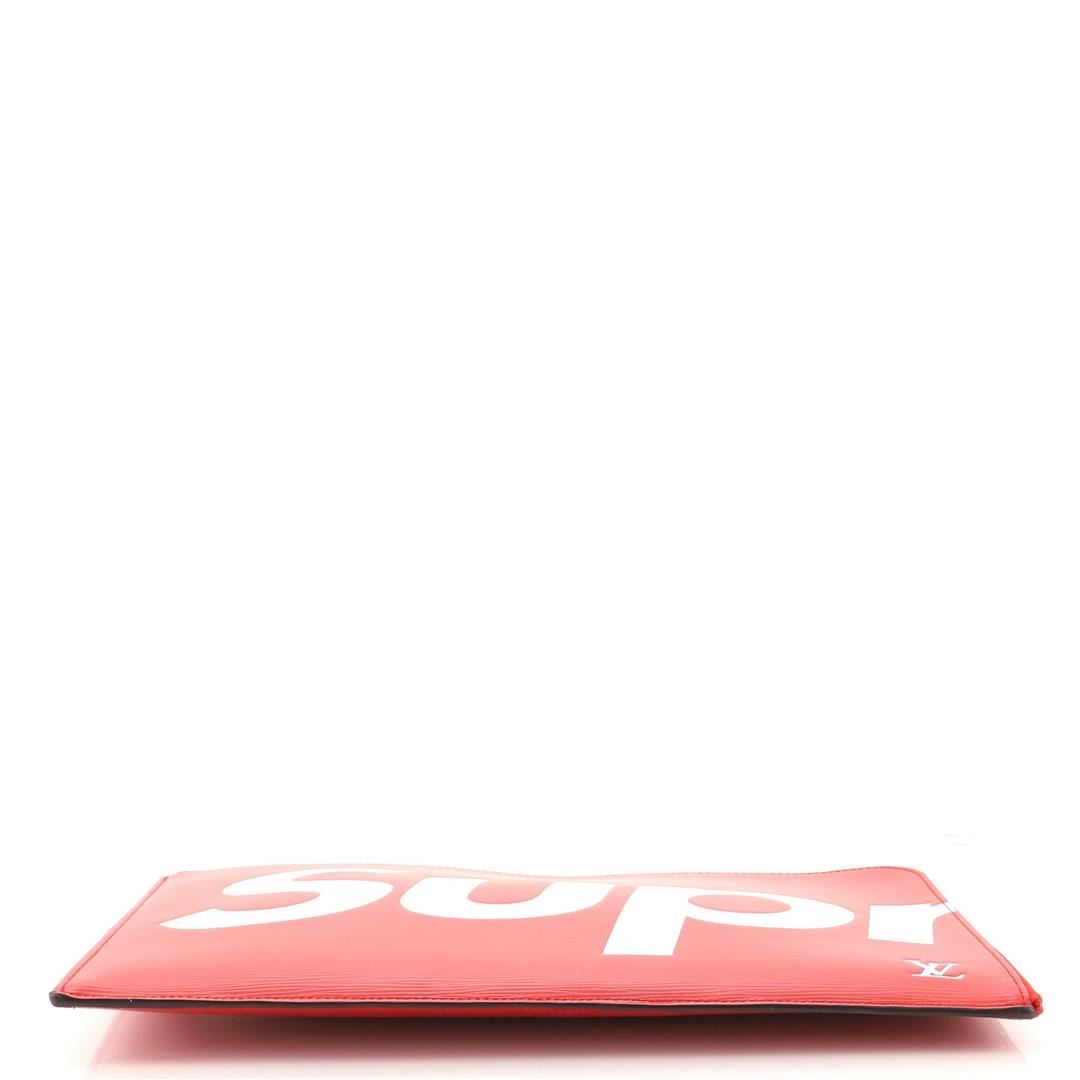 One Louis Vuitton X Supreme Red Epi Leather Pochette Jour Limited Edition GM Pouch. Item is sold AS-IS. All available information is listed in the description and shown in the photo. Louis Vuitton Red Epi Leather Pochette Jour Limited Edition with Supreme with silver-tone hardware, cowhide-leather lining, interior slip pocket and L-zipper closure. Height 10", Width 13.5", Depth 1"