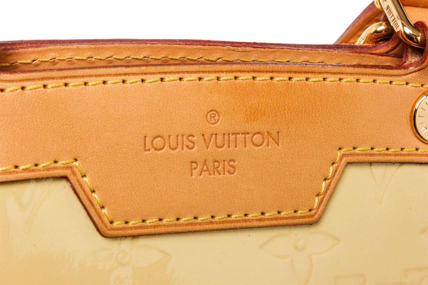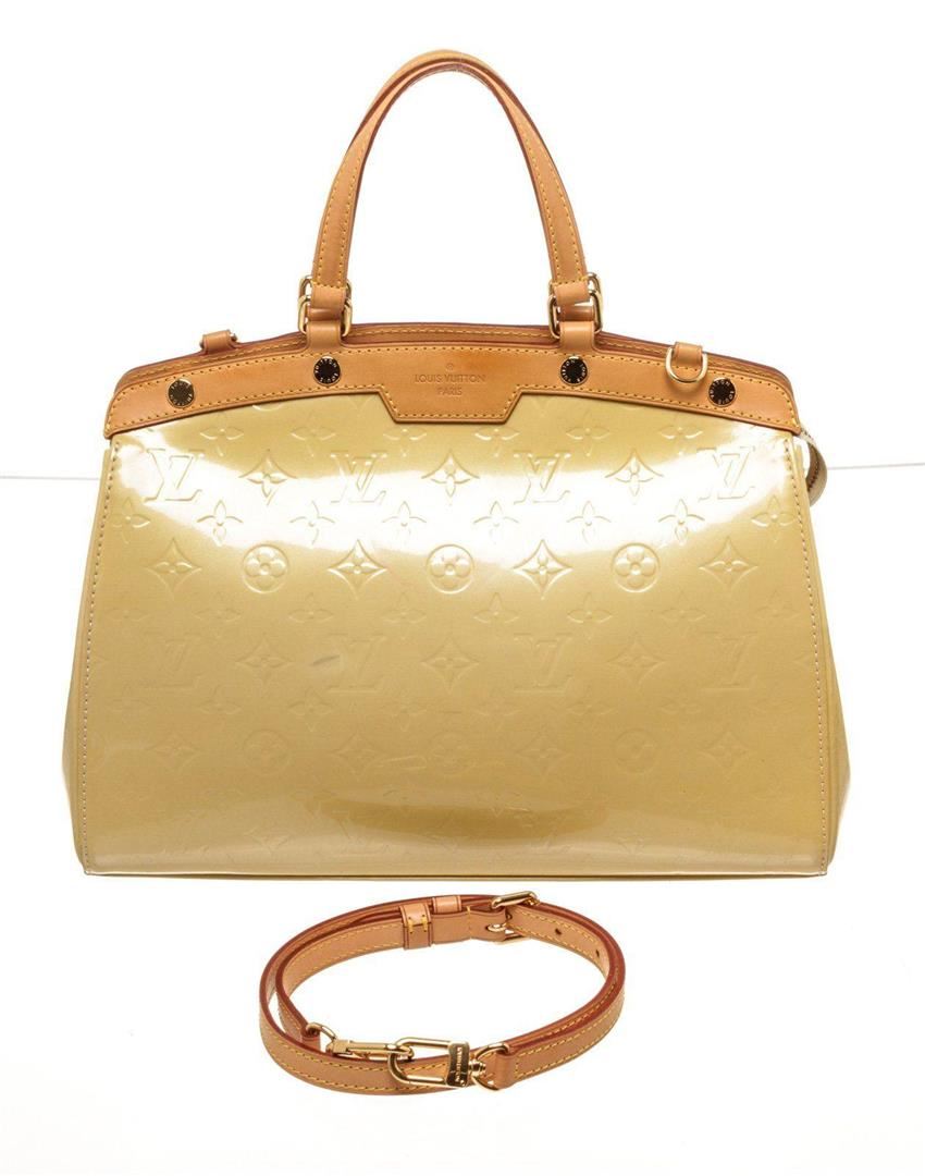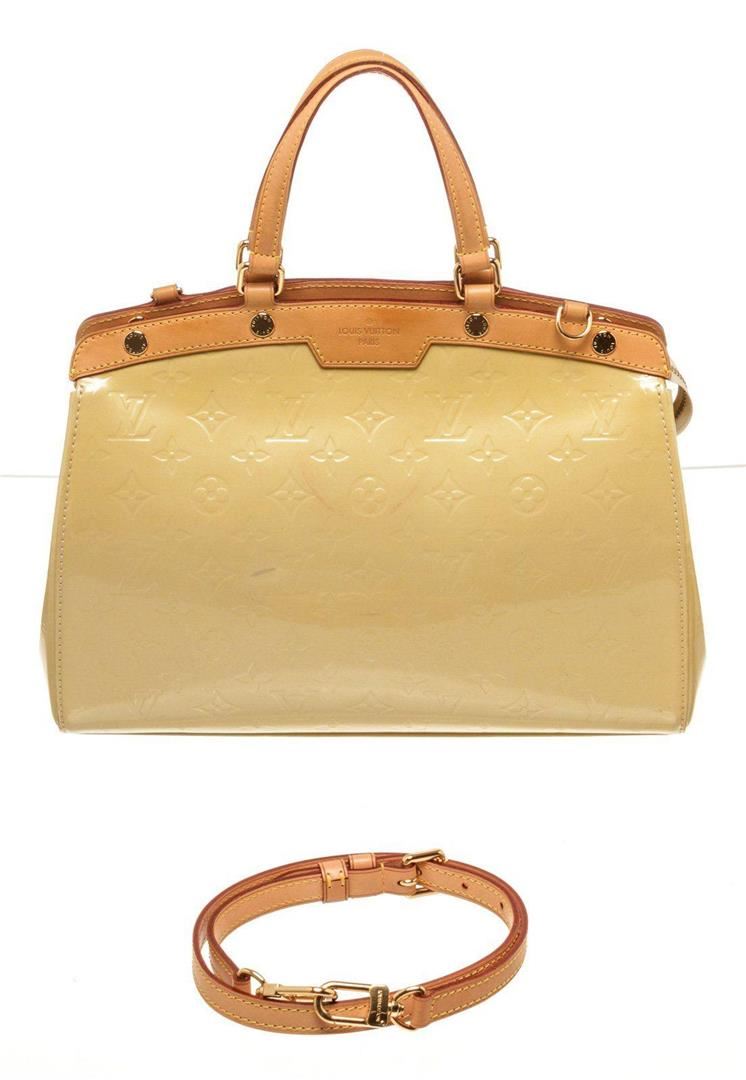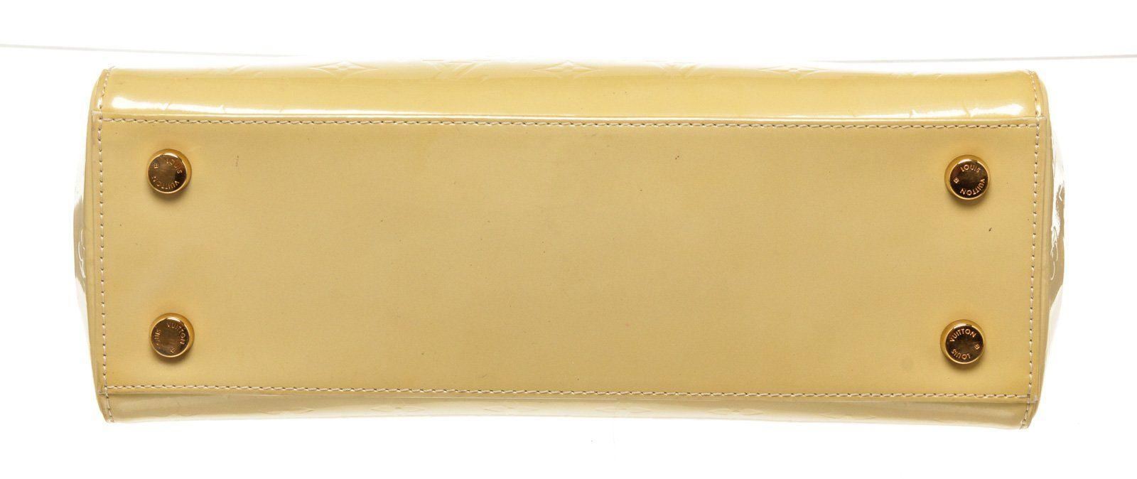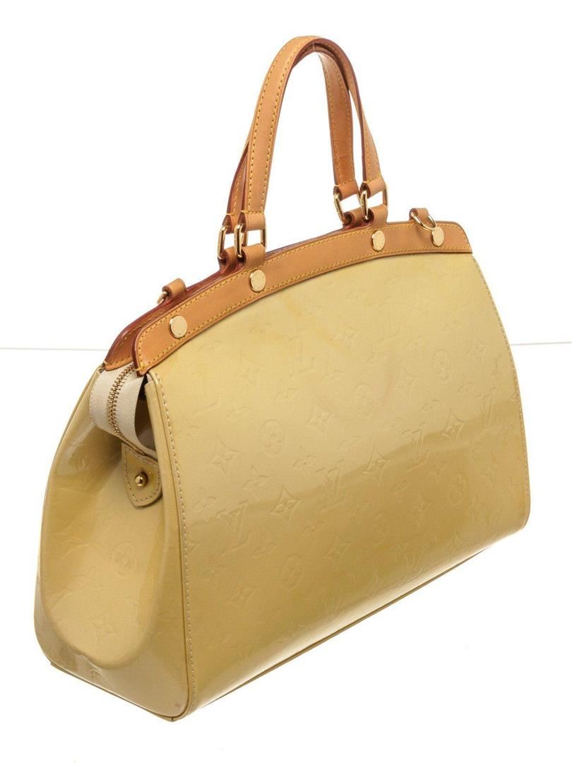 Louis Vuitton Yellow Brea MM Shoulder Bag with material vernis leather, gold-tone hardware, trim tan vachetta leather, interior three compartments pocket, dual top handle, and zip closure.