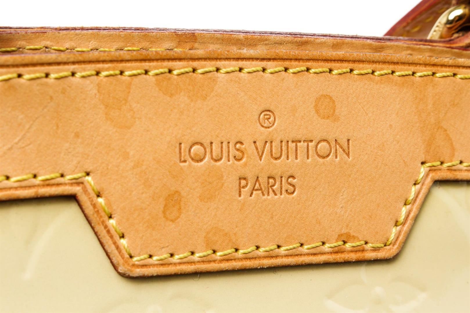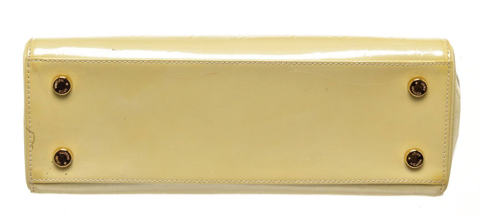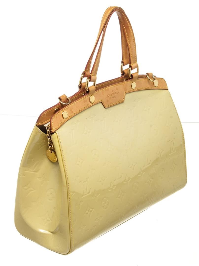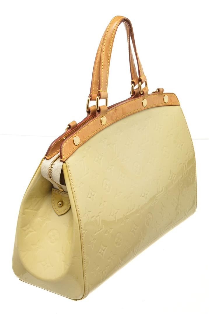 Louis Vuitton Yellow Brea MM Shoulder Bag with vernis leather, gold-tone hardware, trim tan vachetta leather, interior three compartments pocket, dual top handle, and zipper closure.