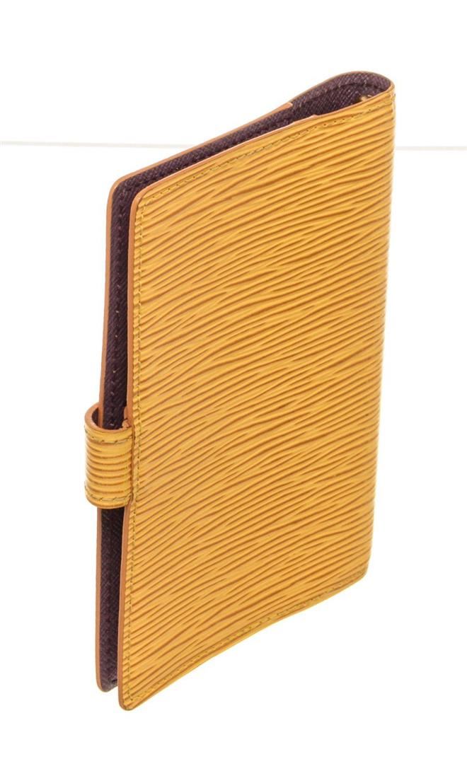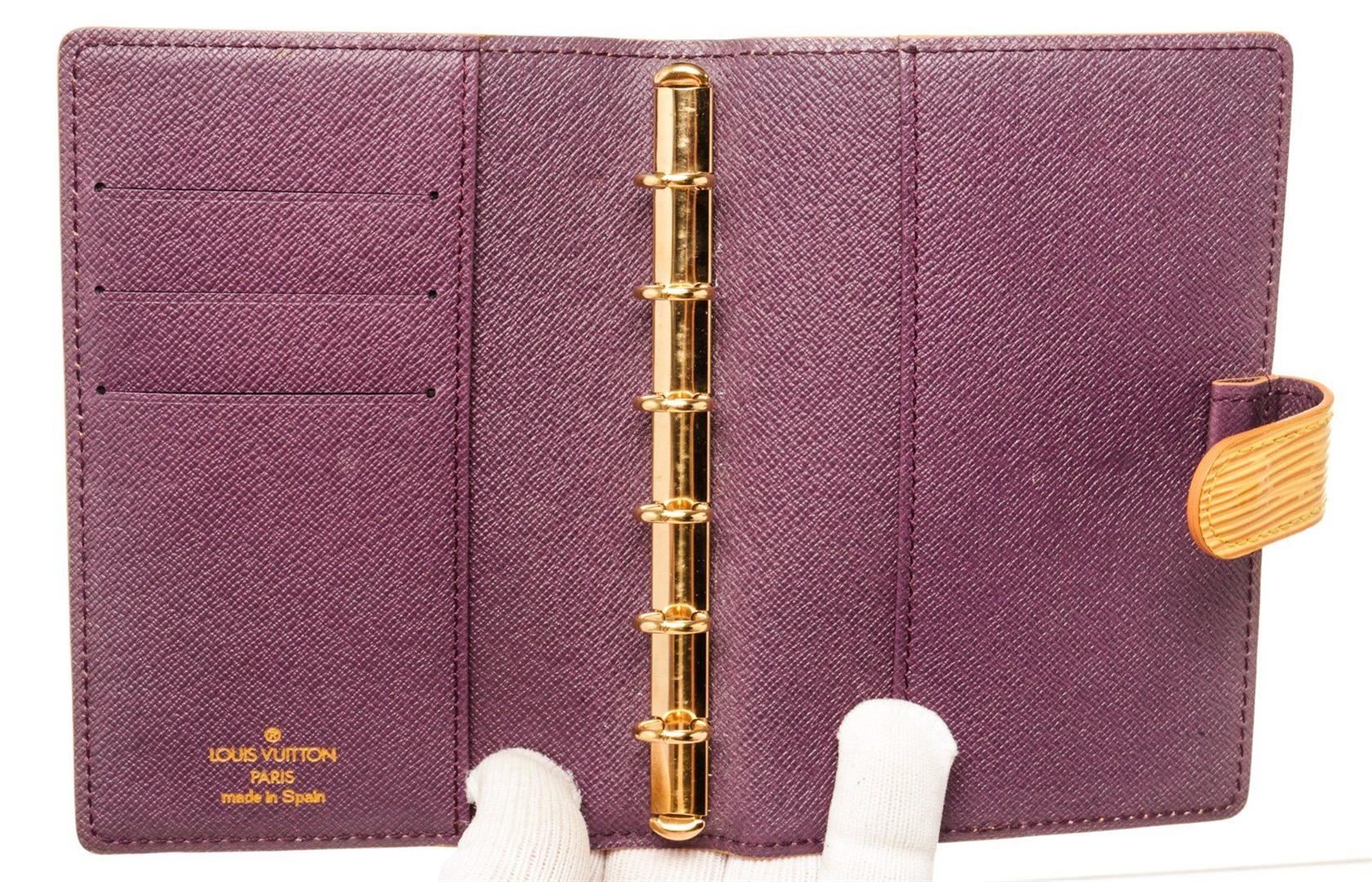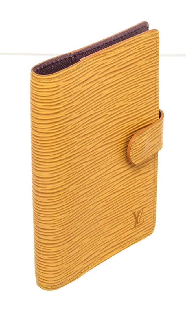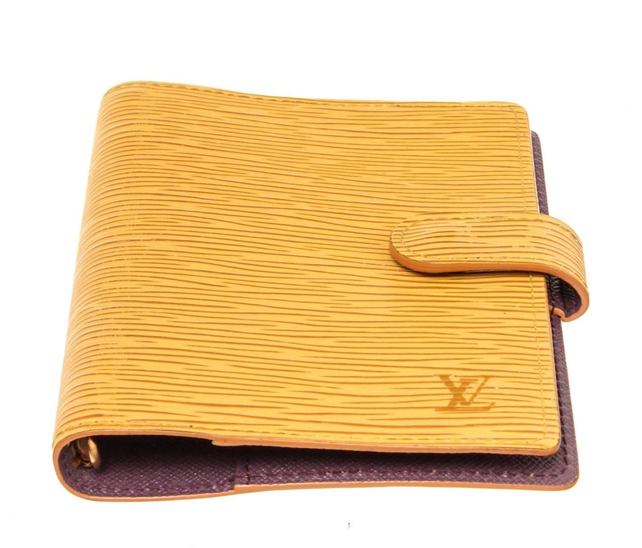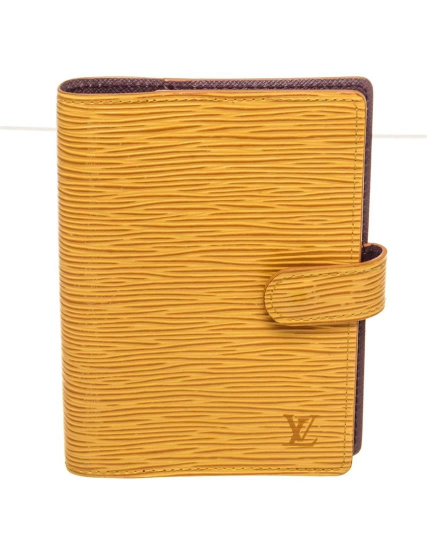 Louis Vuitton Yellow Epi Leather Agenda PM Wallet With gold-tone hardware, epi leather, trim tan vachetta leather, interior card holder pocket and snap closure.