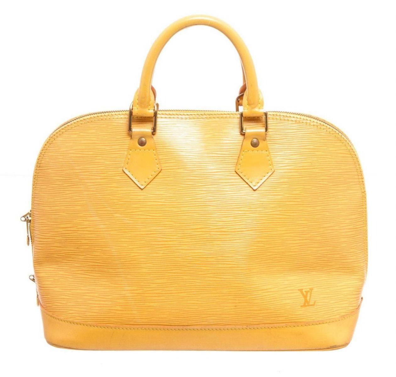 Louis Vuitton Yellow Epi Leather Alma MM Hobo Bag with gold-tone hardware, tan Vachetta leather trim, interior zip pockets, dual top handle, and zipper closure. Measurements: Length: 5.75 in / 15 cm Width: 9.25 in / 23 cm 9.25 in / 23 cmCONDITION: Pre-Owned Good overall, please see photographs for detail.
