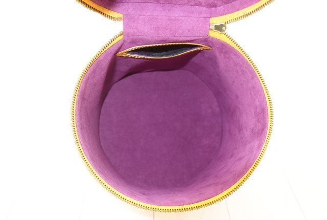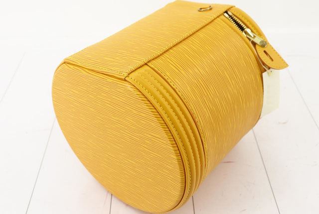 Yellow Epi leather Louis Vuitton Cannes bucket bag with gold-tone hardware, single flat top handle, pink Alcantara lining, single slit pocket at interior wall and zip-around closure at top. 8"x6"x7.5"xBag Drop:4"/mx15.2cmx19cmxBag Drop:10.1cm