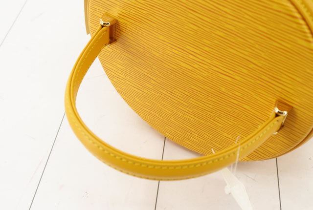 Yellow Epi leather Louis Vuitton Cannes bucket bag with gold-tone hardware, single flat top handle, pink Alcantara lining, single slit pocket at interior wall and zip-around closure at top. 8"x6"x7.5"xBag Drop:4"/mx15.2cmx19cmxBag Drop:10.1cm