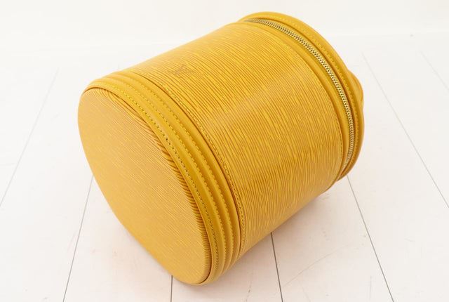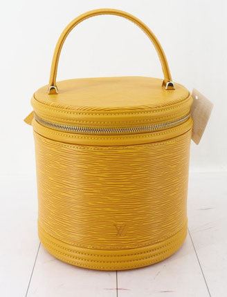 Yellow Epi leather Louis Vuitton Cannes bucket bag with gold-tone hardware, single flat top handle, pink Alcantara lining, single slit pocket at interior wall and zip-around closure at top. 8"x6"x7.5"xBag Drop:4"/mx15.2cmx19cmxBag Drop:10.1cm