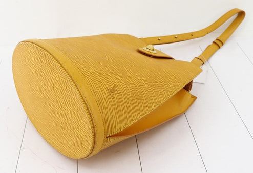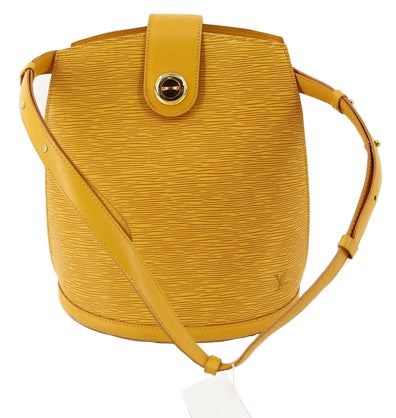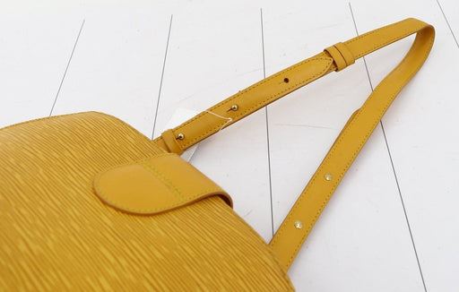 Yellow Epi leather Louis Vuitton Cluny shoulder bag with gold-tone hardware, single flat shoulder strap with peg-in-hole adjustment, embossed logo at front corner, tonal Alcantara lining, single pocket at interior wall and turn-lock closure at front flap.
