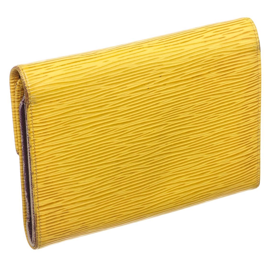 Louis Vuitton yellow Epi leather Compact Porte Tresor International Wallet with purple Taiga leather lining, two side pockets, six card slots, coin pouch, snap closure. Authentic.