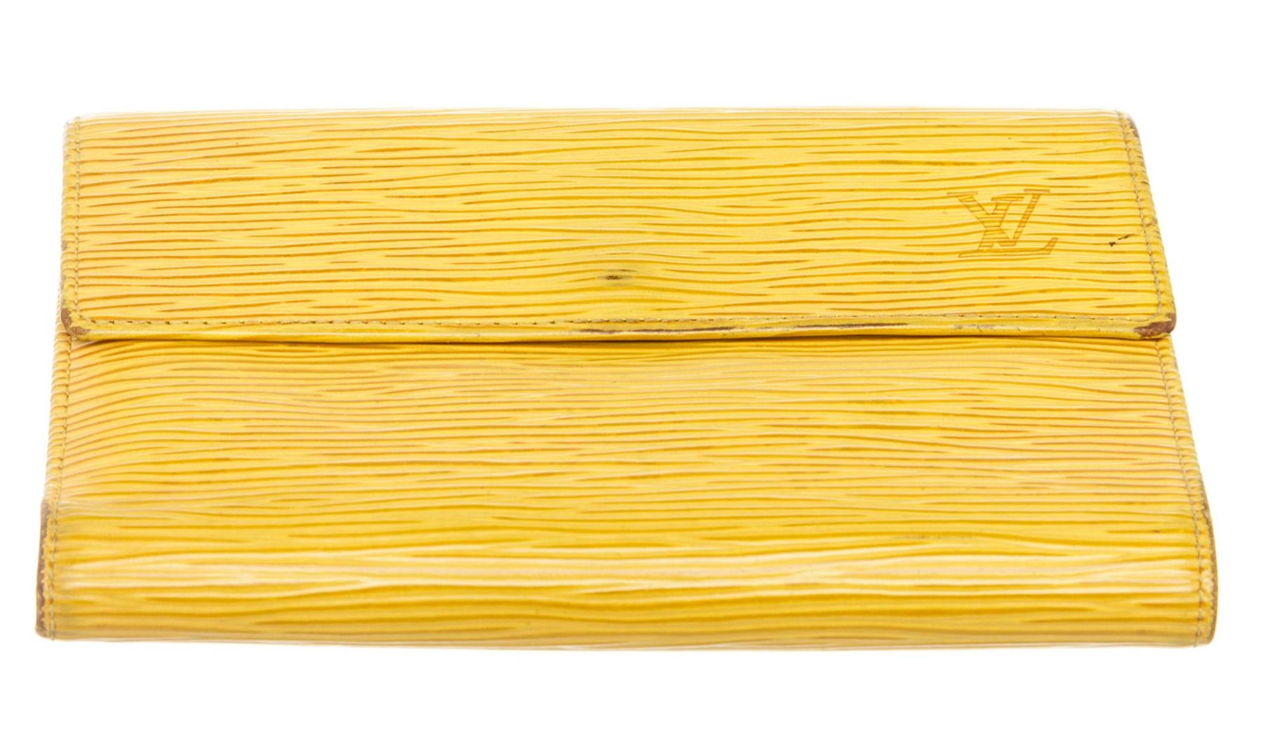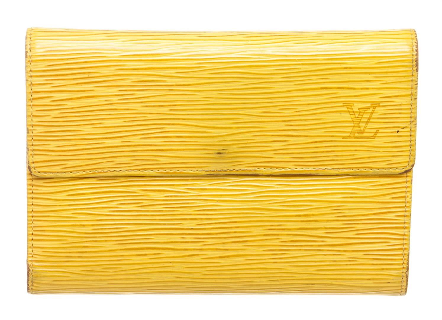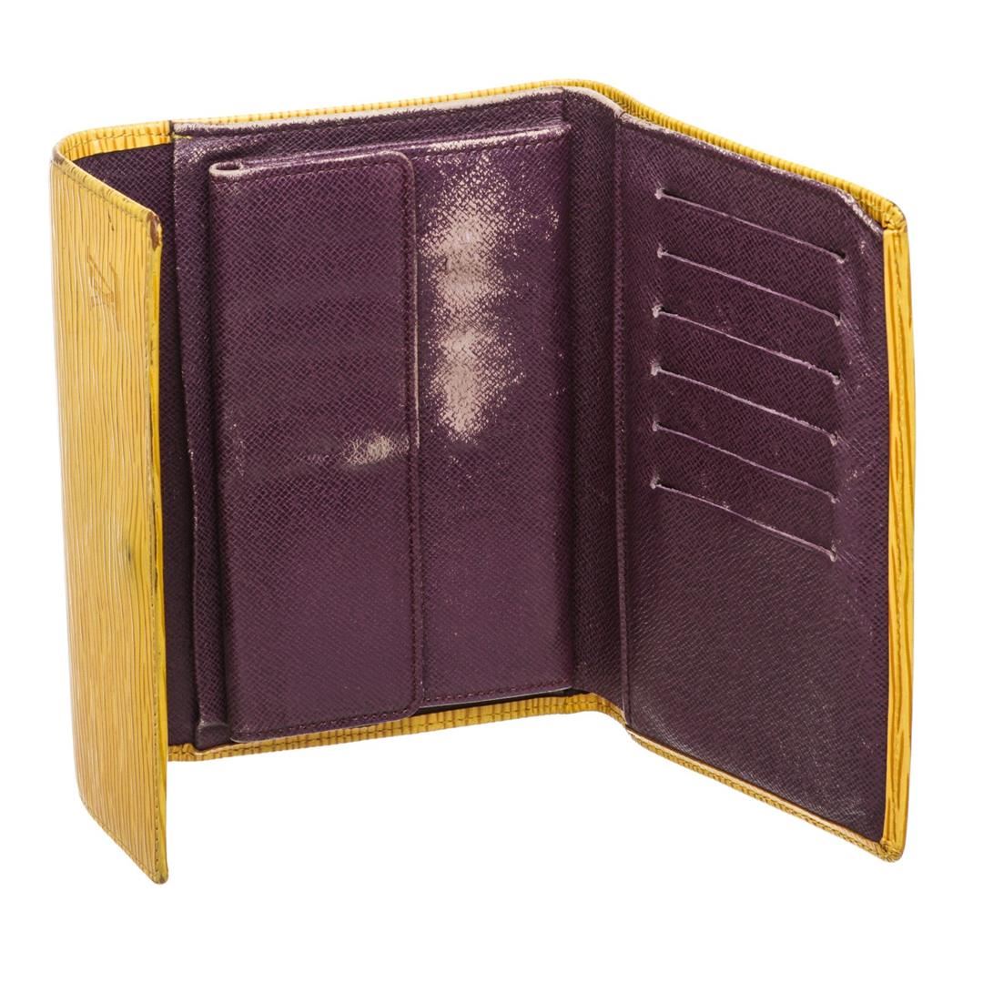 Louis Vuitton yellow Epi leather Compact Porte Tresor International Wallet with purple Taiga leather lining, two side pockets, six card slots, coin pouch, snap closure. Authentic.