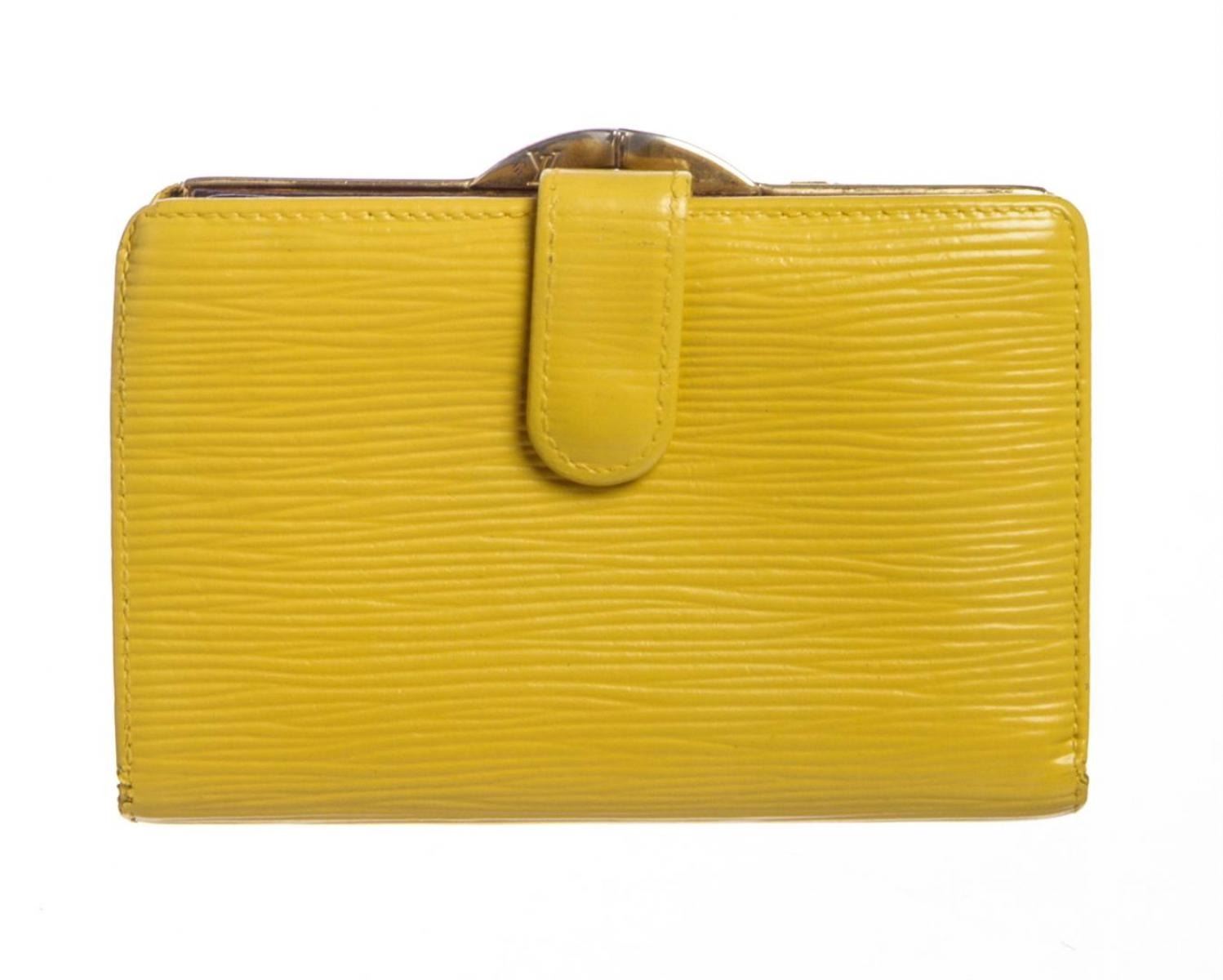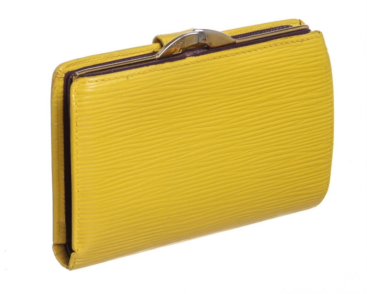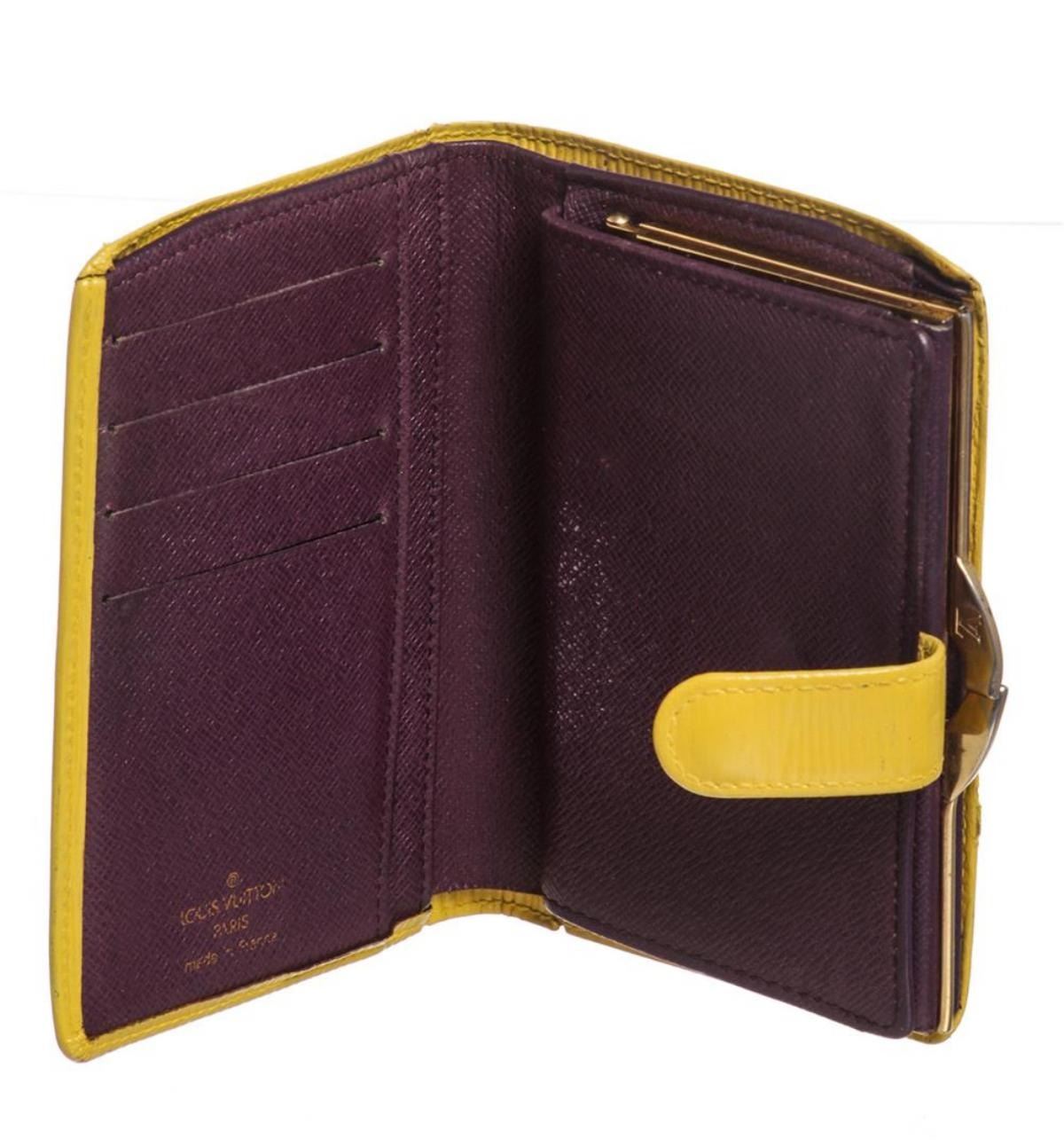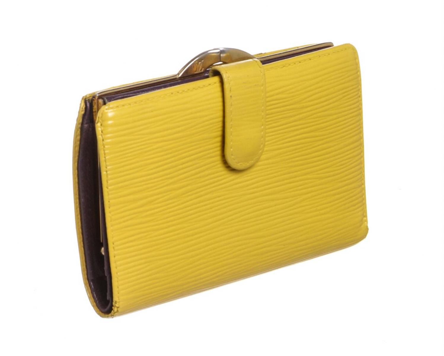 Yellow Epi leather Louis Vuitton French purse wallet with brushed silver-tone hardware, embossed logo at corner, kiss lock compartment at exterior, purple leather lining, single interior bill compartment, dual interior slit pockets, four card slots at interior wall and snap closure at front.