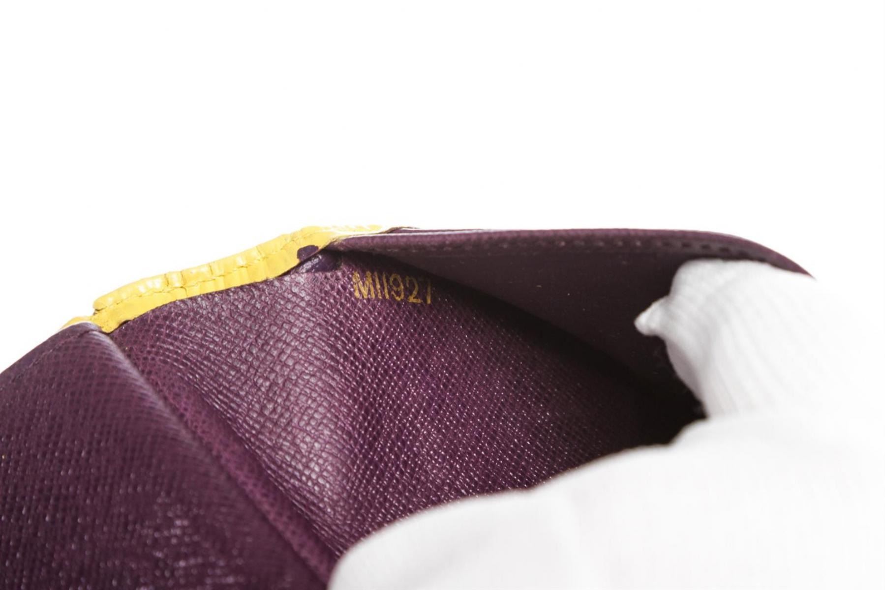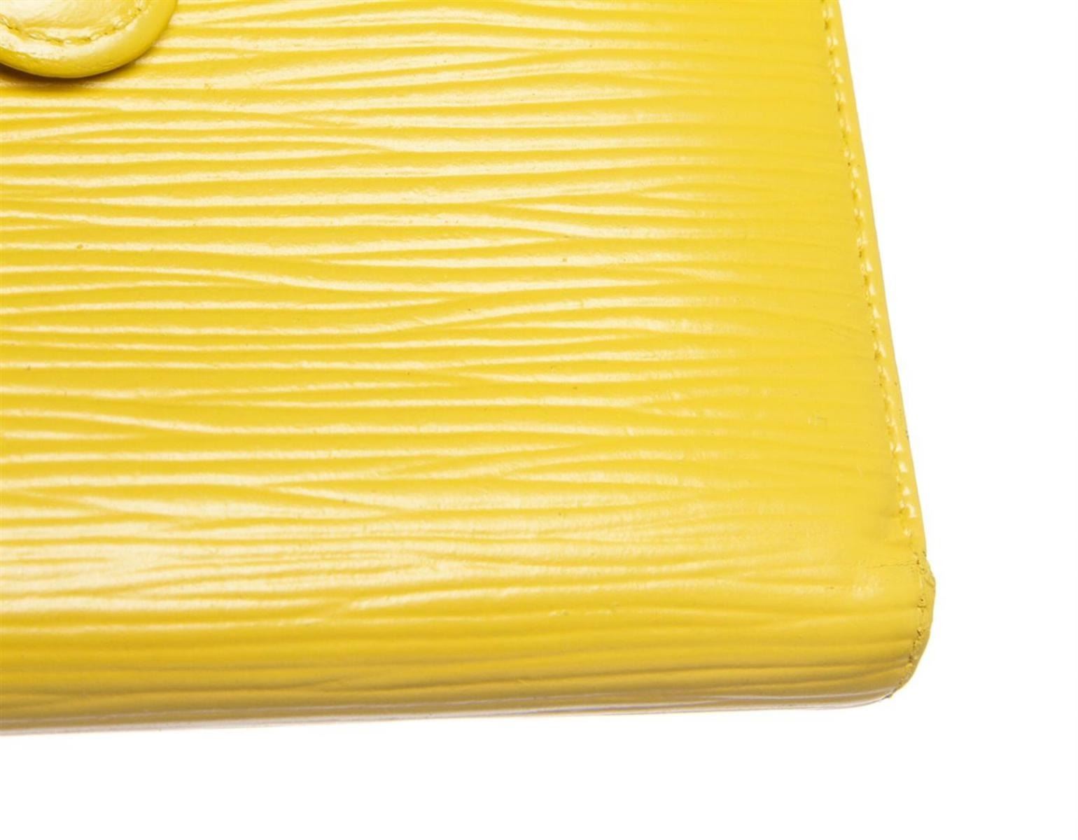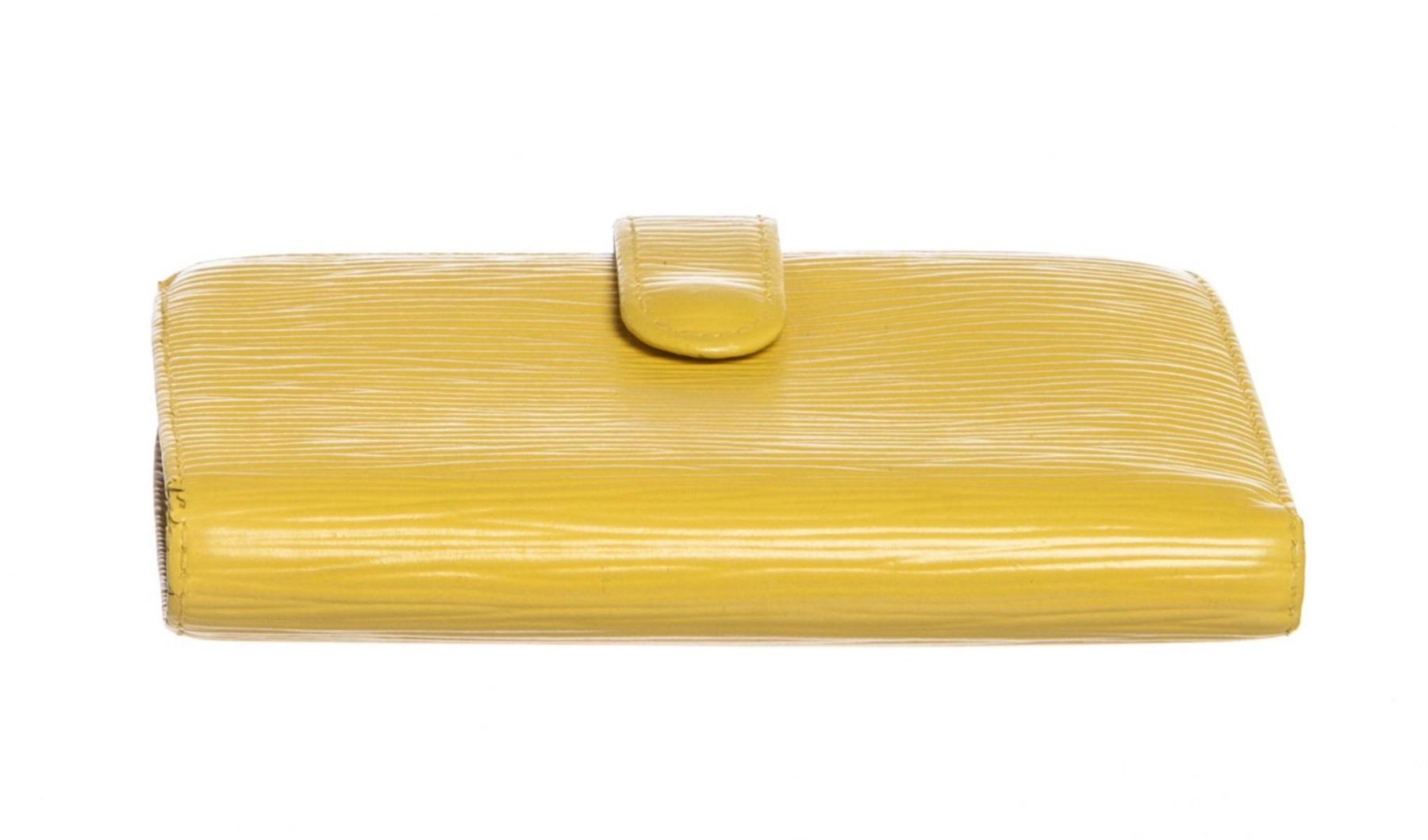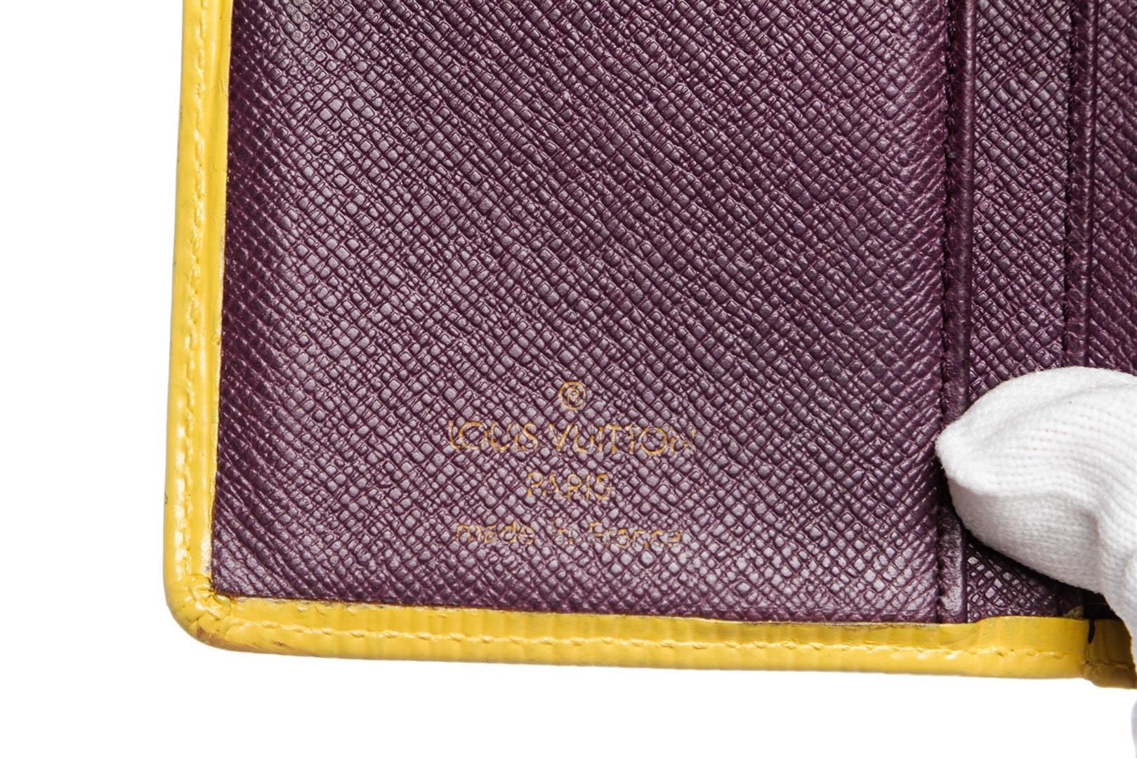 Yellow Epi leather Louis Vuitton French purse wallet with brushed silver-tone hardware, embossed logo at corner, kiss lock compartment at exterior, purple leather lining, single interior bill compartment, dual interior slit pockets, four card slots at interior wall and snap closure at front.