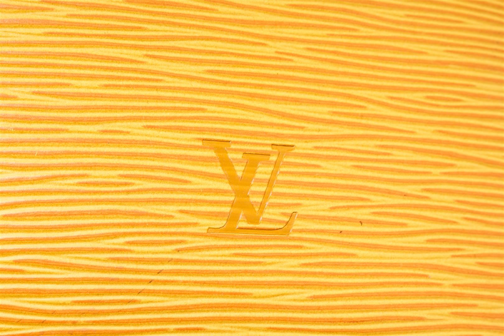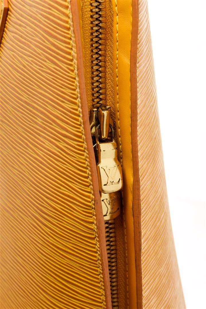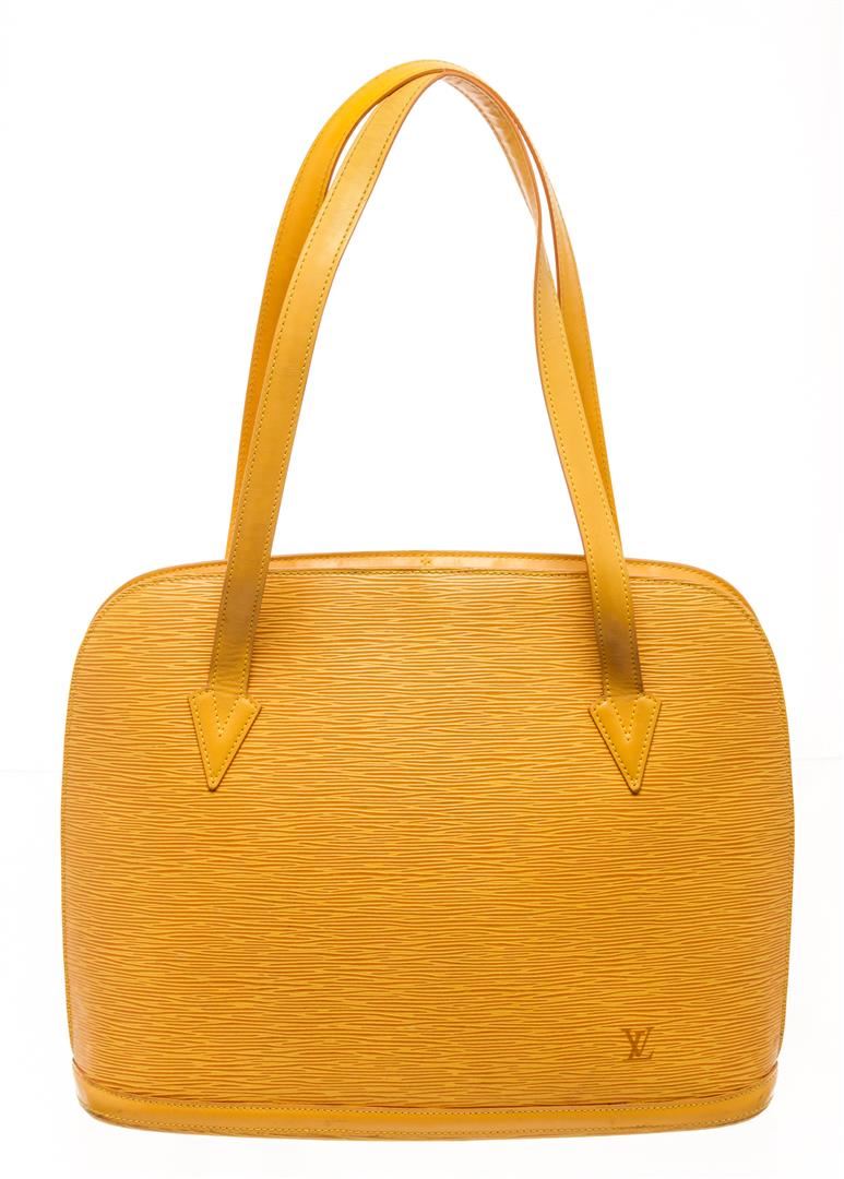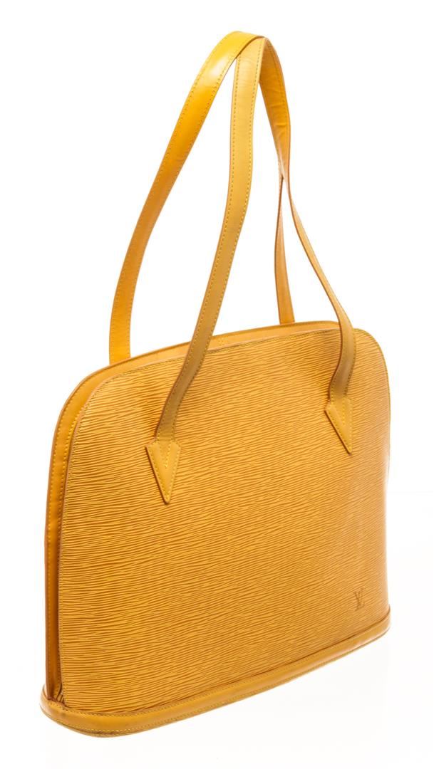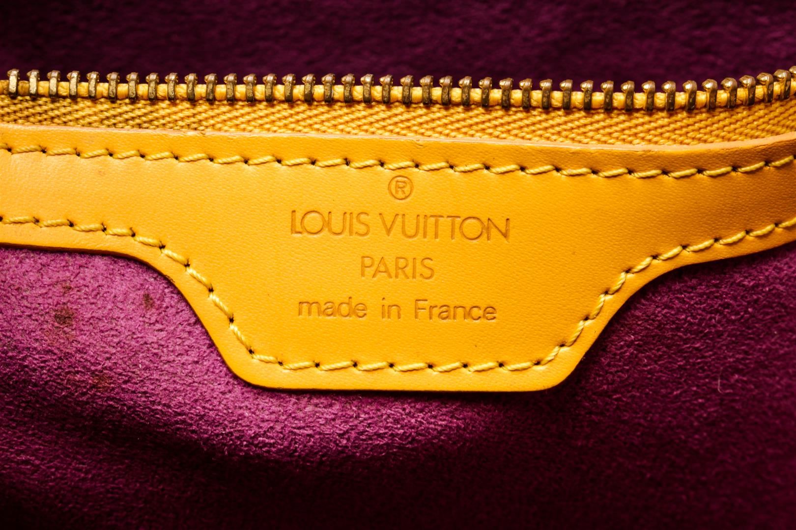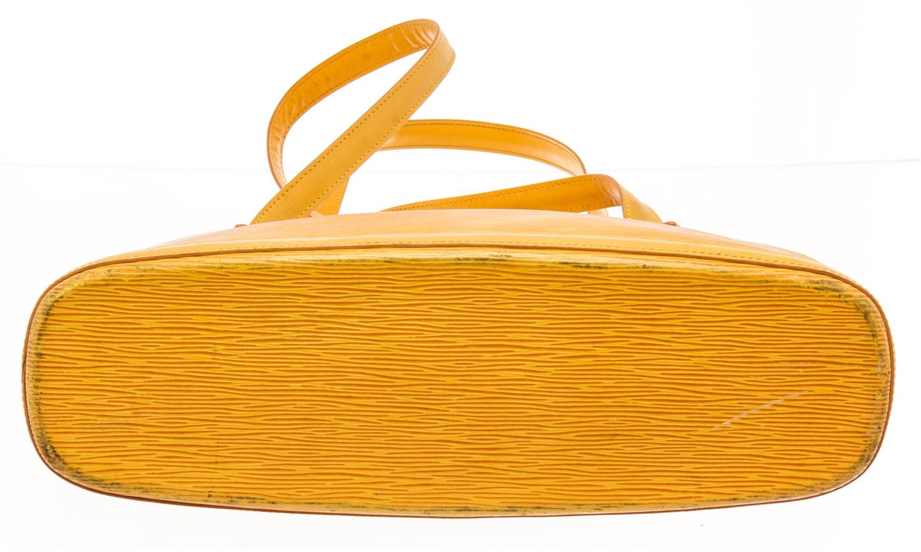 One Louis Vuitton Yellow Epi Leather Lussac Shoulder Bag. Item is sold AS-IS. All available information is listed in the description and shown in the photo. Louis Vuitton Yellow Epi Leather Lussac Shoulder Bag with shoulder strap, purple suede lining, interior slip pocket, gold tone hardware, zipper closure. Depth 4.7 in, Width 15 in, Handle 11.8 in/ Depth 12 cm, Width 38 cm, Handle 30 cm