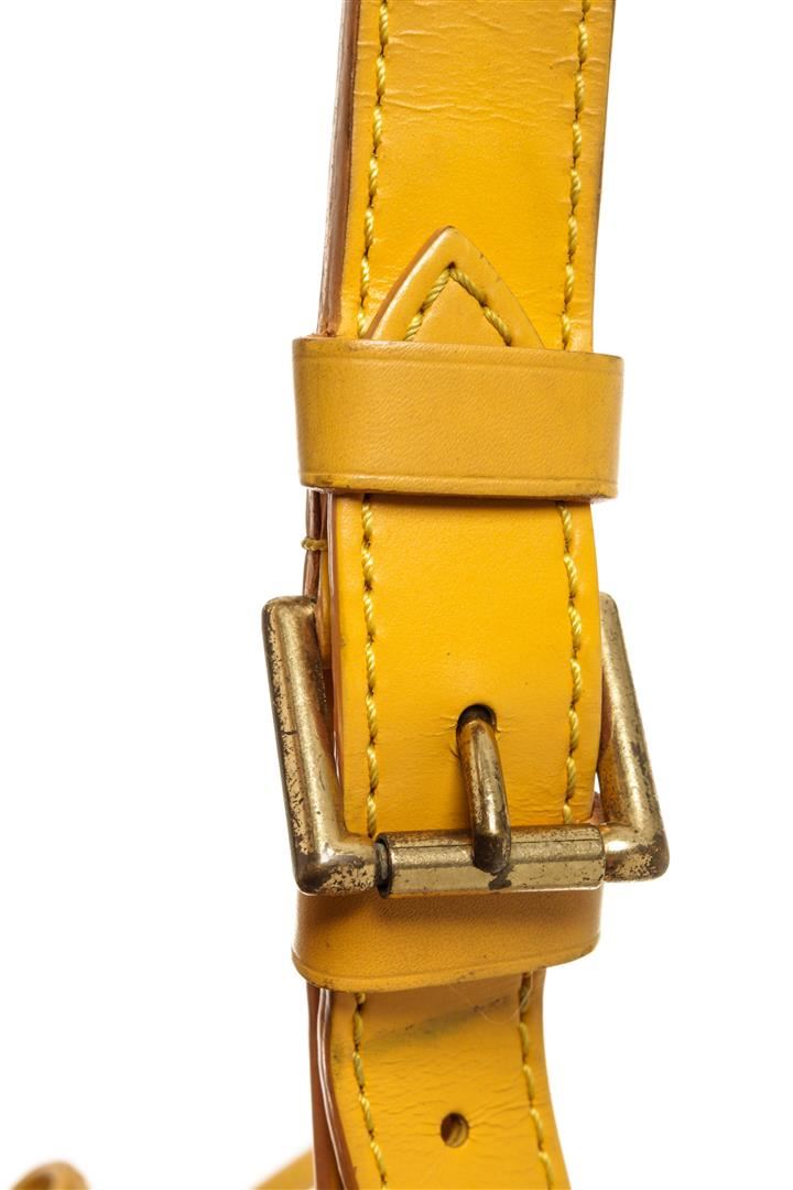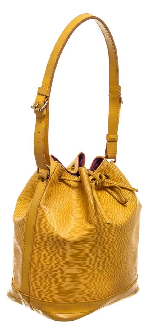 One Louis Vuitton Yellow Epi Leather Noe Bucket Bag. Item is sold AS-IS. All available information is listed in the description and shown in the photo. Louis Vuitton Yellow Epi Leather Noe Bag with gold-tone hardware, yellow leather trim, purple suede lining, single adjustable leather shoulder strap, and drawstring closure. .