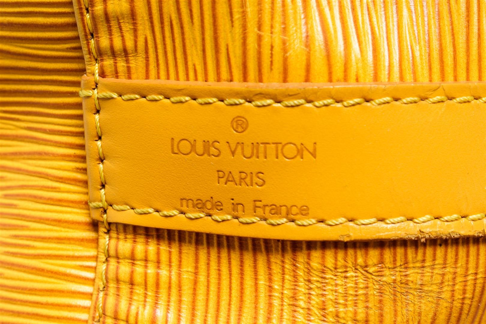 One Louis Vuitton Yellow Epi Leather Noe PM Bag. Item is sold AS-IS. All available information is listed in the description and shown in the photo. Louis Vuitton Yellow Epi Leather Petit Noe Bag with gold-tone hardware, yellow leather trim, four rounded holes at the base, purple suede lining, single adjustable leather shoulder strap, and drawstring closure. .