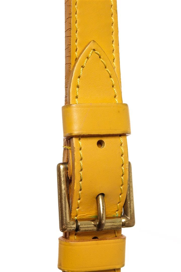 One Louis Vuitton Yellow Epi Leather Noe PM Bag. Item is sold AS-IS. All available information is listed in the description and shown in the photo. Louis Vuitton Yellow Epi Leather Petit Noe Bag with gold-tone hardware, yellow leather trim, purple suede lining, single adjustable leather shoulder strap, and drawstring closure. .