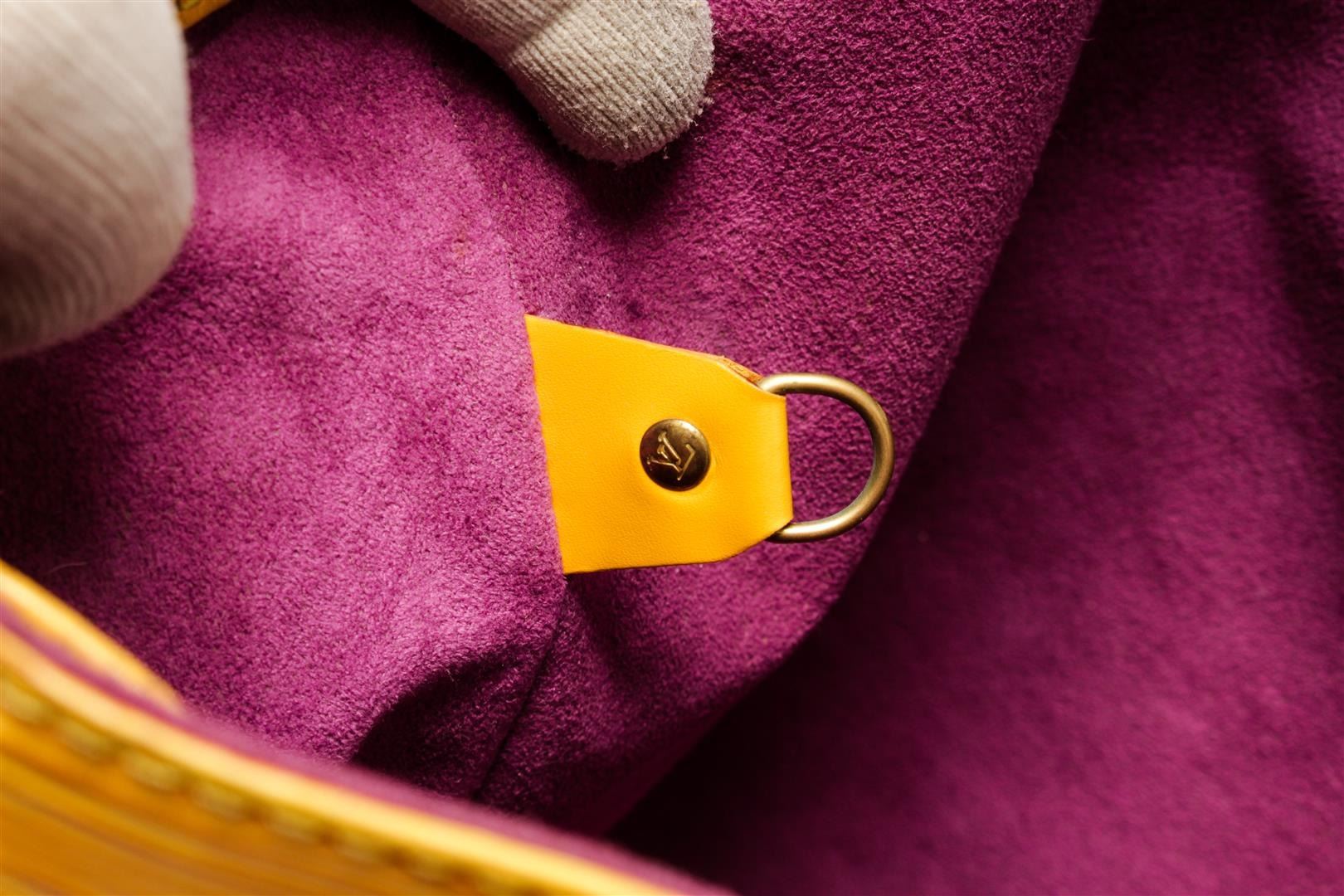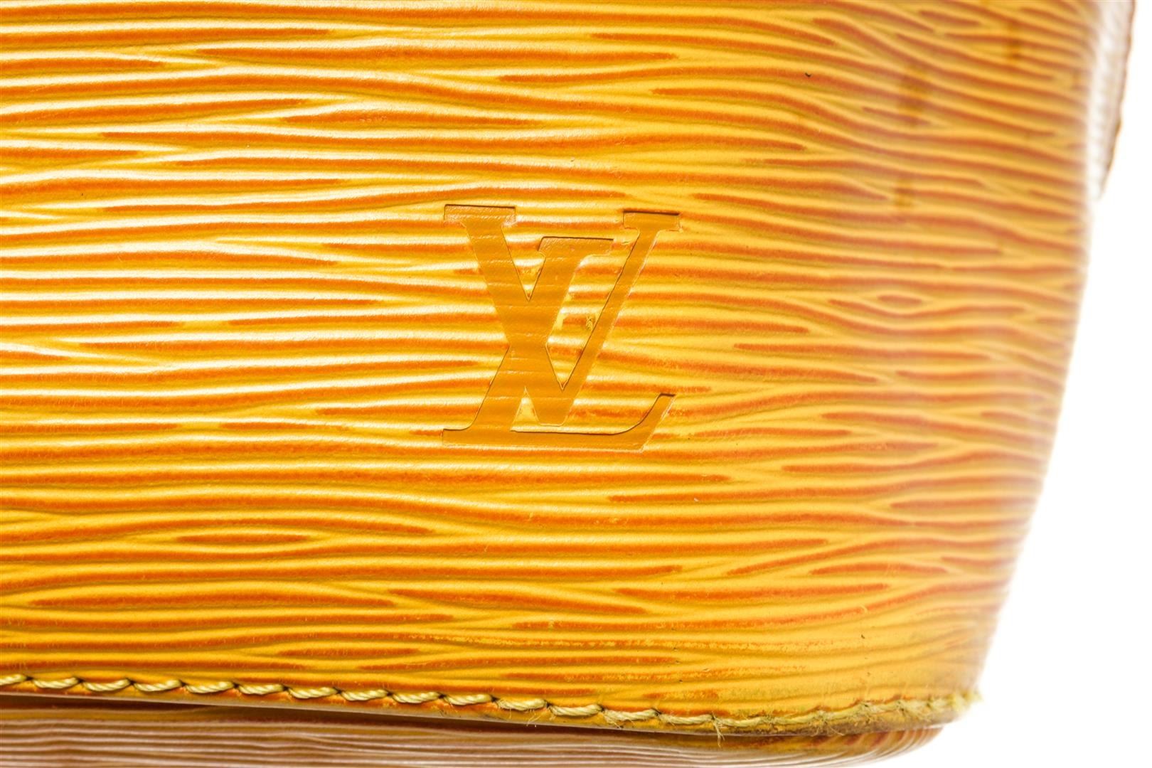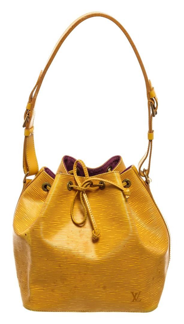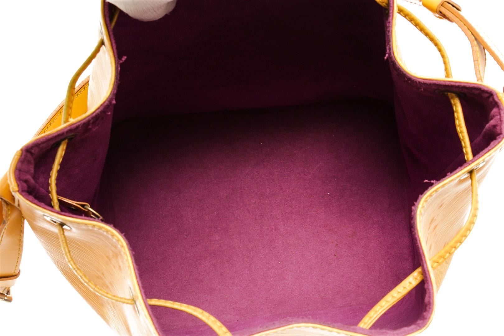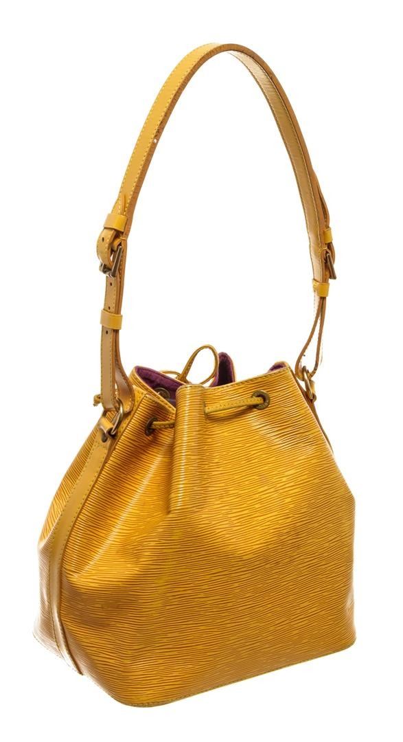 One Louis Vuitton Yellow Epi Leather Noe PM Bucket Bag. Item is sold AS-IS. All available information is listed in the description and shown in the photo. Yellow Epi leather Louis Vuitton Noe PM with gold-tone hardware, adjustable flat shoulder strap, fuchsia Alcantara lining and drawstring closure at top.