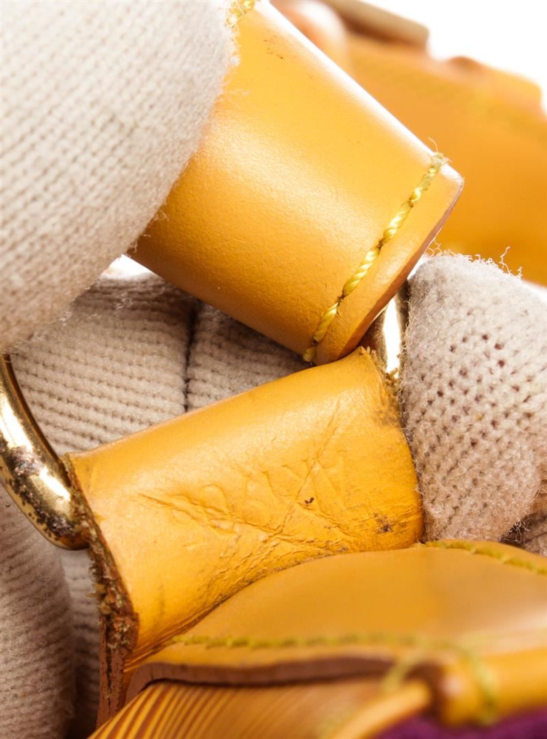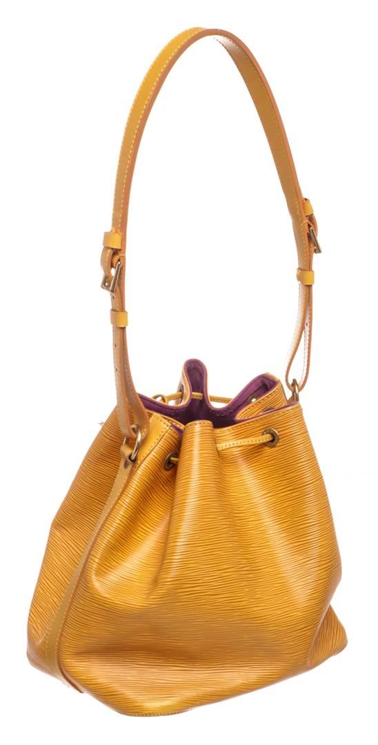 One Louis Vuitton Yellow Epi Leather Noe PM Drawstring Shoulder Bag. Yellow epi leather Louis Vuitton Noe PM with brass hardware, adjustable flat shoulder strap, tonal Alcantara lining and drawstring closure at top. CON