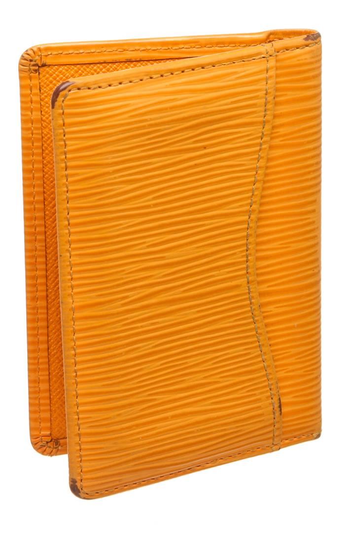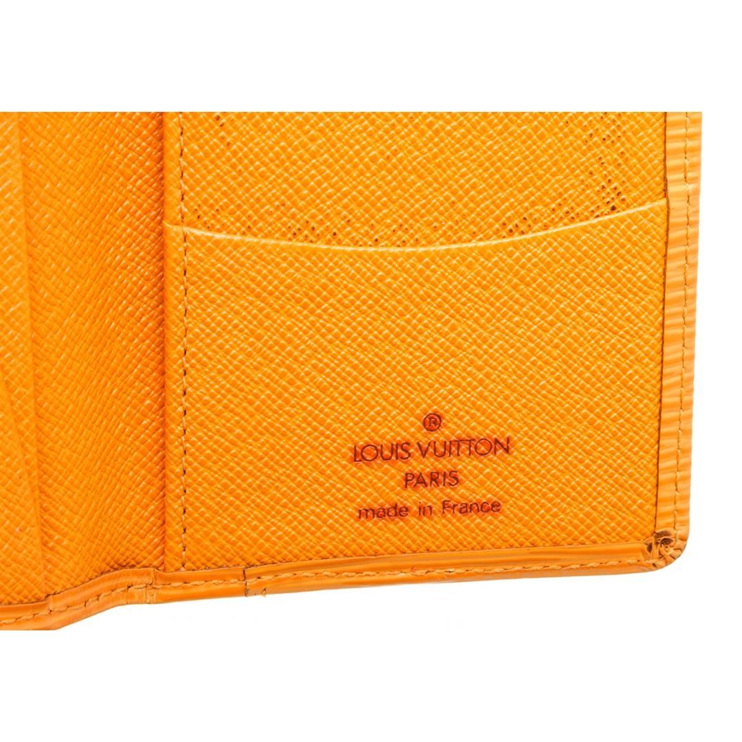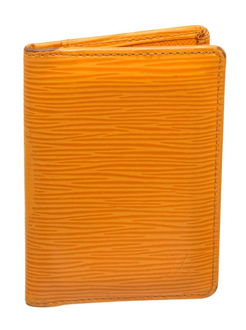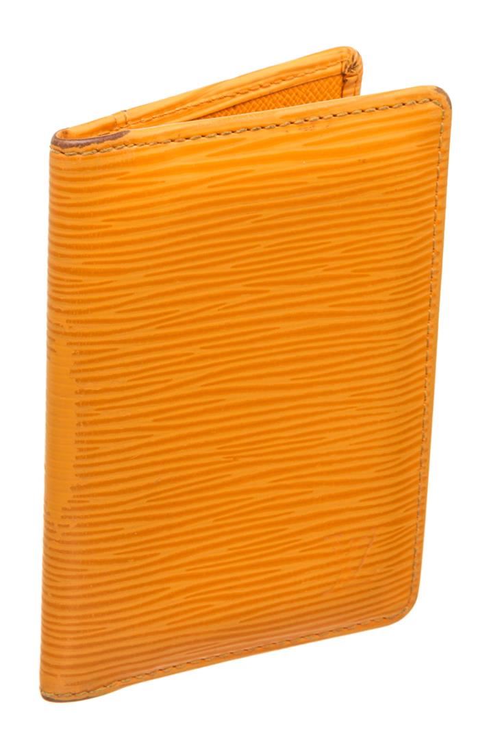 Yello Epi leather Louis Vuitton pocket organizer with debased logo at front corner, single exterior card slot, tonal textured leather lining, six interior card slots and fold closure at front. Authentic.
