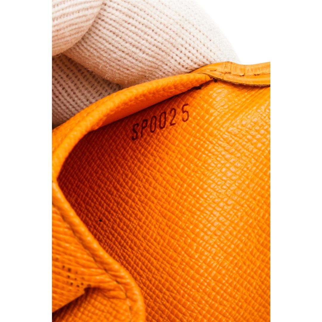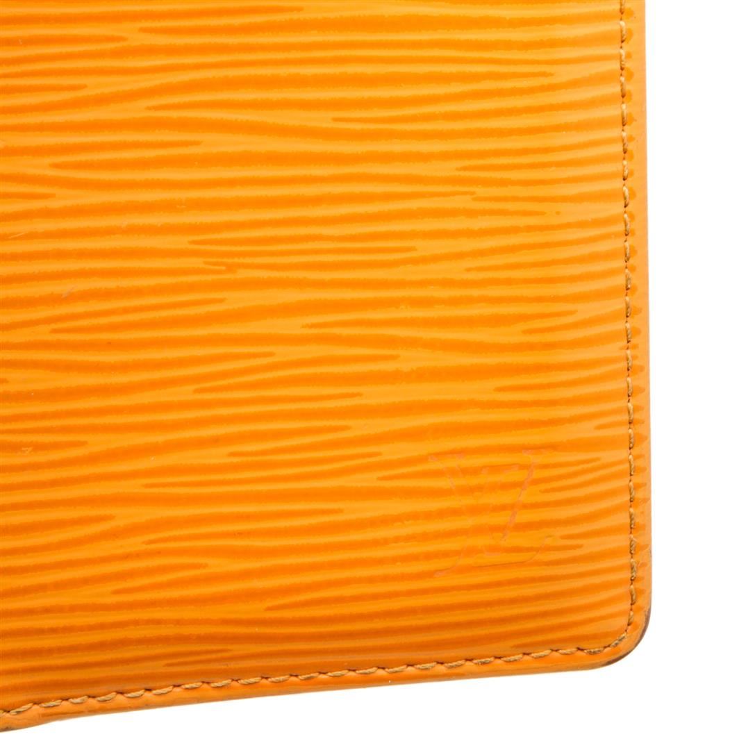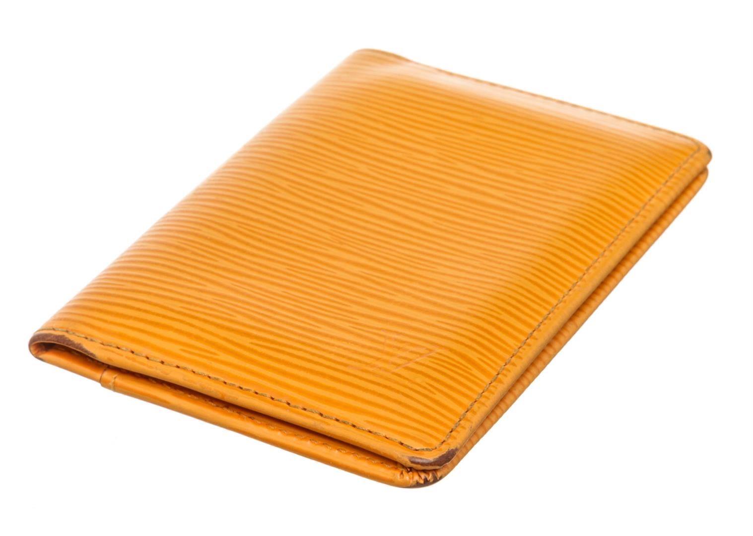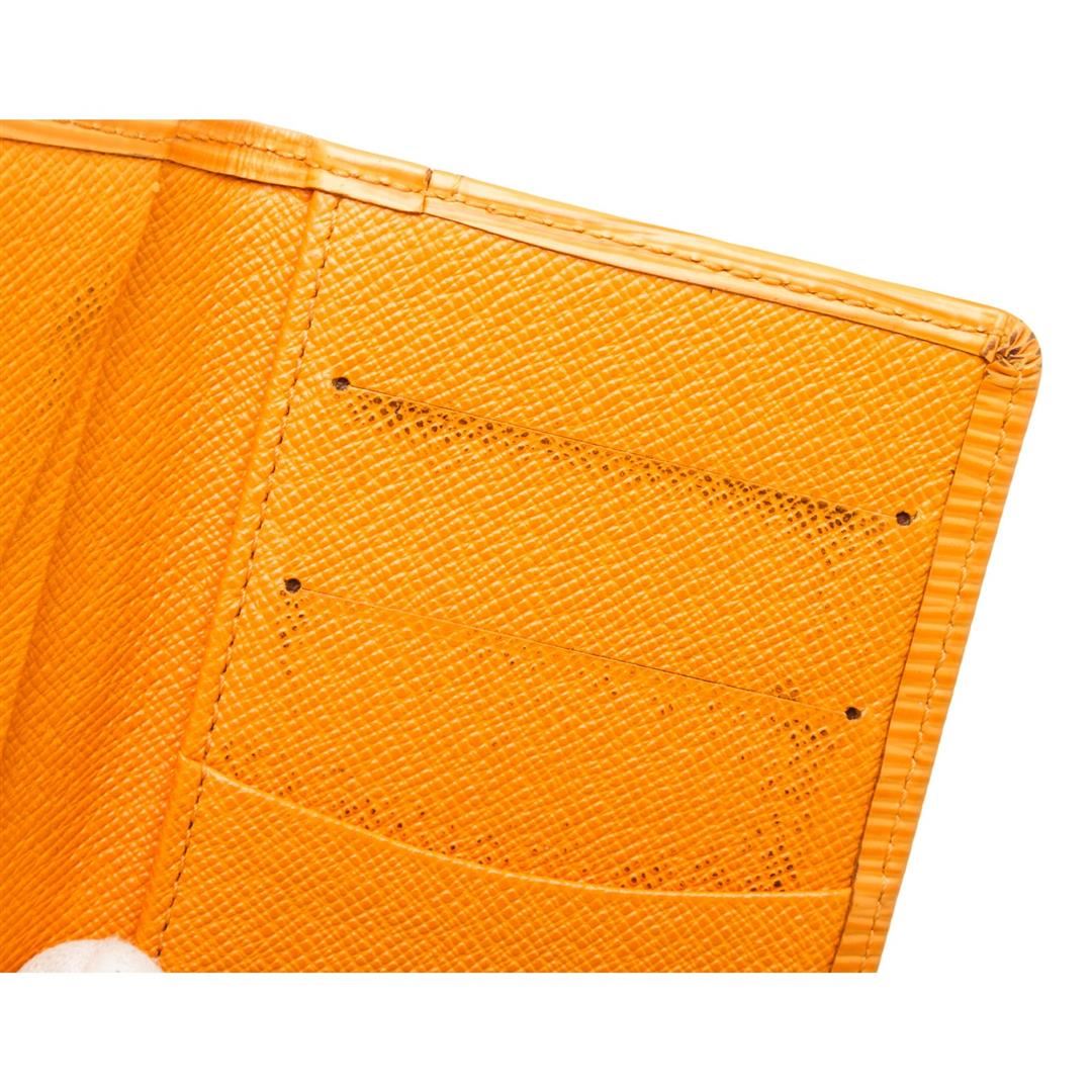 Yello Epi leather Louis Vuitton pocket organizer with debased logo at front corner, single exterior card slot, tonal textured leather lining, six interior card slots and fold closure at front. Authentic.