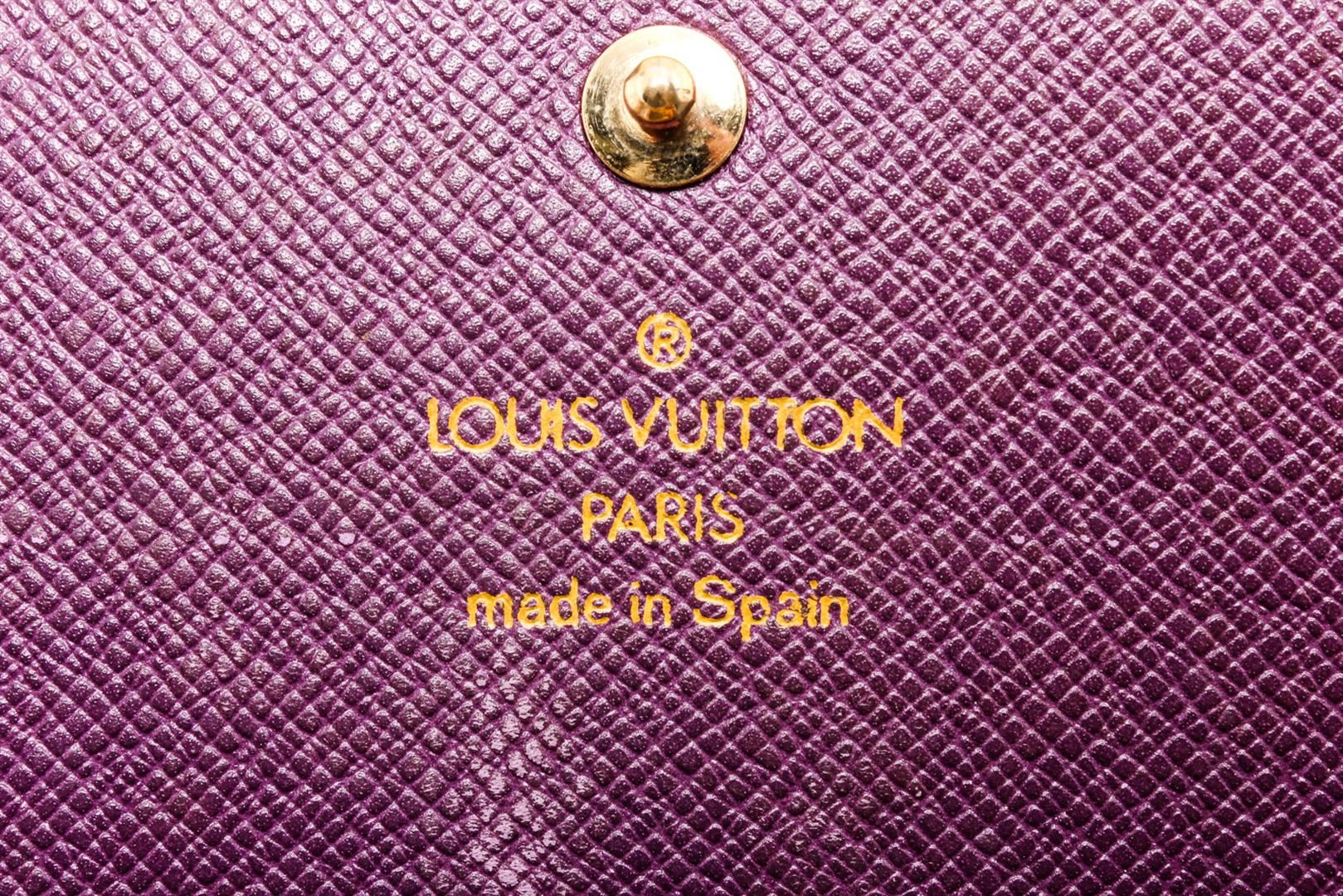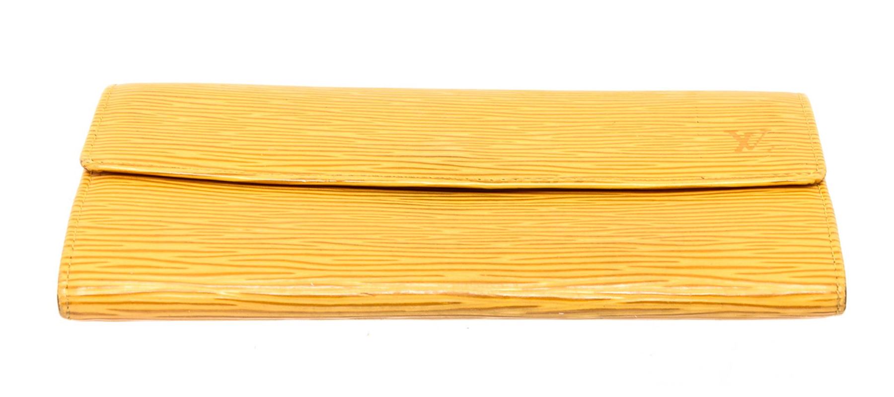 Yellow Epi leather Louis Vuitton Sarah wallet with gold-tone hardware, embossed logo at corner, purple Taiga leather lining, three interior compartments; center with zip closure, and snap closure at front flap.