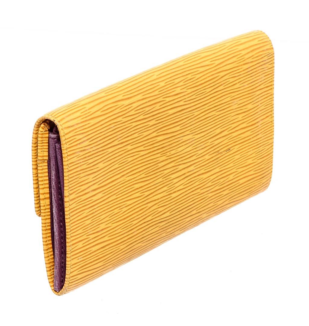 Yellow Epi leather Louis Vuitton Sarah wallet with gold-tone hardware, embossed logo at corner, purple Taiga leather lining, three interior compartments; center with zip closure, and snap closure at front flap.