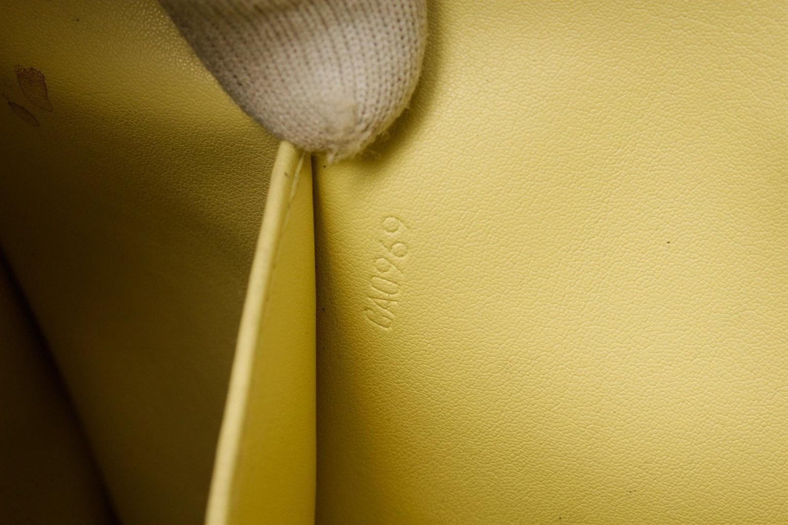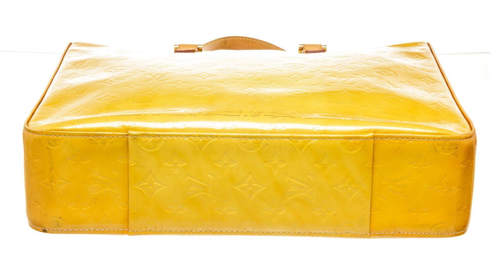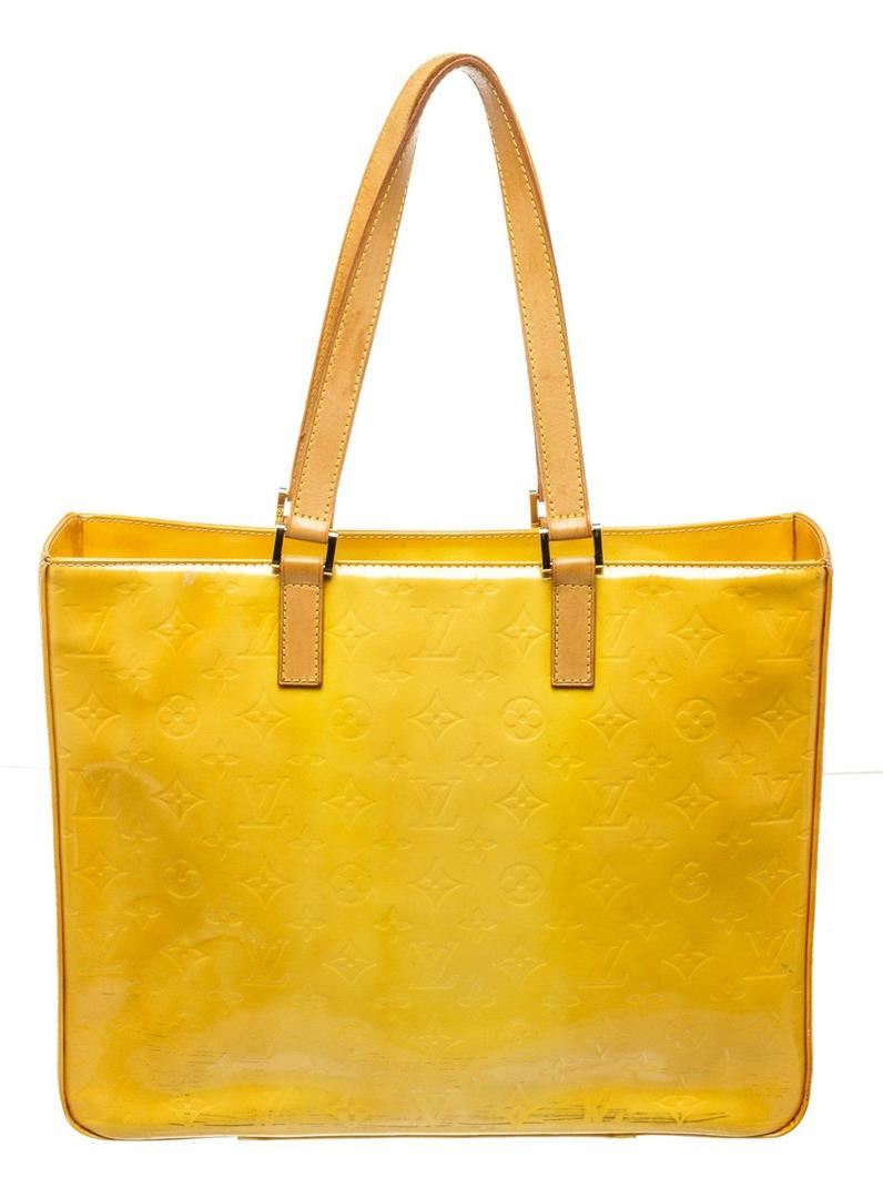 Louis Vuitton Yellow Houston Verni Tote Bag with vernis leather, gold-tone hardware, trim tan vachetta leather, interior slip pocket, dual top handle, shoulder strap and zipper closure.