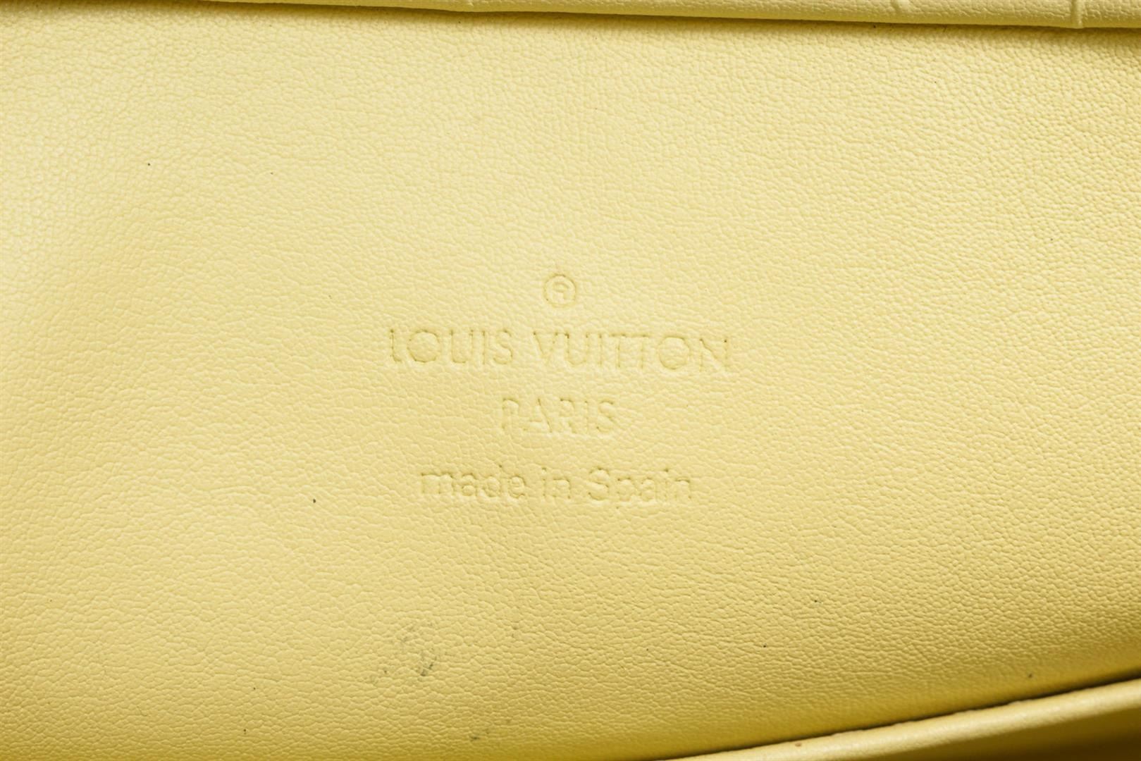 Louis Vuitton Yellow Houston Verni Tote Bag with vernis leather, gold-tone hardware, trim tan vachetta leather, interior slip pocket, dual top handle, shoulder strap and zipper closure.