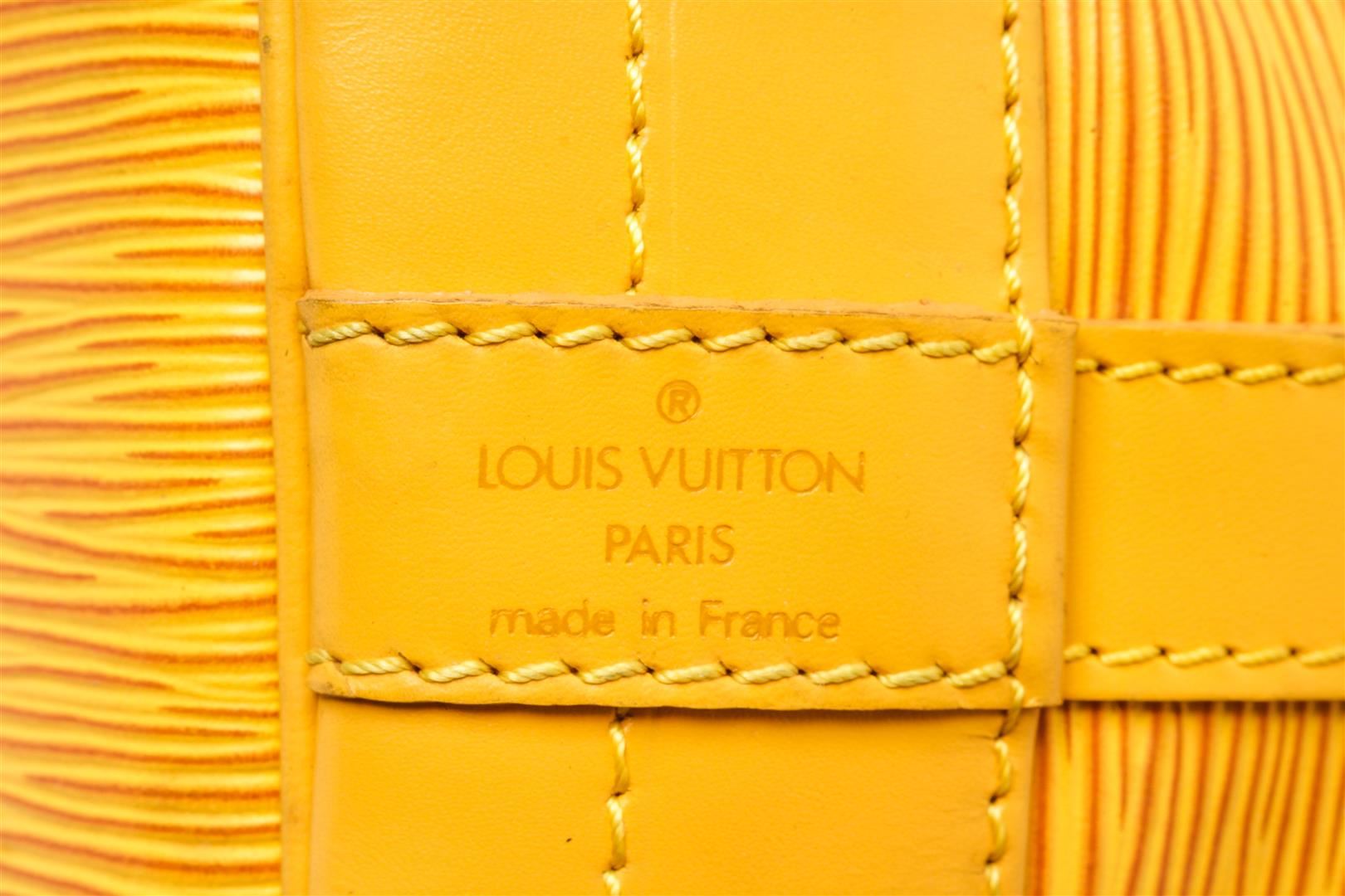 Louis Vuitton Yellow Leather Noe Shoulder Bag. All available information is listed in the description and shown in the photos. Louis Vuitton Yellow Leather Noe Shoulder Bag with yellow leather, brass hardware, single shoulder strap, alcantara lining, drawstring closure at top Height: 13" Width: 10.5" Depth: 7.5" Shoulder Strap Drop: 9" / Height: 33.02" Width: 26.67" Depth: 19.05" Shoulder Strap Drop: 22.86"