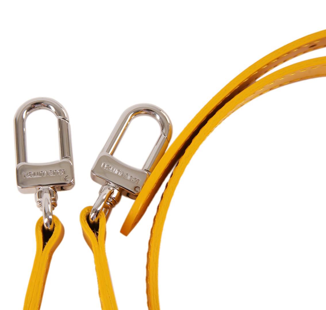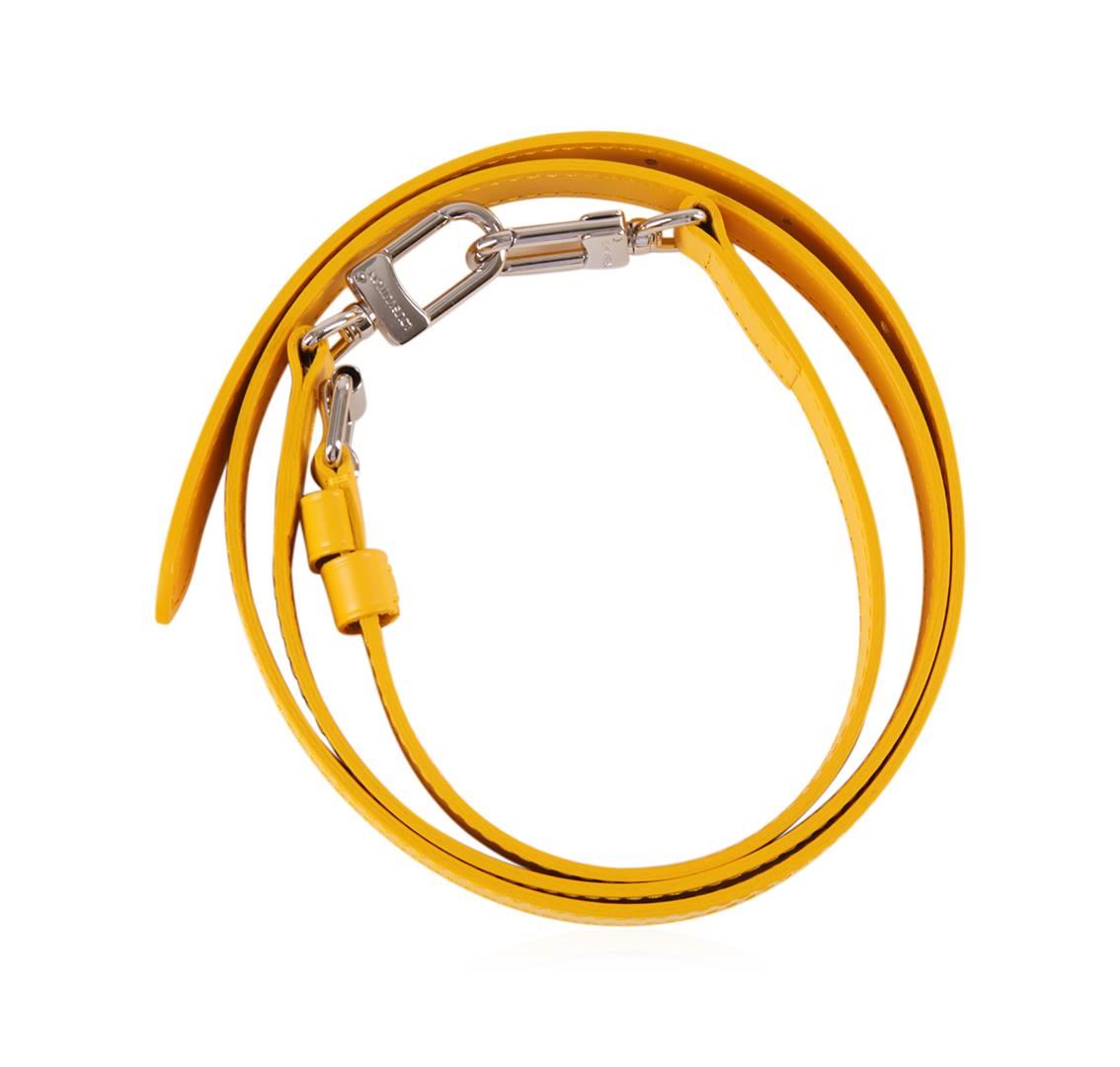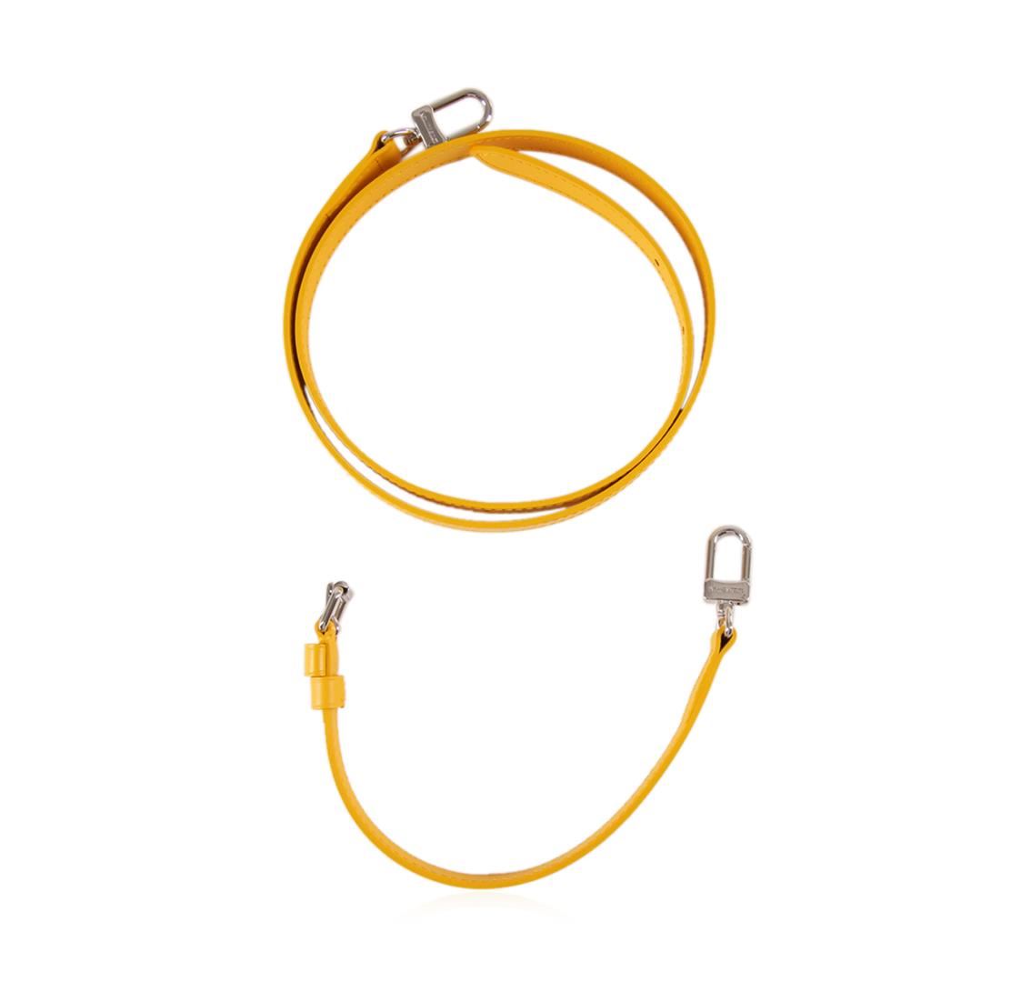One set of Louis Vuitton yellow leather replacement straps in good condition, measuring approximately 5/8 inches wide. The smaller strap measures approximately 13 inches long with clasps and the larger is adjustable with a total length of approximately 38.5 inches. Comes with a Louis Vuitton drawstring cover bag and box.