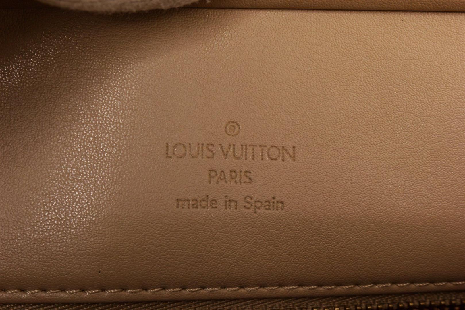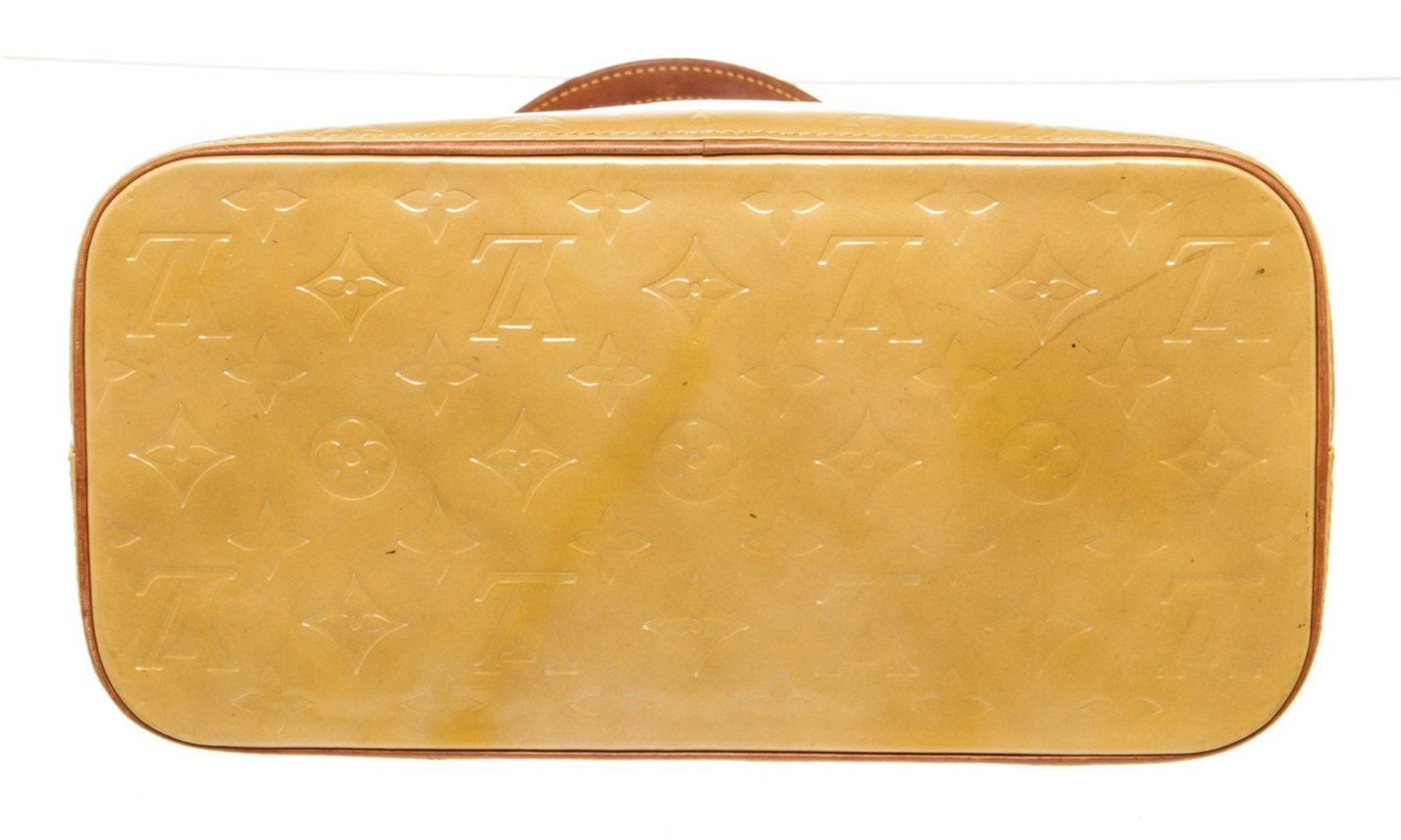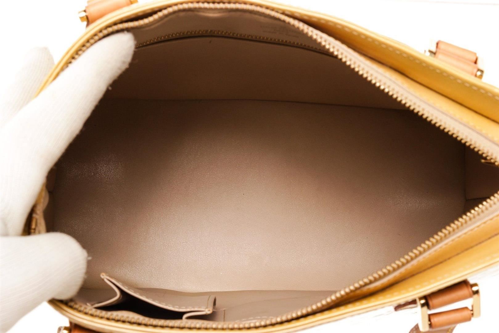 Louis Vuitton Yellow Monogram Canvas Houston Shoulder Bag vernis leather trimmed with tan leather and silver hardware. Top zipper closure opens to a black canvas lined interior that holds 1 zipped and 2 slit side pockets.